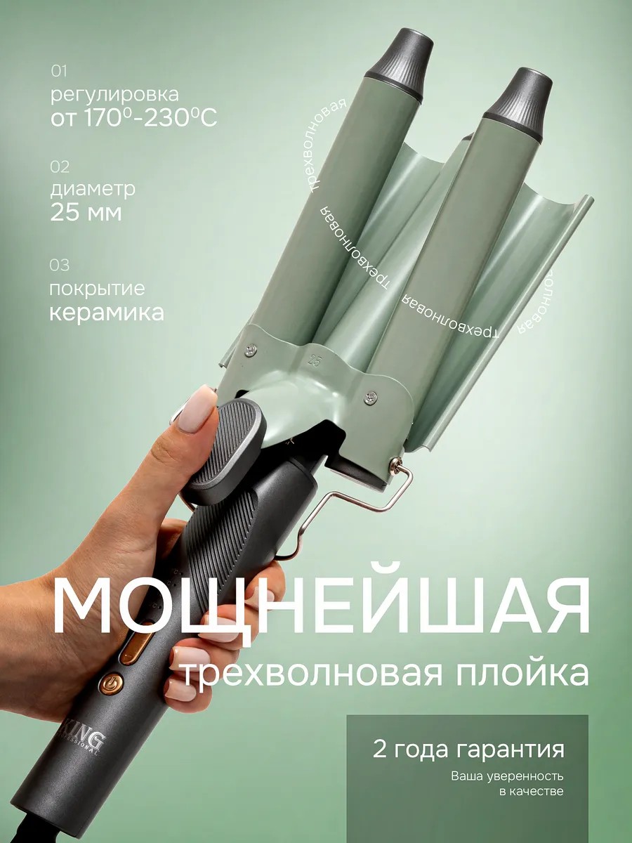 Плойка волна для завивки локонов King professional с керамическим покрытием подходит как для домашнего, так и для профессионального ухода, с лёгкостью создает незабываемый образ. Стайлер 3 в 1 предназначен для создания кудрей. Такая бытовая техника подходит для любого типа волос и имеет функцию регулирования температуры с индикатором. Профессиональная тройная плойка прекрасно дополнит набор для завивки. Щепцы трехволновые крупные имеют термозащитный наконечник, который обеспечивает защиту от ожогов и позволяет сделать завивку афрокудрей абсолютно безопасной. Благодаря функции ионизации, волосы становятся мягкими, шелковистыми и блестящими. Плойка гофре ( гафре) выполнена из прочных материалов , а керамическое покрытие не повреждает волосы. Прибор автоматически выключается через 60 минут, что делает его более безопасным. Перед использованием обязательна термозащита. Эргономичный и продуманный дизайн делает ее удобной в работе, она оснащена шнуром, который вращается на 360°, поэтому риск заломов сводиться к нулю, устраняет чрезмерную пушистость и не электризует волосы. Индикатор с настраиваемой температурой от 170°С до 230°С. Качественное покрытие равномерно прогревается по всей длине, обеспечивает гладкое скольжение и бережный уход, препятствует пересушиванию, сохраняет здоровье и дарит красоту. Подходит для использования в дорожных условиях, дома и даже в парикмахерской. Плойка афро ( 2 в 1 двойная) придаст объем, не допускает спутывания прядок. Идеальный подарок близким!