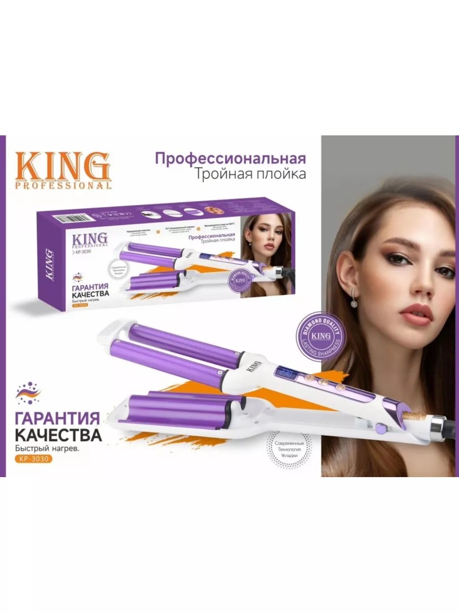 Тройная плойка для завивки волос от известного бренда техники для ухода за волосами — компании KING. Модель KP-3030 Triple barrel waver 19-диаметыр KP-3030 идеально подходит для создания знаменитых «голливудских волн» и других типов завивки. Все нагревающиеся поверхности устройства имеют керамическое покрытие пластины, что говорит в пользу долговечности и стойкости прибора. Кроме того, нагревательные элементы расположены равномерно во всех трех стволах плойки, благодаря чему все волосы накручиваются одинаково хорошо.