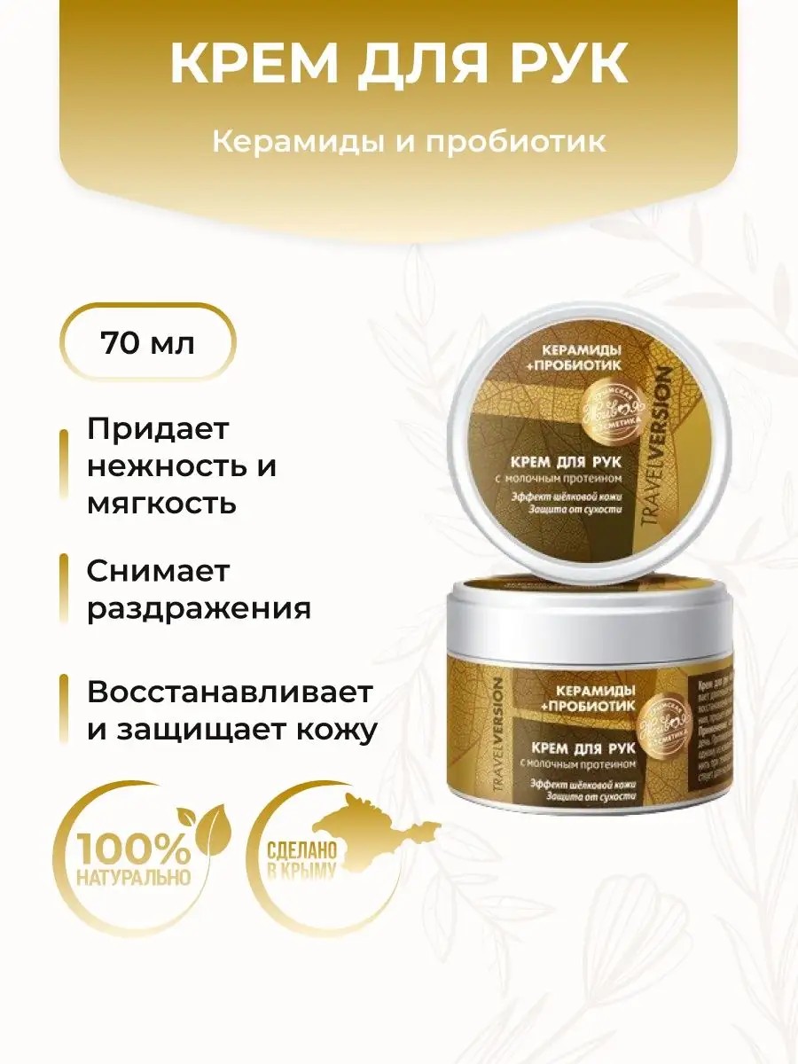 This cream provides long-lasting hydration, additional protection, and restoration of hand skin, relieves irritation and redness, and leaves it soft and supple. It comes in a mini size, perfect for travel or business trips, easily fitting in carry-on luggage without taking up much space. A ceramide complex restores, protects, and moisturizes the skin, strengthens its lipid barrier, has a softening effect, and soothes irritation. Phytofirm Biotic is a probiotic enzyme derived from soy extract, enriched with lactic acid and peptides. Stimulates the synthesis of components of the extracellular matrix of the skin, maintains its youth, increases elasticity, density and firmness. Milk protein restores and softens the skin, keeps it fresh, smooth and young, protects from the negative effects of the environment, promotes even pigmentation. Aloe juice deeply moisturizes the skin and prevents its dehydration, has a softening effect, soothes irritation, has a regenerating and healing effect. Ingredients: thermal water, emulsion wax, avocado oil, grape seed, arugula seed, glycerol monostearate, extracts of oats, yarrow, centella asiatica, St. John's wort, clover, ginkgo biloba, aloe juice, D-panthenol, alpha-lipoic acid, Phytofirm Biotic (probiotic enzyme), squalane, vitamin E, Ceramide Complex CLR (ceramide complex), elastin, milk Protein, lecithin, caffeine, nicotinamide, ascorbic acid, sodium ascorbate, sodium salicylate, citric acid, glycolic acid, lactic acid, sodium hyaluronate, preservative Euxyl 9010, perfume composition. Application: Apply a thin layer to cleansed skin 1-2 times a day. Contraindications: hypersensitivity to any of the components. Crimean natural hand cosmetics are an excellent gift for a friend.