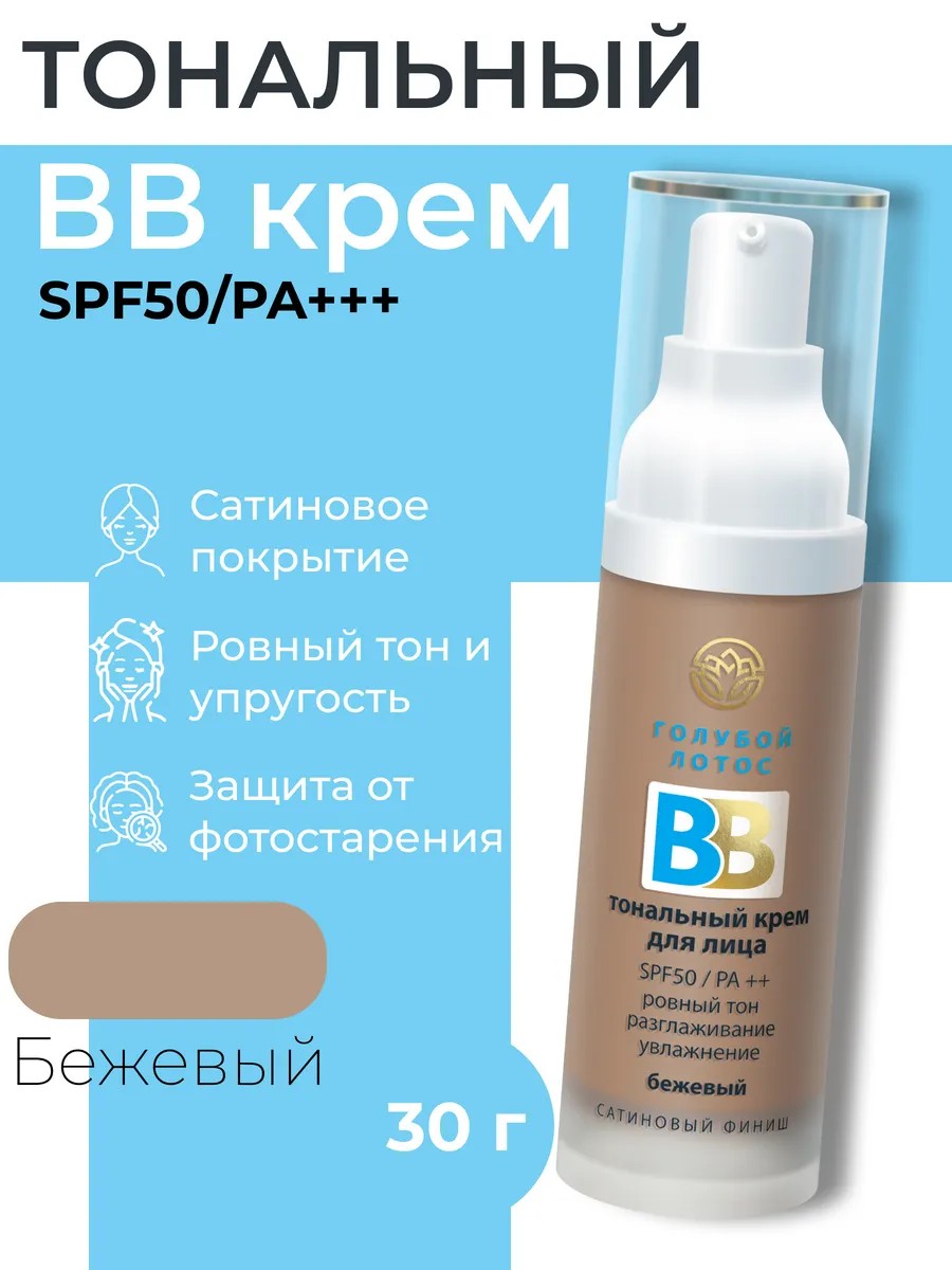 Тональный ВВ-крем «Голубой лотос» бежевый оттенка с высоким уровнем защиты от солнца SPF 50 для лица для базового макияжа . Тональный крем - это универсальное средство для создания идеального макияжа лица. Тоналка активно питает и увлажняет кожу, выравнивает ее тон и микрорельеф, создавая безупречное легкое покрытие без эффекта маски. Основа под макияж обладает матирующими свойствами, защищает от УФ-лучей и фотостарения, обеспечивает комплексный омолаживающий эффект, увлажнение и безупречный, ухоженный, свежий вид.