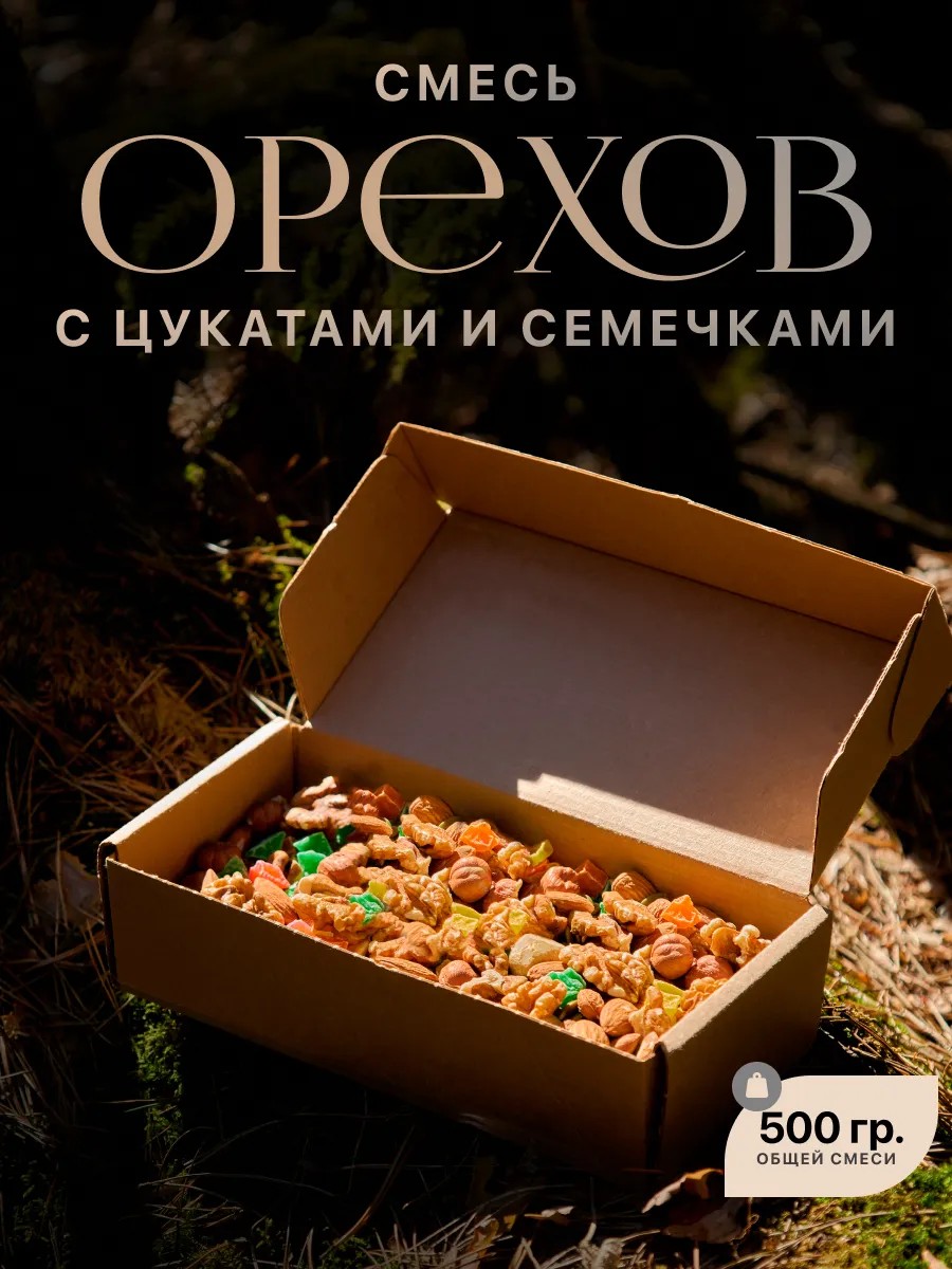 | Состав | кешью; миндаль; грецкий; фундук; цукаты; тыквенные семечки |
