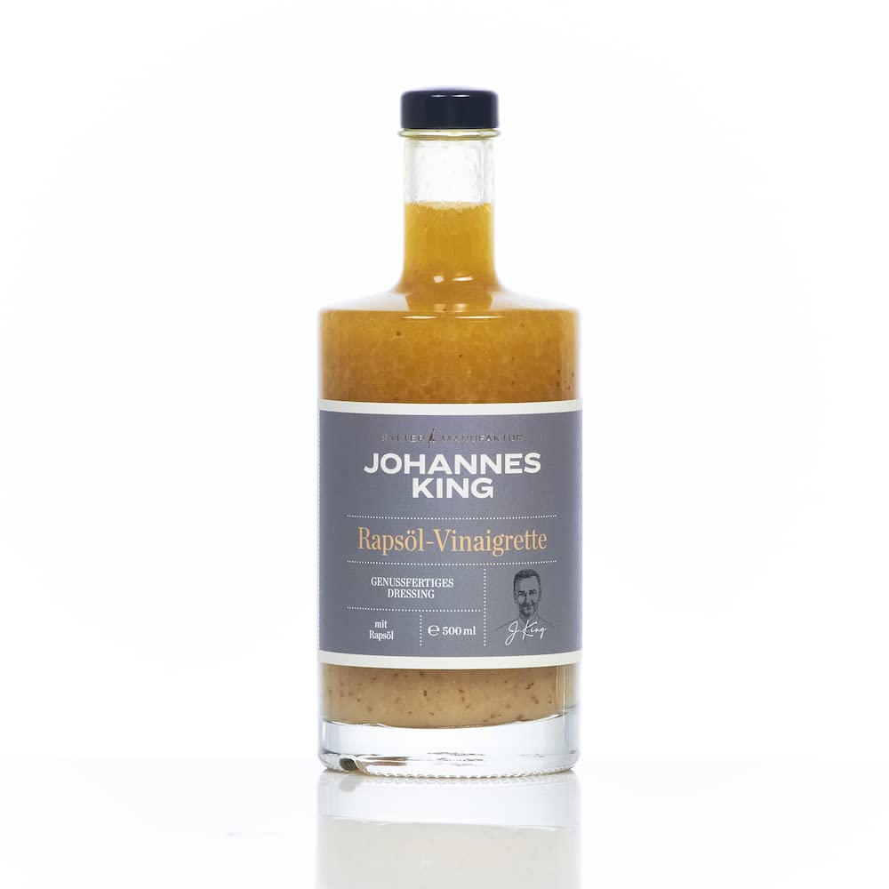 Kings rapeseed oil vinaigrette is a dream-for salad lovers and also for all other gourmets who like to refine their vegetable dishes uncomplicated and yet tasty!The fine dressing from the best Sylter rapeseed oil from the north beach and pure apple cider vinegar is wonderfully spicy in taste and after a short shake directly ready for use.So a perfectly seasoned vinaigrette dressing is always on hand!It is always a good idea to buy Vinaigrette and to have a tasty salad dressing at home for every opportunity.The Sylter Manufaktur's salad dressing vinaigrette is made by hand on the North Sea island according to Johannes King's recipe.For the aroma-rich rapeseed oil vinaigrette, a brew from apples, celery, carrots and shallots are first cooked.The vegetable stud is passed and combines with apple cider vinegar, lemon juice, some sea salt, black pepper and mustard powder into a fantastic vinegar-oil vinaigrette.King's rapeseed oil vinaigrette is particularly tasty with crisp leaf salads and vegetables, especially for potato dishes. Ingredients / ingredients Water, rapeseed oil, Chardonnayessig, Noilly Prat, shallots, apples, mushrooms, carrots, celery, fennel, mustard, sea salt, white peppercorns, laurel Instructions Shake well before eating and then close it.The vinegar-oil vinaigrette stays in the fridge for around four weeks after opening. More perfectly seasoned and already ready for serving after a short shake.Versatile to crunchy vegetables, leaf salads or potatoes.Made by hand from regional ingredients of the best quality.Unique recipe from the Sylt Manufaktur Johannes King. Kings Rapsöl-Vinaigrette ist ein Traum – für Salatliebhaber und auch für alle anderen Feinschmecker, die ihre Gemüsegerichte gerne unkompliziert und doch schmackhaft veredeln! Das feine Dressing aus bestem Sylter Rapsöl vom Nordstrand und reinem Apfelessig ist wunderbar würzig im Geschmack und nach kurzem Schütteln direkt einsatzbereit. So ist immer ein perfekt abgeschmecktes Vinaigrette-Dressing zur Hand! Es ist immer eine gute Idee, Vinaigrette fertig zu kaufen und so für jede Gelegenheit ein schmackhaftes Salatdressing zuhause zu haben. Die Salatdressing-Vinaigrette der Sylter Manufaktur wird auf der Nordseeinsel nach Johannes Kings Rezept von Hand hergestellt und abgefüllt. Für die aromenreiche Rapsöl-Vinaigrette wird zunächst ein Sud aus unter anderem Äpfeln, Sellerie, Karotten und Schalotten gekocht. Der Gemüsesud wird passiert und vereint sich mit Apfelessig, Zitronensaft, etwas Meersalz, schwarzem Pfeffer und Senfpulver zu einer traumhaften Essig-Öl-Vinaigrette. Besonders lecker ist Kings Rapsöl-Vinaigrette zu knackigen Blattsalaten und Gemüse, insbesondere zu Kartoffelgerichten. INHALTSSTOFFE / ZUTATEN Wasser, Rapsöl, Chardonnayessig, Noilly Prat, Schalotten, Äpfel, Champignons, Möhren, Staudensellerie, Fenchel, Senf, Meersalz, weiße Pfefferkörner, Lorbeer GEBRAUCHSANWEISUNG Vor dem Verzehr gut schütteln und danach verschließen. Die Essig-Öl-Vinaigrette hält sich nach dem Öffnen rund vier Wochen im Kühlschrank. Mehrperfekt gewürzt und bereits nach kurzem Schütteln servierfertig. vielseitig einsetzbar zu knackigem Gemüse, Blattsalaten oder Kartoffeln. hergestellt von Hand aus regionalen Zutaten bester Qualität. einzigartige Rezeptur aus der Sylter Manufaktur Johannes King.Kings Rapsöl-Vinaigrette 500 ml