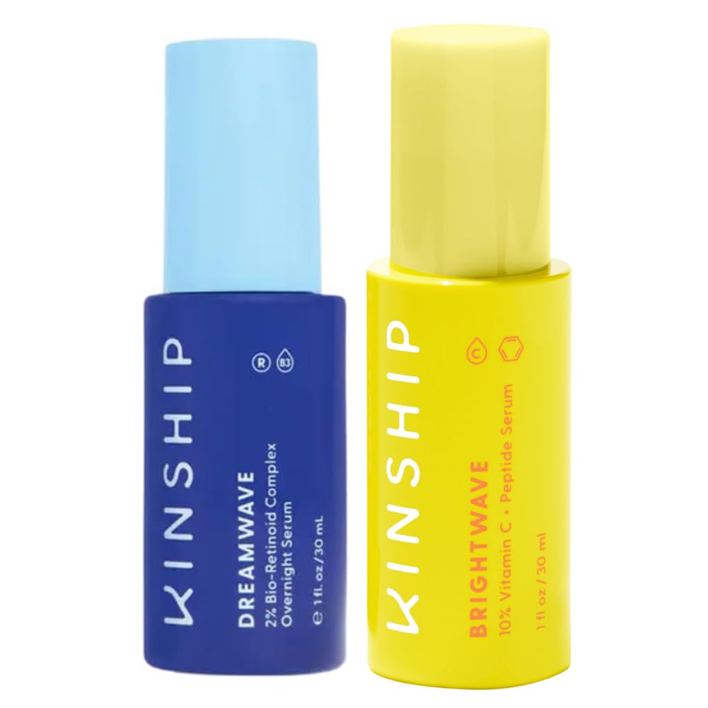 Combining the Kinship Dreamwave 2 Bio-Retinoid Overnight Renewal Serum and Kinship Brightwave 10 Vitamin C Peptide Serum, this pair targets fine lines, wrinkles, and discoloration for a radiant, youthful complexion. Ideal for sensitive skin, these vegan, cruelty-free formulas strengthen, hydrate, and firm while brightening and protecting against future damage. Experience powerful, gentle, and sustainable skincare for healthy, rejuvenated skin.PROVEN RESULTS – Kinship Brightwave is the winner of a 2023 People's Beauty Award Allure Best of Beauty: Clean Beauty Award! In a 30-day independent clinical and consumer study 100 said their skin appears brighter dark spots have visibly reduced within 14 days, 96 said skin looks and feels more hydrated, 94 said blemish marks have visibly reduced, 85 said fine lines have softened. Reveal visibly brighter, smoother, and rejuvenated skin with Kinship Brightwave!. 10 VITAMIN C FOR SENSITIVE SKIN – Kinship Brightwave 10 Vitamin C Peptide Serum is clinically formulated to help brighten, fade dark spots, firm, reduce the appearance of fine lines and wrinkles in as little as 14 days. It's fat soluble, easily absorbable, and up to 50x more powerful than traditional Vitamin C. Its potent and highly stable formula has a luxurious creamy texture that contains vegan collagen peptides and red algae that hydrate, protect, and firm your skin. BRIGHTEN REDUCE DISCOLORATION - Formulated with Tranexamic Acid (TXA), a safe and effective alternative to hydroquinone, our serum brightens skin and helps prevent discoloration from sun damage (when paired with daily sunscreen) and post-acne scars blemishes. 90 of participants said skin tone appears more even, bright healthy after a 4 week trial. DESIGNED FOR SENSITIVE SKIN - Experience the power of advanced bio-retinoid treatment designed for sensitive skin to improve the look of fine lines wrinkles, firm and diminish sun damage while strengthening the skin barrier. Delivers retinol results without the irritation or instability of traditional retinol. Powerful results, yet gentle on sensitive skin. ANTI-AGING DUO - Combining the Kinship Dreamwave 2 Bio-Retinoid Overnight Renewal Serum and Kinship Brightwave 10 Vitamin C Peptide Serum, this pair targets fine lines, wrinkles, and discoloration for a radiant, youthful complexion. Ideal for sensitive skin, these vegan, cruelty-free formulas strengthen, hydrate, and firm while brightening and protecting against future damage. Experience powerful, gentle, and sustainable skincare for healthy, rejuvenated skin.