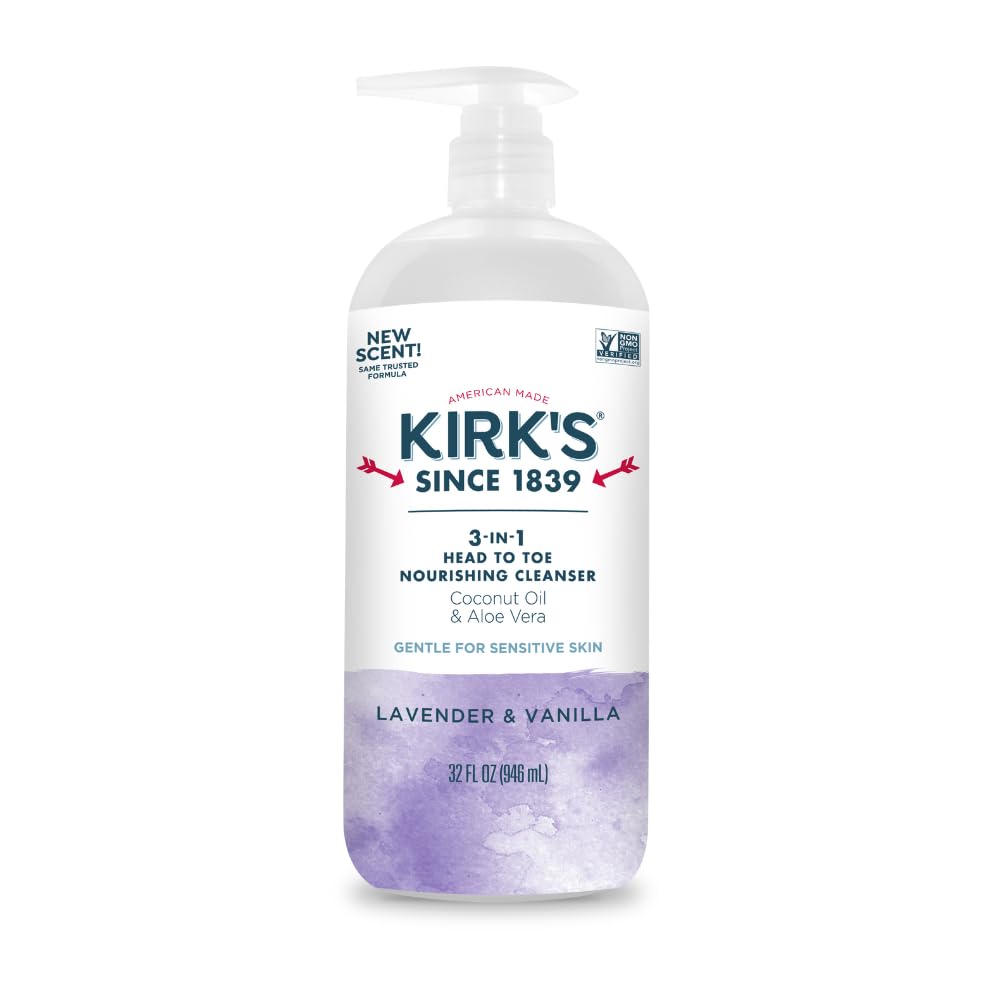 WOMEN OWNED Kirk's is owned and operated by two sisters turned CEO-moms and made in America. Our family and its employees stand behind the quality of our products and believe in our traditions. KIRK'S is the only coconut castile soap brand that has been continually made since 1839. We use carefully sourced ingredients for health-conscious families who want every-day, high-quality cleansing products – a clean you can feel great about from head to toe and throughout your home!. LAVENDER VANILLA light and soothing scent which is crafted with a lavender and vanilla oil blend?. OUR INGREDIENTS Enhanced with premium coconut oil and soothing aloe vera. Designed to be hydrating and moisturizing, turn your personal care routine into one that works for the whole family !. SENSITIVE SKIN FRIENDLY Our 3 in 1 is clinically tested, safe for sensitive skin. Free of Sulfates, Parabens, Phthalates, EDTA, Artificial Fragrance, Colorants, Gluten, Non-GMO project verified and Vegan. Kirk's Nourishing Cleanser is great for the whole family! Sold in a convenient 32 oz. pump bottle. 3 in 1 NOURISHING CLEANSER Simplify your daily routine with our all-in-one shampoo, body wash, and bath soap! Our gentle and creamy lather leaves skin soft and healthy. Enjoy head to toe moisturizing with our antioxidant-rich coconut oil soap.?.