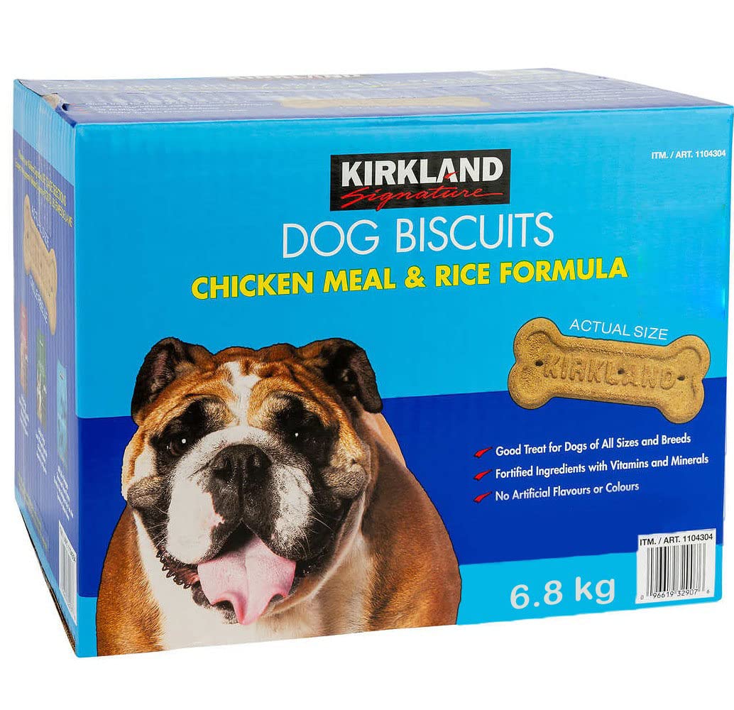 Kirkland Signature dog biscuits chicken meal and rice formula for dogs. This premium chicken meal rice formula crunchy provides a texture that promotes clean teeth!.Number of items: 1.0. Good treat for dogs of all sizes and breeds. No artificial flavors or colors. Fortified ingredients with vitamins Minerals.