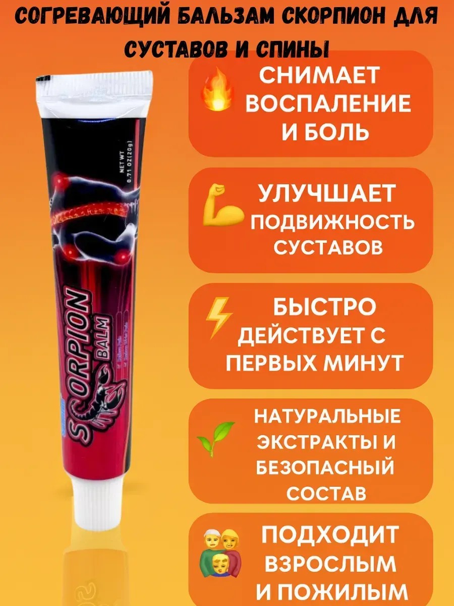 Купить мазь от боли в суставах и спине Scorpion Balm стоит каждому, кто ищет надёжное решение против воспаления и усталости. Натуральные компоненты (камфора, ментол, экстракты трав) обеспечивают безопасное и эффективное воздействие. Крем для снятия боли быстро впитывается, не оставляет жирных следов и начинает действовать уже через несколько минут после нанесения.