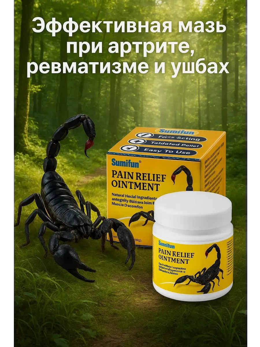 Мазь для суставов и мышц Сумифан — это не просто обезболивающая мазь, а настоящее средство для восстановления подвижности и облегчения жизни. Благодаря натуральным травяным компонентам и экстракту скорпиона мазь оказывает анальгезирующее и противовоспалительное воздействие, снимает отёчность и ускоряет регенерацию тканей.