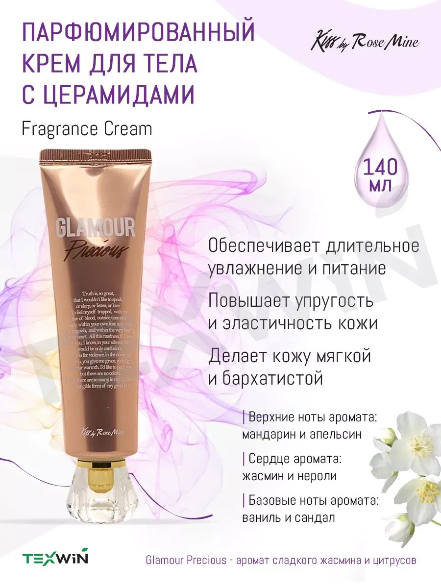Парфюмированный крем для тела Kiss by Rosemine Fragrance Cream - Glamour Precious обеспечивает длительное увлажнение и питают кожу, устраняет сухость и предотвращает появление шелушений, смягчает огрубевшие участки кожи. Средство повышает упругость и эластичность кожи, делает ее мягкой и бархатистой, разглаживает рельеф. Восстанавливает липидный барьер и способствует удержанию влаги внутри клеток.