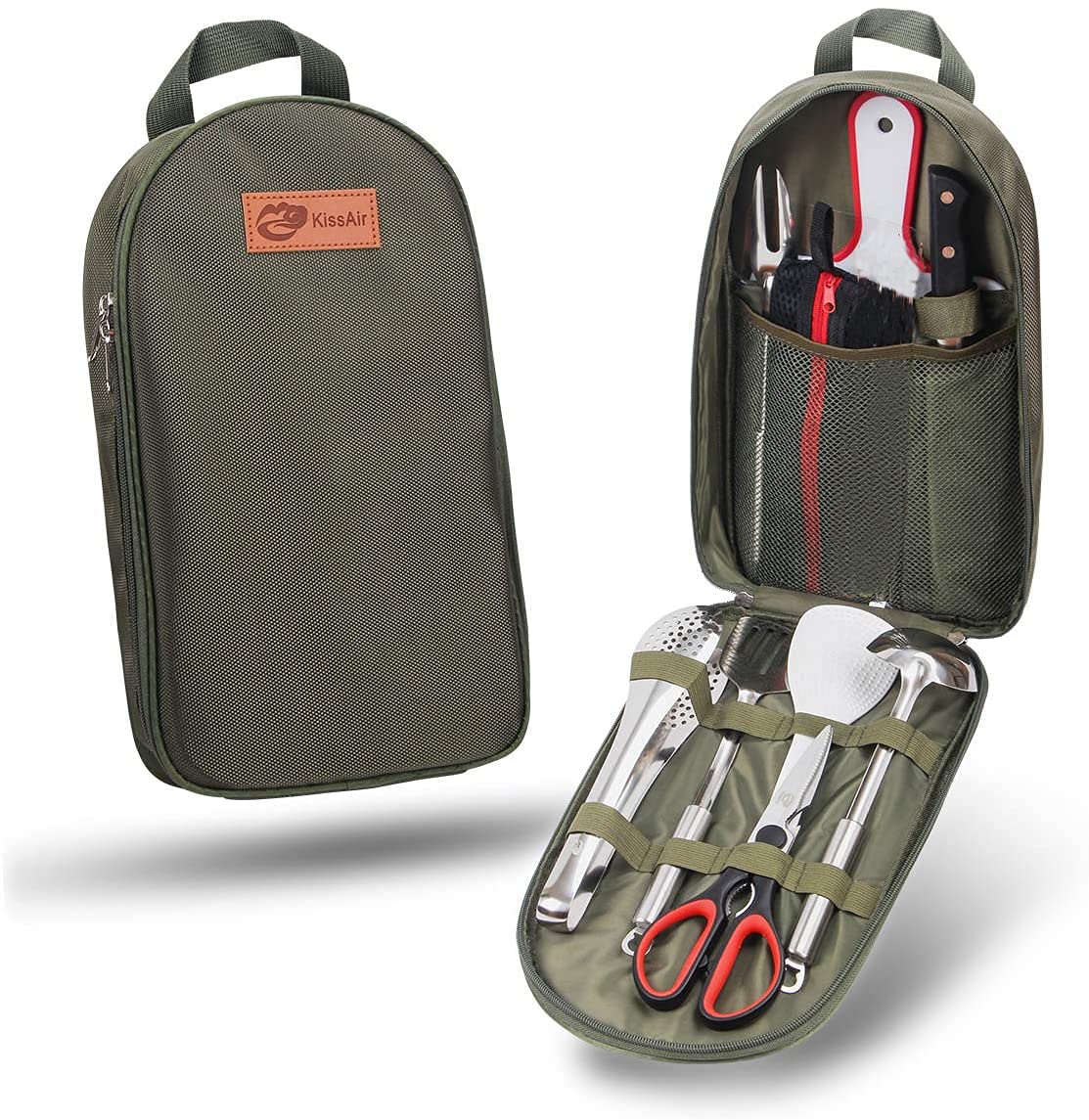 A WOW GIFT for weddings, Father’s Day, Mother’s Day, birthdays, housewarming, high school graduation, college graduation, college dorm, and Christmas. DURABLE AND STYLISH fabric made of woven cotton keeps the utensils safe during travel and use while the high quality dishwasher safe stainless steel utensils will keep their shape and hold up well. INDOOR AND OUTOOR--use for camping, hiking, travel, picnics, sporting events, boating, office break room, festivals, concerts, road trips, weddings, catering, car camping, backpacking, family reunions, tail gating, keep in your car so you're ready for anything-SO MANY USES!. DURABLE: This kit is made from high quality woven cotton with a water-resistant exterior keeping all your camping cooking utensils clean, dry, dust and rust-free. Every utensil fits nicely in a strap or pocket, so you don’t have to worry about items being damaged or scratched even after a lengthy trip or a long time in storage. ALL-IN-ONE: This set includes: 6*Flatware (2*knife,2*fork,2*spoon),Flatware Storage Pouch, Spatula, Serving Spoon, Serving Fork, Chef Knife with Sheath, Scissors with Sheath,Rice Paddle, Tongs,Cutting Board & Travel Bag.Is Dishwasher Safe: Yes. Included Components: Storage Bag. Handle Material: Stainless Steel. Material: Stainless Steel. Brand: KissAir. Date First Available: November 9, 2019. Best Sellers Rank: #61,561 in Sports & Outdoors. Customer Reviews: 4.5 out of 5 stars 160 ratings 4.5 out of 5 stars. : B0817WQR8M. Manufacturer: KissAir. Item Weight: 2.48 pounds. Package Dimensions: 14.17 x 9.92 x 3.23 inches.