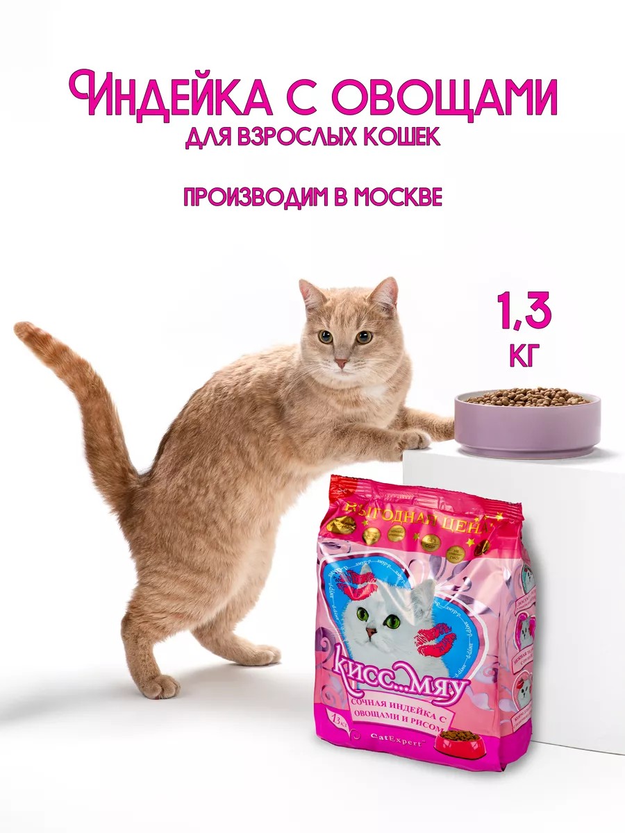 Полнорационный сбалансированный корм Кисс…Мяу Сочная индейка с овощами и рисом для взрослых кошек старше 1 года.Корм Кисс…Мяу Сочная индейка с овощами и рисом — это натуральный сбалансированный сухой корм для взрослых кошек от 1 года. С ним питомец получит всё необходимое для здоровья, активности и полноценной жизни. Сушеная клюква, метионин и баланс минералов в составе корма поддерживают здоровье мочевыделительной системы. Таурин вместе с комплексом витаминов, минералов и антиоксидантов укрепляют иммунитет, а клетчатка и пробиотики поддерживают пищеварительную систему. 100% натуральный и полезный состав. Все ингредиенты прошли ветеринарный контроль. Нет искусственных красителей и вкусоароматических добавок. Подходит для ежедневного кормления. Курица,говядина, индейка, лосось и яйца — источники легкоусвояемых белков с высокой питательной ценностью. Цельные злаки и картофель содержат углеводы, которые помогут питомцу быть активным и энергичным. Куриный жир, подсолнечное масло, рыбий жир - источники жирорастворимых витаминов, Омега-3 и Омега-6. Овощи и семена — клетчатка для здорового пищеварения. Экстракт клюквы, метионин и баланс минералов поддерживают здоровье мочевыделительной системы. Таурин помогает поддерживать здоровье сердца и глаз, укрепляет иммунитет. Ферментный экстракт BACILLUS SUBTILIS - пробиотик для поддержания микрофлоры кишечника.