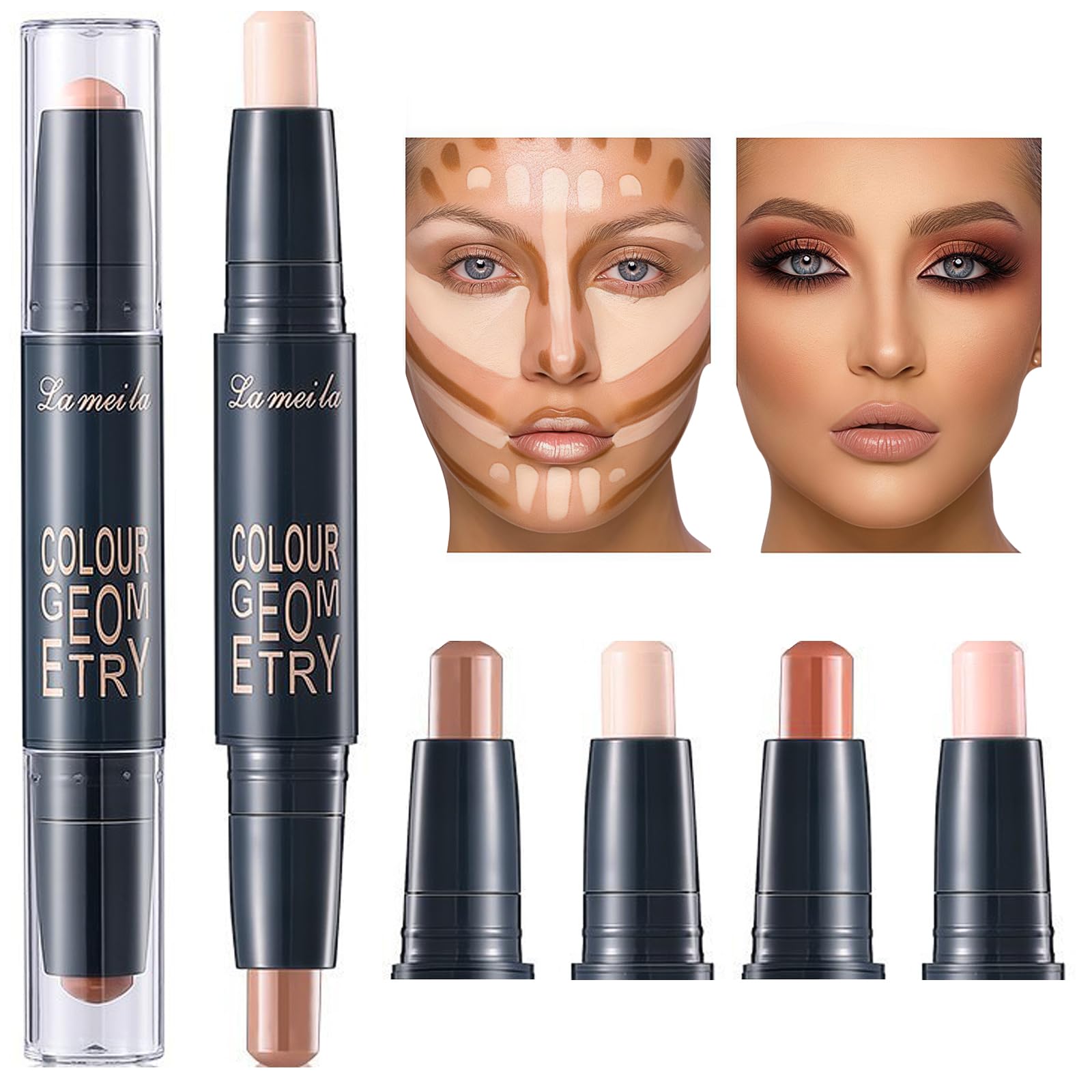 Beautiful gift and multiple occasions: With perfect packaging, it's lightweight and portable. Ideal for travel, touch-ups anytime, and achieving ultimate radiance. Suitable for various occasions, perfect for personal use or as a gift for loved ones, family, and friends for Valentine's Day, birthdays, Mother's Day, and other holidays! Waterproof and long-lasting: The smooth, lightweight powder formula won't clog pores and allows skin to breathe. The highlighter's unique, waterproof formula helps keep the pigment in place and ensures lasting radiance throughout the day. Very easy to apply. Gentle and natural formula: Our contour pencil is made with natural, non-toxic ingredients that won't cause irritation, even on sensitive skin. At the end of the day, simply remove it with makeup remover or cleanser. Highlight and shade: Four pencil colors offer a multi-dimensional look. Gently sweep across your cheekbones, brow bones, temples, forehead, chin, or anywhere you need light or shadow. A perfect balance of cool and warm tones to bring life and radiance to your makeup. This 2-in-1 cream contour and highlighter set features a silky-smooth, lightweight formula that blends seamlessly into the skin. The cream bronzer's incredibly creamy and soft texture combines the properties of a powder and a butter bronzer, smoothing the complexion and giving a beautiful bronzed finish. This contour and highlighter kit instantly creates the illusion of a sculpted and defined face.Beau cadeau et occasions multiples : avec un emballage parfait, léger et portable. Idéal pour les déplacements, pour retoucher à tout moment et obtenir un éclat ultime. Convient à différentes occasions, idéal pour un usage personnel ou comme cadeau pour les amoureux, la famille et les amis à la Saint-Valentin, pour un anniversaire, la fête des mères et d'autres fêtes !. Résistant à l'eau et longue tenue : la formule poudre lisse et légère ne bouche pas les pores et laisse la peau respirer. La formule unique et résistante à l'eau de l'enlumineur aide à maintenir le pigment en place et assure une brillance durable tout au long de la journée. Très facile à appliquer. Formule douce et naturelle : notre crayon contour est composé d'ingrédients naturels et non toxiques qui ne provoquent aucune irritation, même sur les peaux sensibles. À la fin de la journée, il suffit de le retirer avec un démaquillant ou un nettoyant. Éclaircir et ombrer : 4 couleurs de crayons offrent un look multidimensionnel. Passez délicatement sur les pommettes, les arcades sourcilières, les tempes, le front, le menton ou partout où vous avez besoin de lumière ou d'ombre. Équilibre parfait entre des tons froids et chauds pour donner vie et lumière à votre maquillage. 2 pièces 2 en 1 crayon contour crème pour le maquillage : le crayon contour et enlumineur a une formule soyeuse et légère qui s'intègre facilement à la peau ! Crayon bronzant crème - Sa texture incroyablement crémeuse et douce combine les propriétés d'une poudre et d'un bronzant beurre lisse le teint et donne un magnifique fini bronzé. Le kit de contouring et d'enlumineur de maquillage crée en un clin d'œil l'illusion d'un visage sculpté et défini.Kit 2 Sticks Maquillage Femme Contouring - Nuancier 4 Tons Sculpting Visage, Correction Imperfections et Tenue Résistante