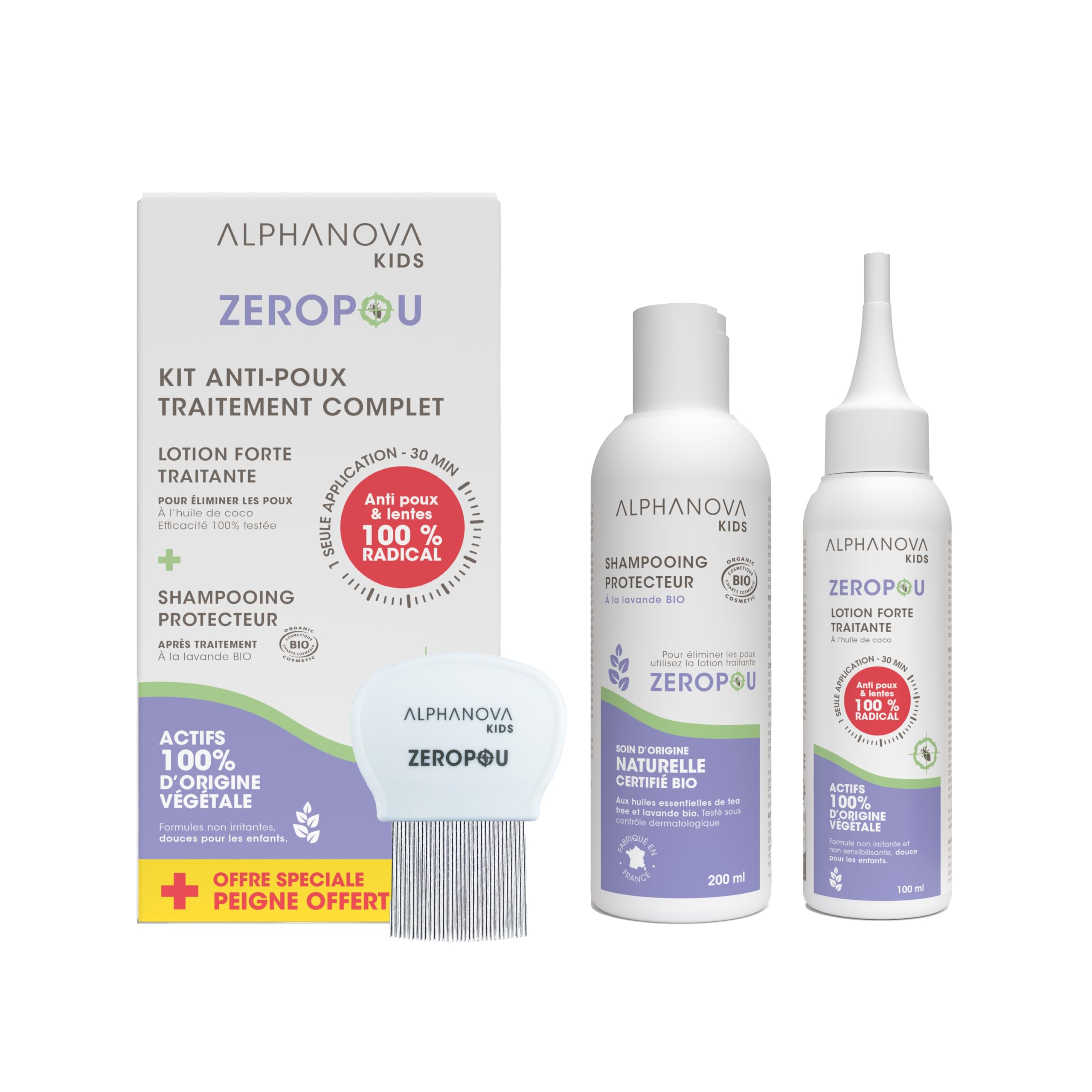 MADE IN FRANCE: The Alphanova KIDS ZEROPOU Anti-Lice Kit is made in France to guarantee product safety and traceability. Recycled and recyclable packaging. NATURALLY DERIVED INGREDIENTS: Formulated with 99 naturally derived ingredients (excluding the anti-lice lotion, a Class 1 device). Formulas enriched with coconut oil, plant esters, and vitamin E. Fragrance-free, silicone-free, chemical insecticide-free, non-irritating, and non-sensitizing. WHY CHOOSE THE ZEROPOU KIT? Proven effectiveness: Eliminates lice and nits in a record time of 30 minutes. Comfortable to use: The anti-lice comb ensures a smooth glide without pulling hair. Safe: Free of harmful chemicals, it is suitable for the whole family. COMPLETE ANTI-LICE KIT: The Alphanova KIDS ZEROPOU Complete Anti-Lice Kit eliminates 100 of lice and nits in a single 30-minute application. It contains one 100ml anti-lice nit treatment lotion and one 200ml protective shampoo with organic lavender. FREE GIFT: One 32-tooth micro-grooved stainless steel comb to prevent hair pulling.