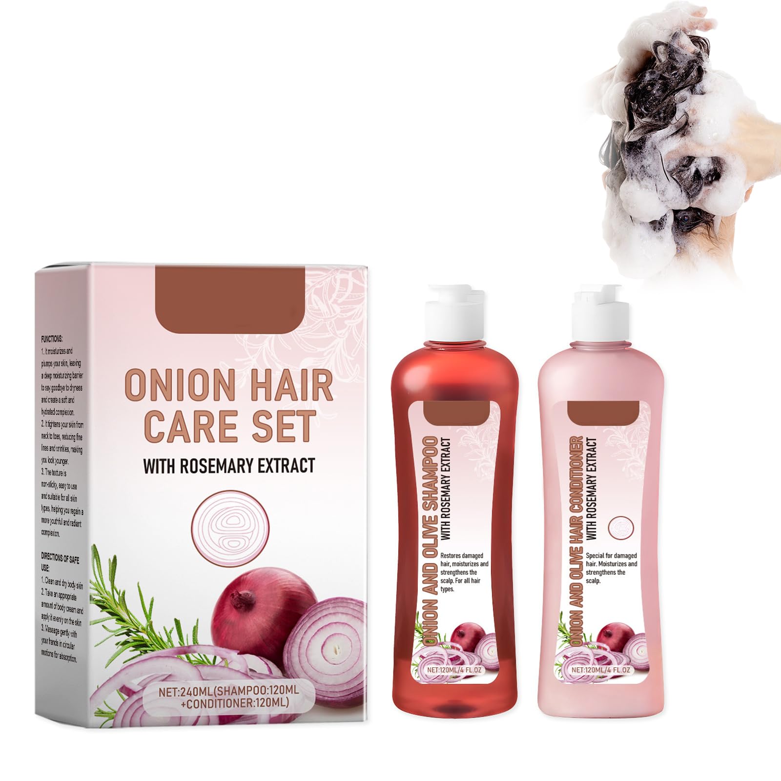 Suitable for all hair types: This shampoo set is suitable for all hair types, from thick to normal, as well as straight and curly hair. Regular use not only restores the hair's natural shine but also protects it. Natural nutrients: This shampoo contains natural ingredients such as onion extract and biotin, which have a restructuring and moisturizing effect on damaged hair, ensuring that the scalp is not damaged while promoting hair growth, preventing breakage and hair loss, and giving hair a natural shine. Improved hair growth: The combination of onion and rosemary improves blood circulation, provides important nutrients for hair follicles, and allows hair to grow faster, stronger, and healthier. Biotin helps improve hair health, adding shine and softness. Moisturizing and nourishing: Our onion and biotin hair care products can nourish and soften your hair. Shampoos that prevent hair loss can hydrate, nourish, and soften your hair, effectively regenerate and moisturize damaged hair, and restore its natural shine. Hair Care Set: Our shampoo contains highly effective ingredients that not only protect your hair but also nourish it with antioxidant-rich moisturizing agents. Say goodbye to hair loss and enjoy this natural hair care solution to make curly hair beautiful and vibrant.Convient à tous les types de cheveux : cet ensemble de shampooing convient à tous les types de cheveux, épais à normaux, ainsi qu'aux cheveux lisses et bouclés. Une utilisation régulière restaure non seulement l'éclat naturel des cheveux, mais les protège également. Nutriments naturels : ce shampooing contient des ingrédients naturels tels que l'extrait d'oignon et la biotine, qui ont un effet restructurant et hydratant sur les cheveux abîmés, garantissent que le cuir chevelu n'est pas endommagé tout en favorisant la croissance des cheveux, prévient la casse des cheveux, prévient la chute des cheveux et donne aux cheveux une brillance naturelle. Amélioration de la croissance des cheveux : la combinaison d'oignons et de romarin améliore la circulation sanguine, fournit des nutriments importants pour les follicules pileux et permet aux cheveux de pousser plus rapidement, plus forts et plus sains. La biotine aide à améliorer la santé des cheveux, apporte brillance et douceur. Hydratant et nourrissant : nos soins capillaires à l'oignon et à la biotine peuvent nourrir et adoucir vos cheveux. Les shampooings qui préviennent la chute des cheveux peuvent hydrater, nourrir et adoucir vos cheveux, régénérer et hydrater efficacement les cheveux abîmés et restaurer leur brillance naturelle. Ensemble de soins capillaires : Notre shampooing contient des ingrédients hautement efficaces qui non seulement protègent vos cheveux, mais les nourrissent également avec des agents hydratants riches en antioxydants. Dites adieu à la perte de cheveux et profitez de cette solution de soin naturel pour cheveux pour rendre les cheveux bouclés beaux et vivants.Kit de shampooing et de traitement à l'oignon, biotine et romarin, anti-chute de cheveux, hydratant, pour tous les types de cheveux