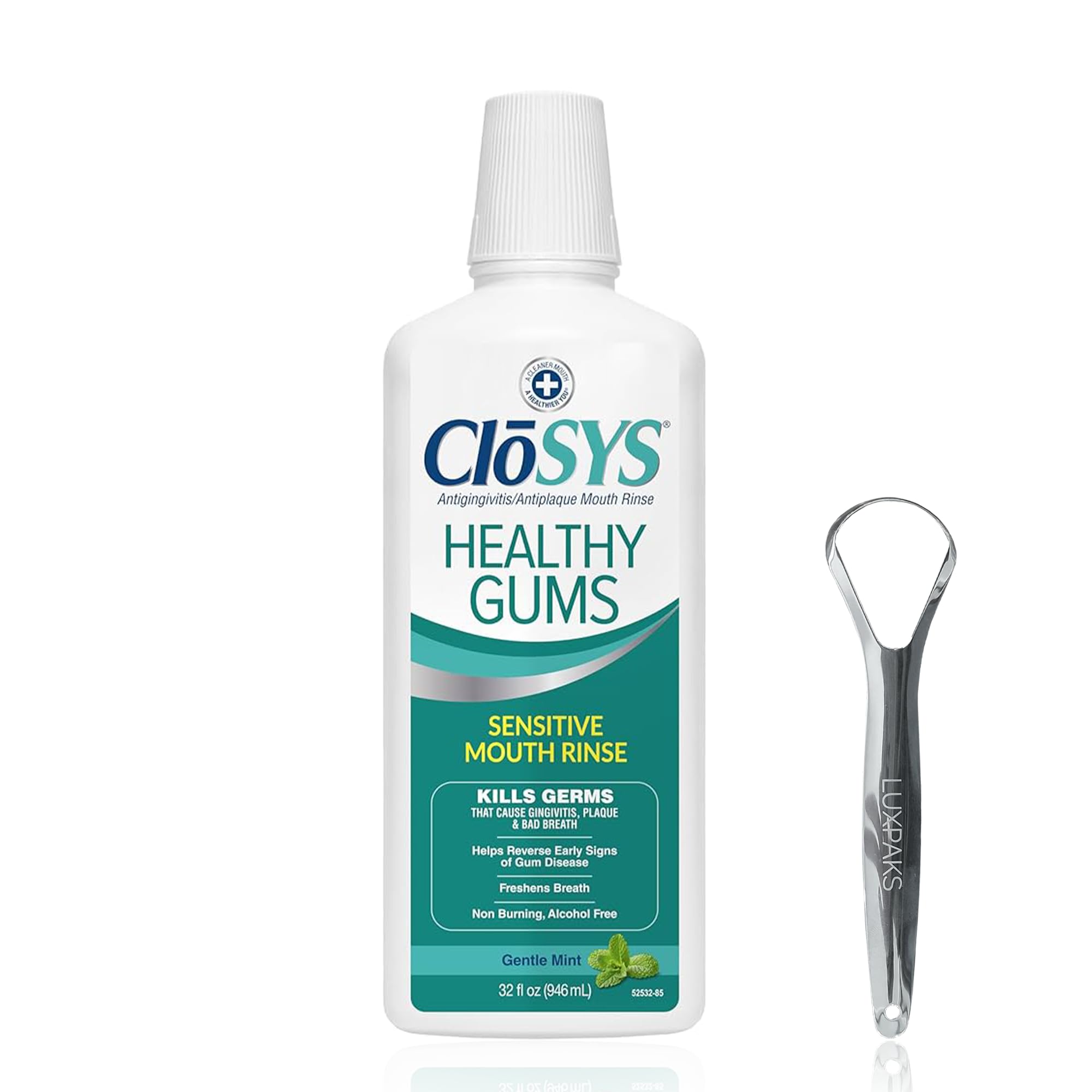 Kit de soins bucco-dentaires : contient un bain de bouche CloSIS Healthy Gums 947,2 g avec gratte-langue LUXPAKS