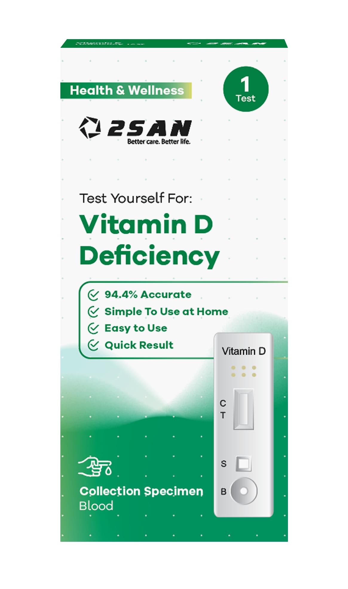 : The 2SAN Vitamin D Test Kit provides an easy and reliable way to check your vitamin D levels from the comfort of your home. Designed for simple self-testing, this kit includes a quick and painless blood sample collection process, ensuring a hassle-free experience. Once your sample is sent to the certified laboratory, you will receive fast and accurate results to help detect vitamin D deficiency and maintain optimal health. Ideal for individuals who want to easily monitor their vitamin D status, this single-use kit offers a simple solution for proactive health management. Disclaimer: Please note that the information provided on this product page is for informational purposes only and should not be considered medical advice. The accuracy and reliability of results may vary and can be influenced by various factors, including human error. It is essential to carefully follow the instructions provided with the product and consult a qualified healthcare professional for a complete assessment of your health. Always read and follow the instructions carefully before using the product.Take control of your health: Empower yourself by monitoring your vitamin D levels and making informed decisions to maintain your overall well-being. Fast, accurate results: Get quick, reliable results to determine if your vitamin D levels are within the optimal range. Winter support: As sun exposure decreases in winter, vitamin D deficiency becomes more common. Stay proactive with regular testing. Essential nutrient assessment: Ensure your body is getting enough vitamin D, which is crucial for immune function, bone health, mood, and energy levels. Convenient testing: offers a hassle-free solution for testing your vitamin D levels at home.Description du produit Le kit de test de vitamine D 2SAN fournit un moyen facile et fiable de vérifier vos niveaux de vitamine D depuis le confort de votre maison. Conçu pour un auto-test simple, ce kit comprend un processus de prélèvement d'échantillons de sang rapide et indolore, assurant une expérience sans tracas. Une fois votre échantillon envoyé au laboratoire certifié, vous recevrez des résultats rapides et précis pour aider à détecter une carence en vitamine D et à maintenir une santé optimale. Idéal pour les personnes qui souhaitent surveiller leur état en vitamine D facilement, ce kit à usage unique offre une solution simple pour une gestion proactive de la santé. Clause de non-garantie Veuillez noter que les informations fournies sur cette page de produit sont fournies à titre informatif uniquement et ne doivent pas être considérées comme un avis médical. La précision et la fiabilité des résultats peuvent varier et peuvent être influencées par divers facteurs, y compris l'erreur humaine. Il est essentiel de suivre attentivement les instructions fournies avec le produit et de consulter un professionnel de santé qualifié pour une évaluation complète de votre état de santé. Toujours lire et suivre attentivement les instructions avant d'utiliser le produit.Prenez le contrôle de votre santé : autonomisez-vous en surveillant vos niveaux de vitamine D et en prenant des décisions éclairées pour maintenir votre bien-être général. Résultats rapides et précis : recevez des résultats rapides et fiables pour déterminer si vos niveaux de vitamine D sont dans la plage optimale. Soutien hivernal : à mesure que l'exposition au soleil diminue en hiver, la carence en vitamine D devient plus fréquente. Restez proactif avec des tests réguliers. Évaluation des nutriments essentiels : assurez-vous que votre corps a suffisamment de vitamine D, ce qui est crucial pour la fonction immunitaire, la santé des os, l'humeur et les niveaux d'énergie. Test pratique : offre une solution sans tracas pour tester vos niveaux de vitamine D à la maison.Kit de test de vitamine D pour un usage domestique – Test sanguin précis de vitamine D pour détecter une carence en vitamine D – Paquet unique