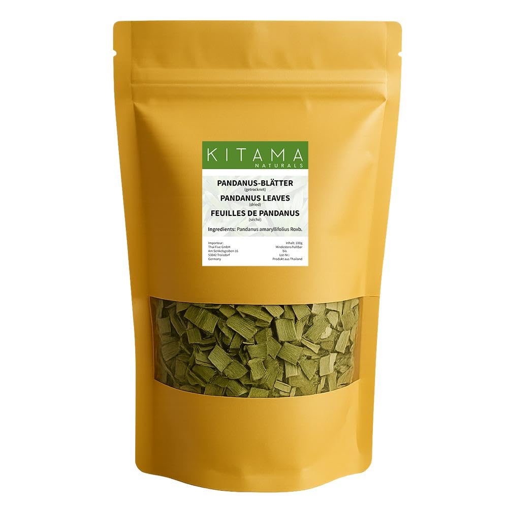Discover the exotic taste of Thailand with our dried pandan leaves (Bai Toey), an essential ingredient in Southeast Asian cuisine. The leaves are characterized by their sweet, grassy aroma, reminiscent of vanilla and freshly cut grass. In Thailand, pandan leaves are traditionally used for: Cooking sticky or jasmine rice Preparing desserts with coconut milk, such as khanom tako or sago Infusing into soothing pandan tea Enhancing curries and soups They can also be used as scented sachets, in natural cosmetics, or as a natural air freshener. Our leaves are sourced from controlled cultivation in Thailand and gently dried. They are 100 natural, vegan, gluten-free, and free of artificial additives. Tip: Soak in hot water for 10 to 15 minutes before cooking to release all the aroma. Nutritional Information: Dried Pandana Leaves (Average nutritional values per 100g) Energy: 1250 kJ 300 kcal Fat: 1.5g Of which saturates: 0.4g Carbohydrate: 65g Of which sugars: 12g Protein: 5g Salt: 0.05g Important Note: Nutritional information is subject to the usual fluctuations of natural products. The product is used in small quantities for flavoring or as an infusion. The actual nutrient content per serving is negligible. Product Note: Dried pandan leaves are traditionally used as a flavoring and for preparing tea and are not a common staple food. INGREDIENTS Pandanus amaryllifolius INSTRUCTIONS When preparing tea, always ensure the herbs are steeped in freshly boiled water. Let it steep for at least 5 to 10 minutes. We recommend approximately 1 tablespoon per cup (350 ml). SAFETY WARNING Contains pandan. May cause allergic reactions. MANUFACTURER'S DETAILS Thai Five GmbH, Am Senkelsgraben 16, 53842 Troisdorf, Germany See moreKITAMA Feuilles de pandanas séchées 100 g - Arôme naturel de Thaïlande - Pour thé, riz, desserts et cuisine asiatique - Feuilles de pandan - Bai Toey - 100 naturelDESCRIPTION DU PRODUIT DESCRIPTION DU PRODUIT Découvrez le goût exotique de la Thaïlande avec nos feuilles de pandanas séchées (Bai Toey), un élément indispensable de la cuisine de l'Asie du Sud-Est. Les feuilles se caractérisent par leur arôme d'herbe sucrée, qui rappelle la vanille et l'herbe fraîchement coupée. En Thaïlande, les feuilles de pandanas sont traditionnellement utilisées pour : Cuisson de riz gluant ou de jasmin Préparez des desserts avec du lait de coco, comme le khanom Tako ou le sago. Infuser dans un thé pandan apaisant Affiner les currys et les soupes En outre, ils peuvent être utilisés comme sachets parfumés, dans les cosmétiques naturels ou comme désodorisant naturel. Nos feuilles proviennent de cultures contrôlées en Thaïlande et sont séchées en douceur. Ils sont 100 naturels, végétaliens, sans gluten et sans additifs artificiels. Astuce : faites tremper dans de l'eau chaude pendant 10 à 15 minutes avant la cuisson pour libérer tout l'arôme. Informations nutritionnelles : Feuilles de pandanas séchées (Valeurs nutritionnelles moyennes pour 100 g) Énergie : 1250 kJ 300 kcal Matières grasses : 1,5 g Dont acides gras saturés : 0,4 g Glucides : 65 g dont sucres : 12 g Protéines : 5 g Sel : 0,05 g Remarque importante : Les informations nutritionnelles sont soumises aux fluctuations habituelles des produits naturels. Le produit est utilisé en petites quantités pour l'aromatisation ou comme infusion. L'apport réel en nutriments par portion est négligeable. Remarque sur le produit : Les feuilles de pandanas séchées sont traditionnellement utilisées comme aromatiseur et pour la préparation du thé et ne sont pas un aliment de base classique. INGRÉDIENTS Pandanus amaryllifolius MODE D'EMPLOI Lors de la préparation du thé, veillez toujours à ce que les herbes soient infusées avec de l'eau bouillante bouillante. Laissez infuser pendant au moins 5 à 10 minutes. Nous recommandons environ 1 cuillère à soupe par tasse (350 ml) AVERTISSEMENT DE SÉCURITÉ Contient du pandan. Peut provoquer des réactions allergiques. COORDONNÉES DU FABRICANT Thai Five GmbH, Am Senkelsgraben 16, 53842, Troisdorf, DE Voir plus