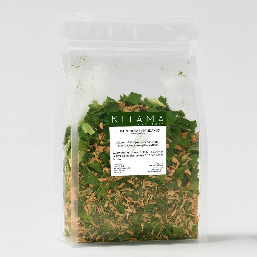 Kitama Lemongrass tea with pandan 100g sun-dried from Thailand. A wellness tea for relaxation and unwinding.