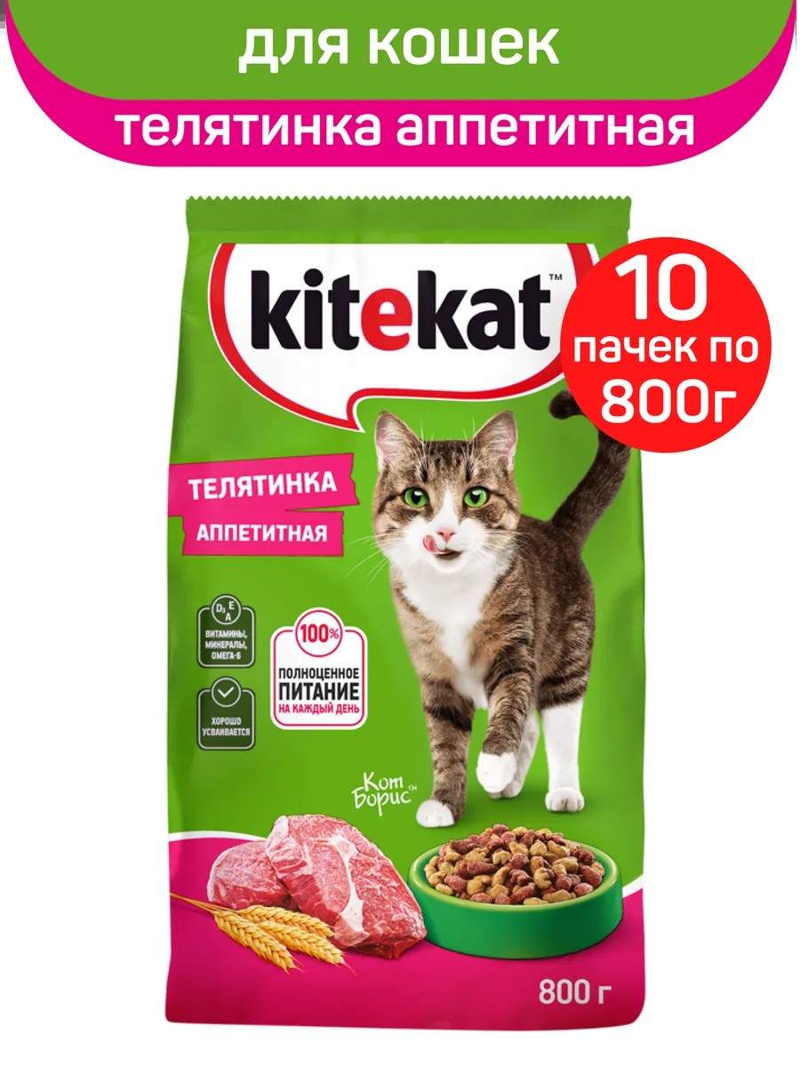Kitekat Сухой корм для кошек, телятинка аппетитная, 10шт по 800г