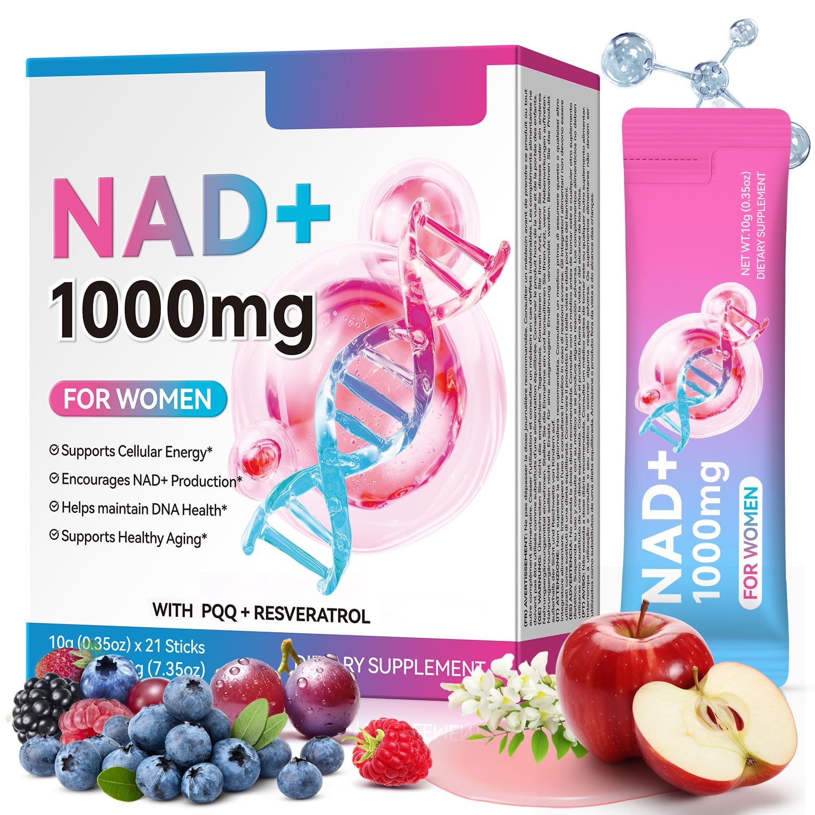 NAD Supplement is formulated specifically for women, this advanced blend of PQQ, and Resveratrol supports natural NAD production, promotes cellular energy, and encourages healthy aging. Each serving delivers science-backed ingredients to help you feel your best, inside and out. NAD 1000mg for Women With PQQ Resveratrol ✓ Supports Cellular Energy ✓ Encourages NAD Production ✓ Helps maintain DNA Health ✓ Supports Healthy Aging SUGGESTED USE: Dissolve 1 sachet daily in water. For optimal results, maintain a balanced diet and active lifestyle. ? Embrace Youthful Resilience—One Refreshing Sip at a Time!Safe Natural Formula Made with a pure natural formula, non-GMO, gluten-free, and can be mixed with natural fruit and vegetable concentrates for a refreshing taste. The convenient stick pack allows you to enjoy it anytime, anywhere. Take one stick daily for a pleasant experience, easily activate cellular energy, and embrace youthful vitality. Excellent Absorption Bioavailability Our NAD supplement uses a liquid formula for maximum absorption. This ensures the body efficiently utilizes NAD , providing enhanced cellular energy support with daily use, helping you maintain youthful skin and overall health. ? Enhance Cognitive Ability Focus The premium NAD formula optimizes neuronal energy metabolism, enhancing cognitive speed and focus, boosting work and study efficiency, and clarifying mental clarity. Suitable for professionals, students, or mothers requiring multitasking. Premium NAD Anti-Aging Formula NAD supplements provide a powerful 1,000 mg dose of NAD , combined with resveratrol and quercetin, significantly boosting NAD levels, slowing cellular aging, promoting damage repair, and rejuvenating your appearance from the inside out. ? Boost Cellular Energy NAD Levels Our NAD supplement boosts cellular energy and NAD levels, converting nutrients into sustained energy, reducing post-workout fatigue, enhancing endurance, and accelerating recovery. It is ideal for fitness enthusiasts and those seeking relief from daily fatigue.