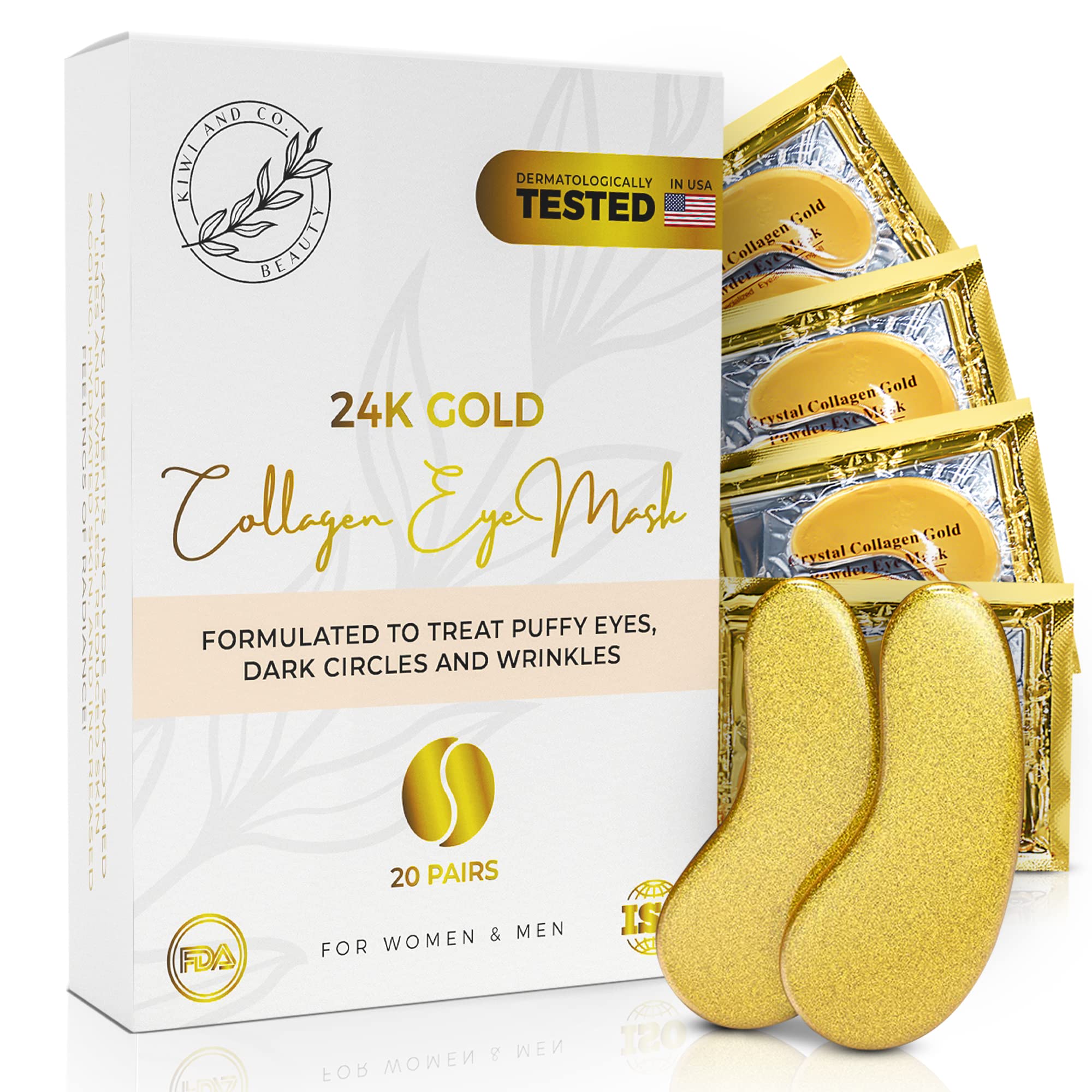 KIWI AND CO. BEAUTY 24K Gold Under Eye Masks (20 Pairs) Treatment For Dark Circles Puffiness Fine Lines & Wrinkles Anti-Aging Collagen Skin Care Patches For All Skin Types