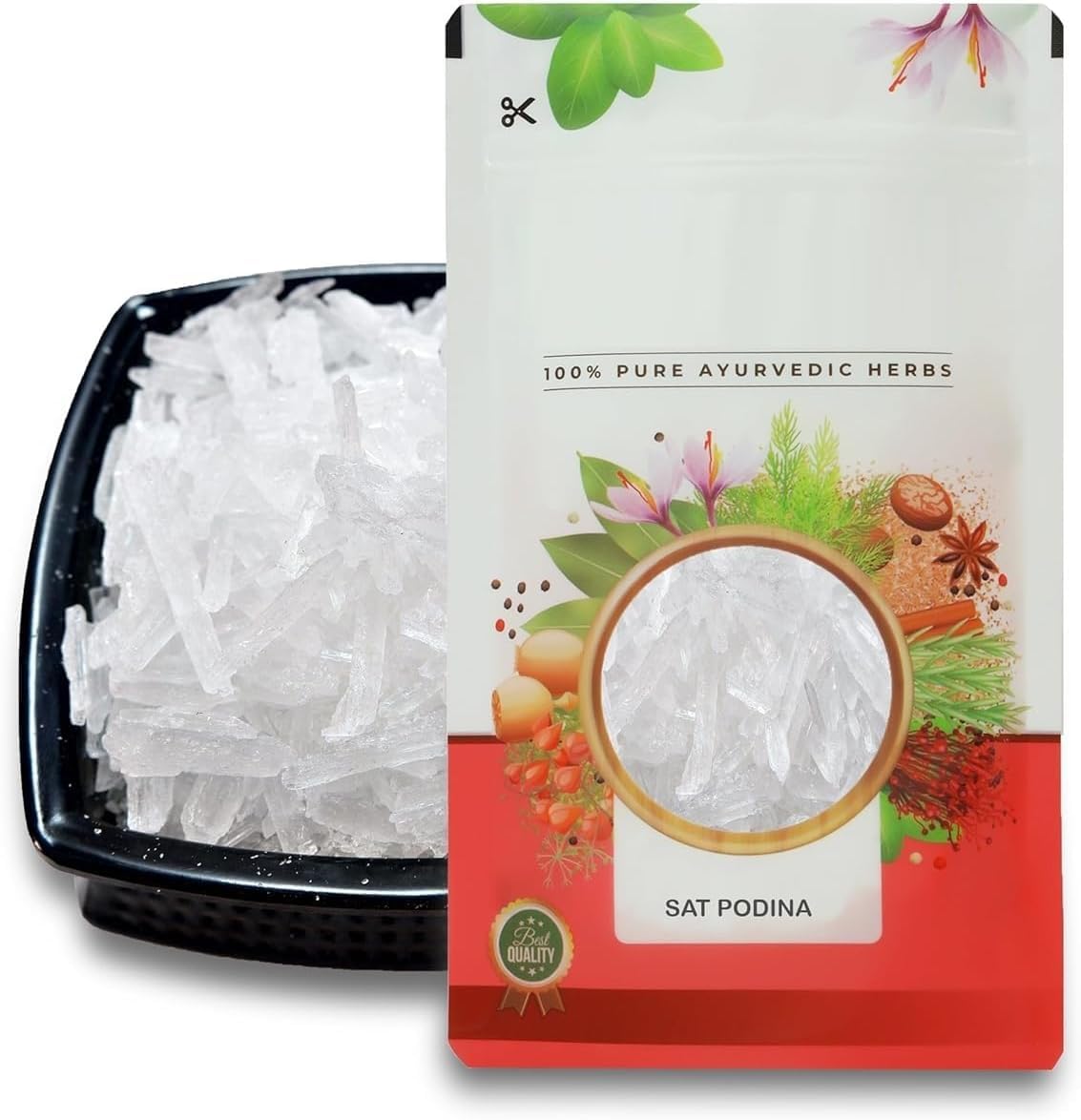 Sat Podina, also known as menthol crystals, is a naturally derived extract obtained from peppermint oil. These clear, crystalline solids are known for their strong, refreshing aroma and cooling sensation. Carefully processed and packed in pure crystal form, this product is suitable for traditional household uses, DIY wellness preparations, soaps, balms, steam inhalation, and sauna applications.