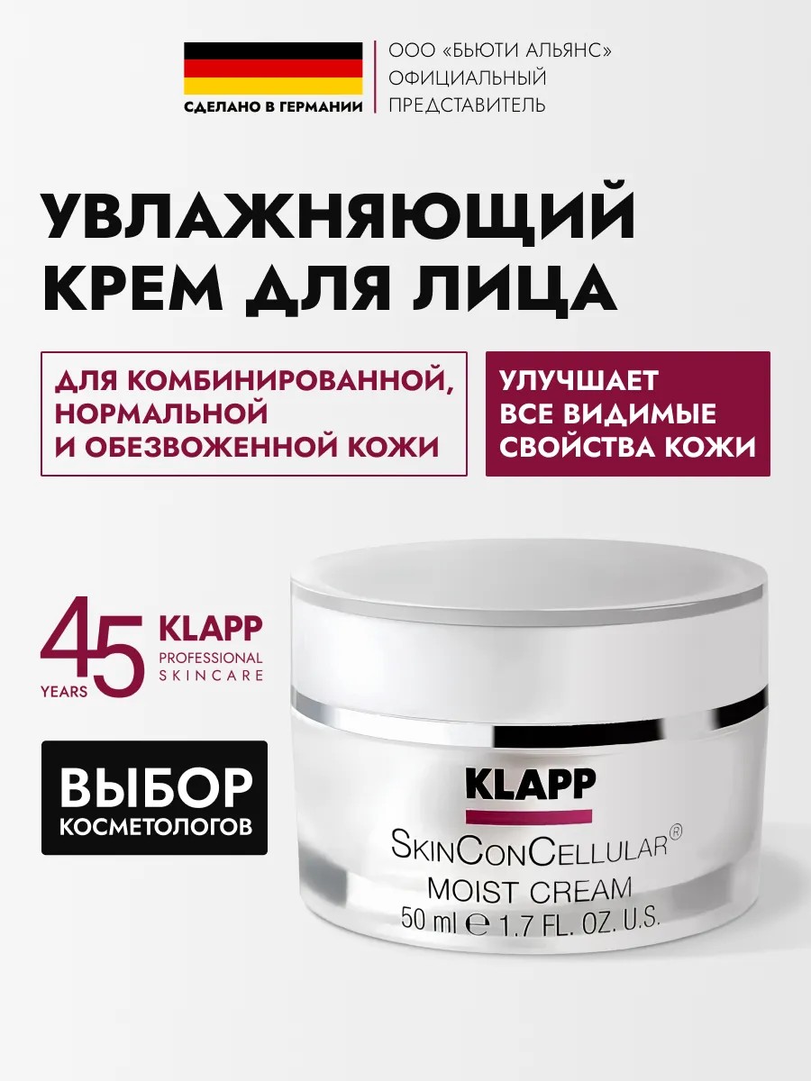 KLAPP Универсальный крем SkinConCellular Moist для лица с коллагеном, витамином C и маслом жожоба обеспечит вашей коже интенсивное увлажнение, питание и защиту от сухости. Он создан специально для ухода за мужской и женской взрослой кожей любого типа, в том числе проблемной, обезвоженной и чувствительной. Средство идеально подходит для ночного и дневного ухода, способствуя восстановлению упругости и эластичности кожи. Легкий и нежный, утренний крем отлично подходит для сухой, комбинированной и жирной кожи, быстро устраняя шелушения и обеспечивая комфорт на весь день. Благодаря своей легкой текстуре, немецкий крем быстро впитывается и не оставляет ощущения липкости или жирности, поэтому его удобно использовать днем, вечером или ночью. В состав так же входят: витамин Е, масло ши и пантенол, обеспечивающие улучшение состояния кожи и способствуя ее здоровому сиянию. Коллагеновый крем подходит для разного возраста: для молодой подростковой кожи (20, 25, 30, 35 +), зрелой (40, 45, 50, 55 +), а также для пожилой возрастной (60, 65 +).