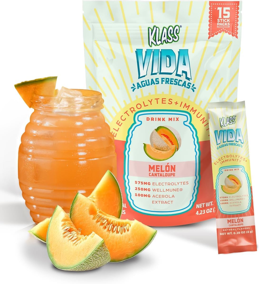 KLASS VIDA Hydration + Immunity Electrolyte Drink Mix Cantaloupe Agua Fresca Flavor | Sugar-Free Powder with Wellmune Acerola Coconut Water & Minerals | 15 Single-Serve Stick Packs Low Calorie