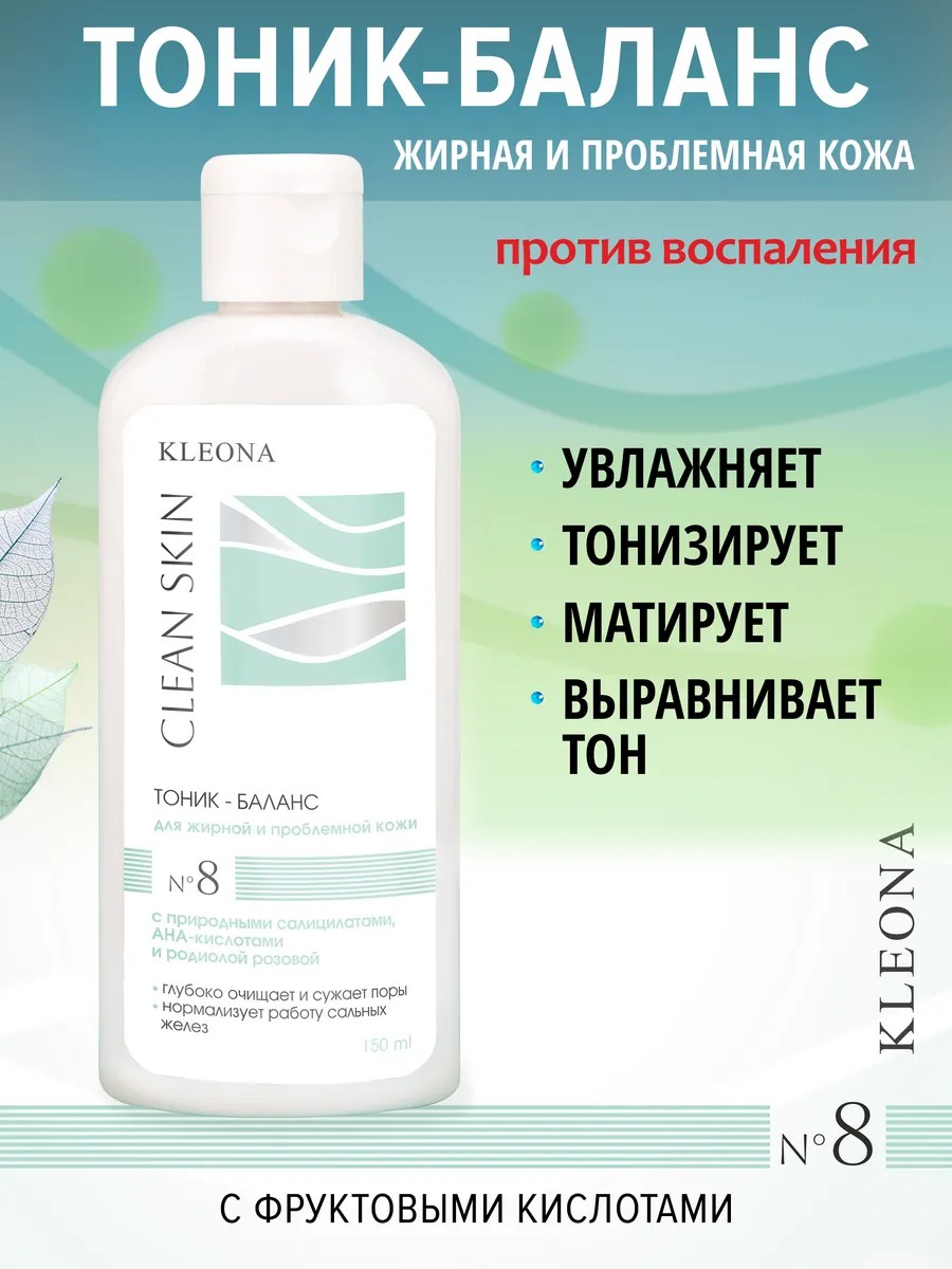 Tea tree essential oil is a natural antiseptic, has a strong bactericidal effect on inflammatory cells, disinfects the skin, and reduces pimples. Directions: Apply the moisturizing toner to a cotton pad and wipe the skin after washing, gently patting with your fingers. After this, you can proceed to the next step of your skincare routine. It is suitable for both young and mature skin for daily use. The refreshing effect, including reduced pore size, visual lightening of age spots, and a whiter complexion, is noticeable after the first use. A great gift idea for your beloved wife, grandmother, friend, or sister for March 8th, an anniversary, celebration, or any holiday! Kleona is an official Russian manufacturer; all products are tested and certified, confirming their quality and safety.