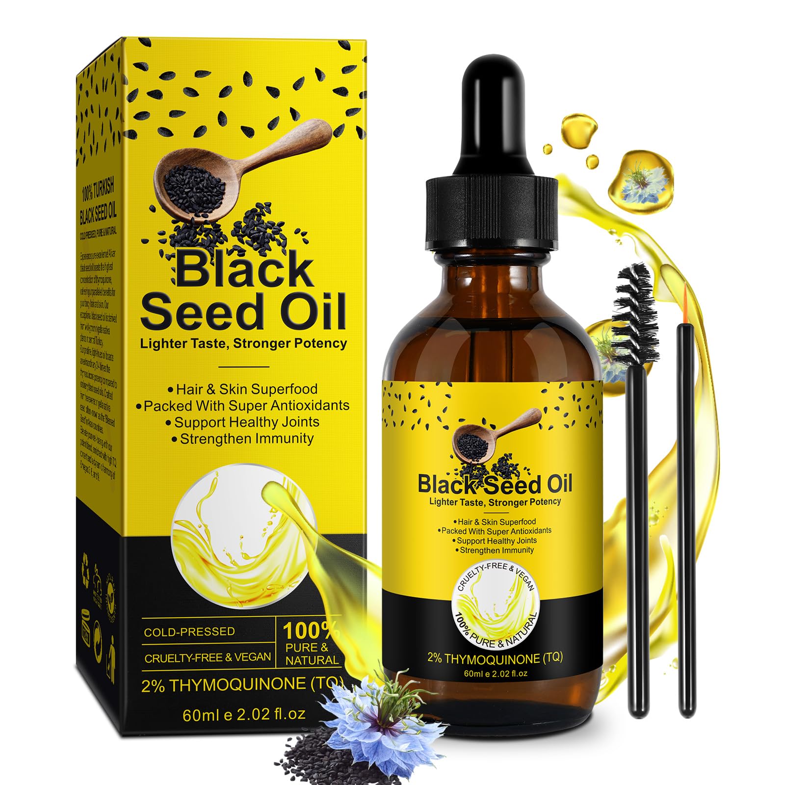 INSTRUCTIONS FOR USE Shake the bottle well before use, then apply 1-3 drops to hair or skin and allow to dry SAFETY WARNING May cause skin irritation. Dilute before use.Nigella Sativa Oil (Nigella Sativa) has been traditionally used in Eastern naturopathy for over 2000 years. This natural product has also become very popular in Western Europe due to its varied content of vitamins, minerals and amino acids and its high content of essential unsaturated fatty acids. It also contains vitamin E, which helps protect cells from oxidative stress. Ready and easy to use: our black cumin oil is a comfortable alternative to Nigella Sativa capsules. Shake the bottle well before use then apply 1 to 3 drops to the hair or skin and then allow to dry. Our product is cold-pressed, vegan and organically certified. Prevents black spots and acne: This black seed oil reduces inflammation of the skin while improving skin hydration. When used consistently, it helps you prevent pesky blackheads and possible acne through antibacterial and antioxidant properties. Prevents hair loss: Thanks to its completely natural formula of essential fatty acids and vitamins, this black cumin oil fights and strengthens hair loss, giving it a completely radiant effect. Say goodbye to weak, dull and dry hair. High quality: Nigella Sativa oil (black seed oil), 100 pure, organic, natural, cold-pressed. We only use the highest quality ingredients and continually improve the formulas used to create the best possible products. ✓ Pure Cold-Pressed Black Caraway Oil : This organic black cumin oil (Nigella Sativa oil) is an organic, cold-pressed solution with antibacterial, rejuvenating and antioxidant properties. It prevents hair loss and reduces inflammation of your skin.Biologische zwarte komijnzaadolie, 60 ml, glazen fles pipet borstel voor haarverlies, acne en mee-eters Zwarte zaadolie GEBRUIKSAANWIJZING Schud de fles goed voor gebruik, breng dan 1-3 druppels aan op haar of huid en laat drogen VEILIGHEIDSWAARSCHUWING Kan huidirritatie veroorzaken. Voor gebruik verdunnen.Nigella Sativa Oil (Nigella Sativa) wordt traditioneel al meer dan 2000 jaar in de oosterse natuurgeneeskunde gebruikt. Dit natuurproduct is ook in West-Europa zeer populair geworden vanwege het verschillende gehalte aan vitaminen, mineralen en aminozuren en het hoge gehalte aan essentiële onverzadigde vetzuren. Het bevat ook vitamine E, dat helpt cellen te beschermen tegen oxidatieve stress. Klaar en eenvoudig te gebruiken: onze zwarte komijnolie is een comfortabel alternatief voor Nigella Sativa capsules. De fles goed schudden voor gebruik daarna 1 tot 3 druppels op het haar of de huid aanbrengen en vervolgens laten drogen. Ons product is koudgeperst, veganistisch en biologisch gecertificeerd. Voorkomt zwarte vlekken en acne: deze zwarte zaadolie vermindert ontstekingen van de huid en verbetert tegelijkertijd de hydratatie van de huid. Bij consequent gebruik helpt het je vervelende mee-eters en mogelijke acne door antibacteriële en antioxiderende eigenschappen te voorkomen. Voorkomt haaruitval: dankzij de volledig natuurlijke formule van essentiële vetzuren en vitaminen, bestrijdt deze zwarte komijnolie haaruitval en versterkt het en geeft het een volledig stralend effect. Zeg vaarwel tegen zwak, dof en droog haar. Hoge kwaliteit: Nigella Sativa olie (zwarte pitolie), 100 zuiver, biologisch, natuurlijk, koudgeperst. We gebruiken uitsluitend ingrediënten van de hoogste kwaliteit en verbeteren voortdurend de gebruikte formules om de best mogelijke producten te maken. ✓ Zuiver koudgeperste zwarte karwijolie : deze organische zwarte komijnolie (Nigella Sativa olie) is een organische, koudgeperste oplossing met antibacteriële, verjongende en antioxiderende eigenschappen. Het voorkomt haaruitval en vermindert ontstekingen van je huid.
