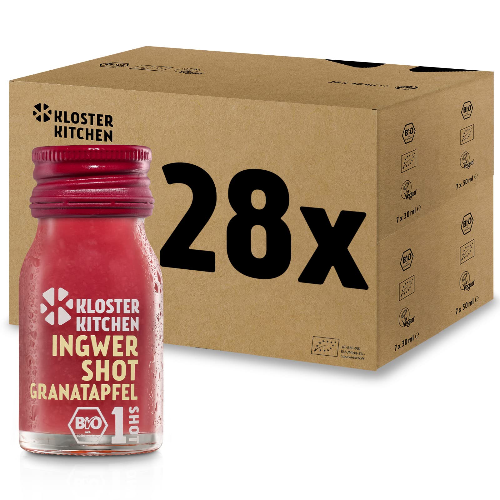 Vegan and organic by conviction. No artificial flavors or preservatives. Ginger pieces: made from organic ginger, with no pulp, juice, or ginger concentrate. Pomegranate: spicy and fruity pomegranate blended with the natural zing of real ginger pieces. 28 x 30ml bottles for a 2-week supply - pomegranate drink on the go: the ginger and pomegranate drink in a convenient 30ml glass bottle.Végétalien et bio par conviction. Sans arômes ni conservateurs. Morceaux de gingembre : à partir de gingembre biologique, sans pulpe, jus ou concentré de gingembre. Grenade: du grenade épicé et fruité mélangé avec du piquant naturel des vrais morceaux de gingembre. 28 flacons de 30 ml pour un approvisionnement de 2 semaines - boisson au grenade à emporter : la boisson de gingembre et grenade sur la route dans une bouteille en verre de 30 ml.Kloster Kitchen Bio Gingembre Shot Grenade 1SHOT 28 x 30 ml avec des morceaux de gingembre Shot de gingembre végétalien en bouteille en verre Sans additifs avec douceur naturelle