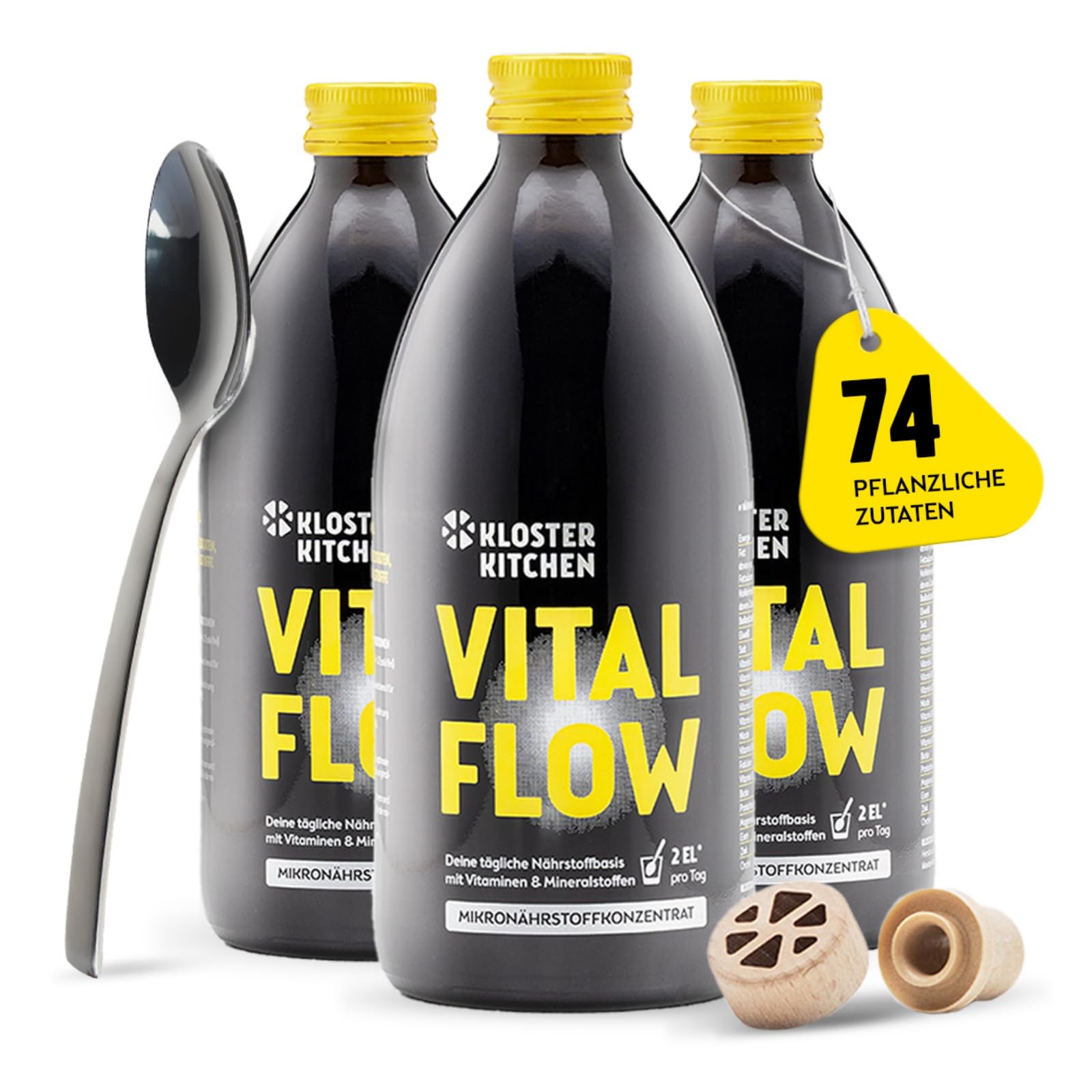 Whether it's for sports, creative work, or solving complex tasks, when you're in the flow, it's much easier. Concentration, energy, and inner balance play an important role. Vital Flow – Your daily support for the immune system¹, energy², and cognitive performance. ³ With a combination of micronutrients including vitamins C and D, and zinc, Vital Flow supports your immune system¹, day after day. Magnesium, iron, and vitamin B12 help reduce fatigue and maintain your daily energy². Contains zinc and pantothenic acid for cognitive performance and mental focus³. All this in a fruity base made with over 70 carefully selected plant-based ingredients. Start your day with Vital Flow: naturally delicious and plant-based, your smart nutritional foundation for a mindful lifestyle. INGREDIENTS 85 fruit juice concentrate (31 grape, pear, apple, 9.4 raspberry, lime, aronia, pineapple, quince, orange, blackcurrant, lemon, passion fruit, pomegranate, blackberry, blueberry, elderberry, sour cherry, banana, cranberry, plum, mandarin, tiger, apricot, peach, cranberry, mirabelle plum, blackcurrant, grapefruit, rosehip, melon, sea buckthorn, strawberry), thick agave juice, 2.2 vegetable juice concentrate (beetroot, 0.6 black carrot, tomato, cucumber, broccoli, onion), 1.2 . 7 high. Concentrated fermented inambur juice with milky acid, 1.3 fermented oat extract (whole gluten-free oat flakes, water), magnesium carbonate, 0.5 ginger juice, vitamin C, mango clay, fruit and vegetable concentrate (sweet potato, apple, cherry, radish), 0.6 plant extracts (sweet potato, apple, cherry, radish), 0.6 plant extracts (elderflower, gem inseng, acerola, green tea), vegetable puree (pumpkin, pepper), niacin, vitamin E, iron (II) bisglycinate, zinc sulfate, turmeric juice, herb and spice extract (licorice root, plantain leaves, blackberry leaves, peppermint leaves, chamomile flowers, elderflower, Icelandic). Moss, linden, mallow flowers, sage leaves, key flowers, star anise, thyme herb, eucalyptus leaves, fennel, cornflower blossoms, marshmallow leaves, calendula flowers, yarrow flowers, wool flowers), pantothenic acid, vitamin B6, vitamin B2, vitamin B1, folic acid, biotin, chromium (III) chloride, vitamin D3, vitamin B1.2 DIRECTIONS Once a day, pour 50 to 100 ml of still water into a glass. Add 2 tablespoons (16 ml) of Vital Flow. An 8 ml Kloster Kitchen measuring spoon for precise dosing is included. Stir and enjoy. Enjoy neat or diluted with water. See more✓ EASY TO USE: Includes a measuring spoon and a pouring spout. With 93 servings, our vital substance complex lasts 3 months for your mindful lifestyle. Mindful, simple, effective. PLANT-BASED MICRONUTRIENT COMPLEX: Our vital substance concentrate provides optimal nutrients for your routine. 2 tablespoons once a day in the morning to support you. SCIENTIFIC FORMULA: Micronutrient concentrate containing 15 micronutrients, multivitamins, minerals, and over 70 plant-based ingredients. No artificial additives: Our concentrated micronutrient for adults is free of preservatives, colors, sweeteners, and flavors. Made in Germany: Every sip is full of nature and premium taste.Kloster Kitchen Vital Flow Concentré de micronutriments 3 x 500 ml – 3 mois – 74 ingrédients Fruits, légumes et herbes – Vitamines, minéraux et oligo-éléments Micronutriments jus liquideDESCRIPTION DU PRODUIT DESCRIPTION DU PRODUIT Que ce soit pour le sport, le travail créatif ou la résolution de tâches complexes, lorsque vous êtes dans le flux, beaucoup plus facile à faire. La concentration, l'énergie et l'équilibre intérieur jouent un rôle important. Flux vital – Votre soutien quotidien pour le système immunitaire¹, l'énergie² et les performances cognitives. ³ Avec une combinaison de micronutriments de vitamine C, D et de zinc, Vital Flow soutient votre système immunitaire¹, jour après jour. Le magnésium, le fer et la vitamine B12 aident à réduire la fatigue et à maintenir votre énergie au quotidien². Contient du zinc et de l'acide pantothénique pour la performance cognitive et la concentration mentale³. Et cela dans une base fruitée composée de plus de 70 ingrédients végétaux soigneusement sélectionnés. Commencez votre journée avec Vital Flow : naturellement savoureux et à base de plantes, votre base nutritionnelle intelligente pour un style de vie conscient. INGRÉDIENTS 85 de concentré de jus de fruits (31 de raisin, poire, pomme, 9,4 de framboise, citron vert, aronia, ananas, coing, orange, cassis, citron, maracuja, grenade, mûre, myrtille, sureau, cerise aigre, banane, canneberge, prune. mandarine, tigre. Abricot, pêche, canneberge, mirabelle, cassis, pamplemousse, cynorrhodon, melon, argousier, fraise), jus épais d'agave, concentré de jus de légumes 2,2 (betterave rouge, 0,6 de carotte noire, tomate, concombre, brocoli, oignon), 1,,2 . 7 de haut. concentré de jus d'inambur fermenté à l'acide laiteux, extrait d'avoine fermenté à 1,3 (flocons d'avoine entiers sans gluten, eau), carbonate de magnésium, jus de gingembre 0,5 , vitamine C, argile de mangue, concentré de fruits et légumes (patate douce, pomme, cerise, radis), 0,6 d'extraits de plantes (patate douce, pomme, cerise, radis), 0,6 d'extraits végétaux (Fleurs de sureau, Gem Inseng, acérola, thé vert), purée de légumes (citrouille, poivron), niacine, vitamine E, bisglycinate de fer (II), sulfate de zinc, jus de curcuma, extrait d'herbes et d'épices (racine de réglisse, feuilles de plantain, feuilles de mûre, feuilles de menthe poivrée, fleurs de camomille, fleurs de sureau, islandais). mousse, tilleul Fleurs de mauve, feuilles de sauge, fleurs de clé, anis étoilé, herbe de thym, feuilles d'eucalyptus, fenouil, fleurs de bleuet, feuilles de guimauve, fleurs de calendula, fleurs d'achillée millefeuille, fleurs de laine), acide pantothénique, vitamine B6, vitamine B2, vitamine B1, acide folique, biotine, chlorure de chrome (III), vitamine DH 3, vitamine B1. 2 MODE