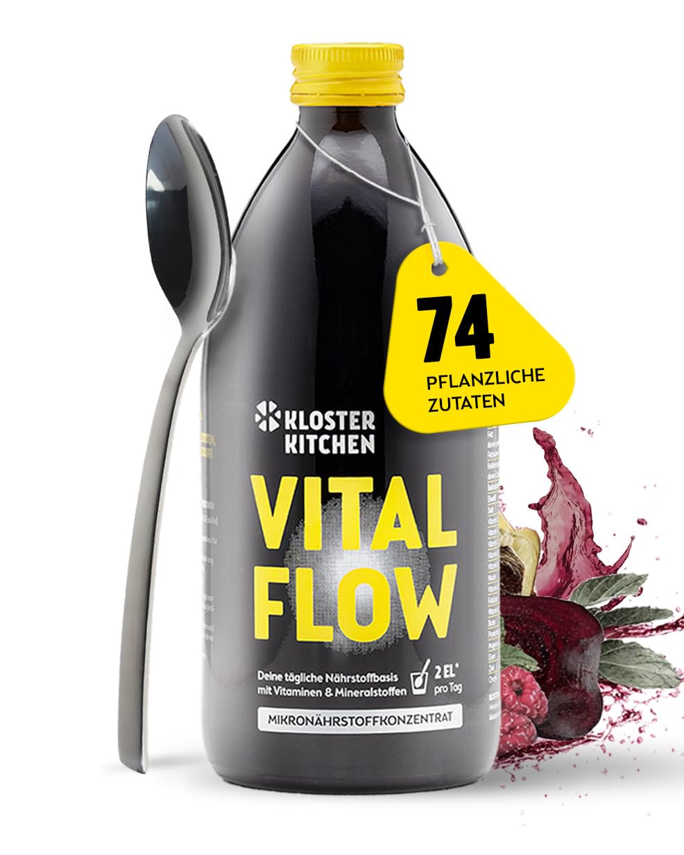 Whether it's for sports, creative work, or solving complex tasks, when you're in the flow, it's much easier. Concentration, energy, and inner balance play an important role. Vital Flow – Your daily support for the immune system¹, energy², and cognitive performance. ³ With a combination of micronutrients including vitamins C and D, and zinc, Vital Flow supports your immune system¹, day after day. Magnesium, iron, and vitamin B12 help reduce fatigue and maintain your daily energy². Contains zinc and pantothenic acid for cognitive performance and mental focus³. All this in a fruity base made with over 70 carefully selected plant-based ingredients. Start your day with Vital Flow: naturally delicious and plant-based, your smart nutritional foundation for a mindful lifestyle. INGREDIENTS 85 fruit juice concentrate (31 grape, pear, apple, 9.4 raspberry, lime, aronia, pineapple, quince, orange, blackcurrant, lemon, passion fruit, pomegranate, blackberry, blueberry, elderberry, sour cherry, banana, cranberry, plum, mandarin, tiger, apricot, peach, cranberry, mirabelle plum, blackcurrant, grapefruit, rosehip, melon, sea buckthorn, strawberry), thick agave juice, 2.2 vegetable juice concentrate (beetroot, 0.6 black carrot, tomato, cucumber, broccoli, onion), 1.2 . 7 high. Concentrated fermented inambur juice with milky acid, 1.3 fermented oat extract (whole gluten-free oat flakes, water), magnesium carbonate, 0.5 ginger juice, vitamin C, mango clay, fruit and vegetable concentrate (sweet potato, apple, cherry, radish), 0.6 plant extracts (sweet potato, apple, cherry, radish), 0.6 plant extracts (elderflower, gem inseng, acerola, green tea), vegetable puree (pumpkin, pepper), niacin, vitamin E, iron (II) bisglycinate, zinc sulfate, turmeric juice, herb and spice extract (licorice root, plantain leaves, blackberry leaves, peppermint leaves, chamomile flowers, elderflower, Icelandic). Moss, linden, mallow flowers, sage leaves, key flowers, star anise, thyme herb, eucalyptus leaves, fennel, cornflower blossoms, marshmallow leaves, calendula flowers, yarrow flowers, wool flowers), pantothenic acid, vitamin B6, vitamin B2, vitamin B1, folic acid, biotin, chromium (III) chloride, vitamin D3, vitamin B1.2 DIRECTIONS Once a day, pour 50 to 100 ml of still water into a glass. Add 2 tablespoons (16 ml) of Vital Flow. An 8 ml Kloster Kitchen measuring spoon for precise dosing is included. Stir and enjoy. Enjoy neat or diluted with water. See more✓ EASY TO USE: Includes a measuring spoon and a pouring spout. With 31 servings, our vital substance complex lasts 1 month for your mindful lifestyle. Mindful, simple, effective. PLANT-BASED MICRONUTRIENT COMPLEX: Our vital substance concentrate provides optimal nutrients for your routine. 2 tablespoons once a day in the morning to support you. SCIENTIFIC FORMULA: Micronutrient concentrate containing 15 micronutrients, multivitamins, minerals, and over 70 plant-based ingredients. No artificial additives: Our concentrated micronutrient for adults is free from preservatives, colors, sweeteners, and flavors. Made in Germany: Every sip is full of nature and premium taste.Kloster Kitchen Vital Flow Concentré de micronutriments 500 ml – 31 jours – 74 ingrédients Fruits, légumes et herbes – Vitamines, minéraux et oligo-éléments Micronutriments Jus liquideDESCRIPTION DU PRODUIT DESCRIPTION DU PRODUIT Que ce soit pour le sport, le travail créatif ou la résolution de tâches complexes, lorsque vous êtes dans le flux, beaucoup plus facile à faire. La concentration, l'énergie et l'équilibre intérieur jouent un rôle important. Flux vital – Votre soutien quotidien pour le système immunitaire¹, l'énergie² et les performances cognitives. ³ Avec une combinaison de micronutriments de vitamine C, D et de zinc, Vital Flow soutient votre système immunitaire¹, jour après jour. Le magnésium, le fer et la vitamine B12 aident à réduire la fatigue et à maintenir votre énergie au quotidien². Contient du zinc et de l'acide pantothénique pour la performance cognitive et la concentration mentale³. Et cela dans une base fruitée composée de plus de 70 ingrédients végétaux soigneusement sélectionnés. Commencez votre journée avec Vital Flow : naturellement savoureux et à base de plantes, votre base nutritionnelle intelligente pour un style de vie conscient. INGRÉDIENTS 85 de concentré de jus de fruits (31 de raisin, poire, pomme, 9,4 de framboise, citron vert, aronia, ananas, coing, orange, cassis, citron, maracuja, grenade, mûre, myrtille, sureau, cerise aigre, banane, canneberge, prune. mandarine, tigre. Abricot, pêche, canneberge, mirabelle, cassis, pamplemousse, cynorrhodon, melon, argousier, fraise), jus épais d'agave, concentré de jus de légumes 2,2 (betterave rouge, 0,6 de carotte noire, tomate, concombre, brocoli, oignon), 1,,2 . 7 de haut. concentré de jus d'inambur fermenté à l'acide laiteux, extrait d'avoine fermenté à 1,3 (flocons d'avoine entiers sans gluten, eau), carbonate de magnésium, jus de gingembre 0,5 , vitamine C, argile de mangue, concentré de fruits et légumes (patate douce, pomme, cerise, radis), 0,6 d'extraits de plantes (patate douce, pomme, cerise, radis), 0,6 d'extraits végétaux (Fleurs de sureau, Gem Inseng, acérola, thé vert), purée de légumes (citrouille, poivron), niacine, vitamine E, bisglycinate de fer (II), sulfate de zinc, jus de curcuma, extrait d'herbes et d'épices (racine de réglisse, feuilles de plantain, feuilles de mûre, feuilles de menthe poivrée, fleurs de camomille, fleurs de sureau, islandais). mousse, tilleul Fleurs de mauve, feuilles de sauge, fleurs de clé, anis étoilé, herbe de thym, feuilles d'eucalyptus, fenouil, fleurs de bleuet, feuilles de guimauve, fleurs de calendula, fleurs d'achillée millefeuille, fleurs de laine), acide pantothénique, vitamine B6, vitamine B2, vitamine B1, acide folique, biotine, chlorure de chrome (III), vitamine DH 3, vitamine B1. 2 MODE 