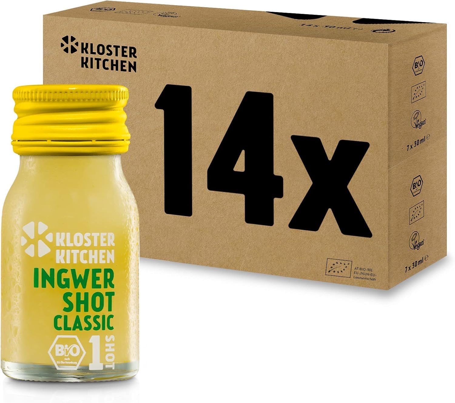 Kloster Kitchen Lot de 14 shots de gingembre bio 1SHOT - 14 x 30 ml - Avec v ritables morceaux de gingembre - V g talien dans une bouteille en verre emporter - Doux et pic - Sans additifs et avec
