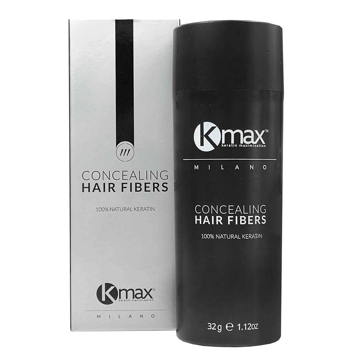 Twee haarvezelproducten: een zwarte fles en een zilveren doos met het label Kmax, ontworpen om haaruitval te verbergen