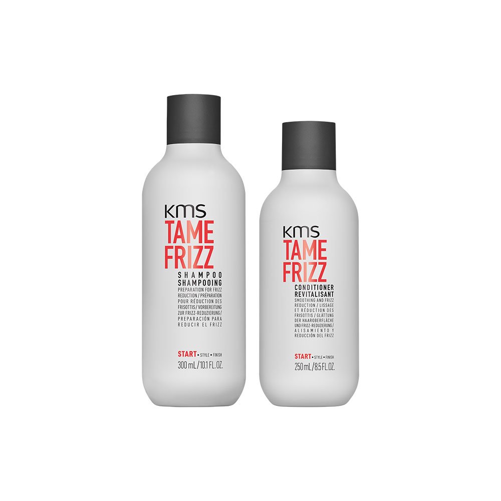 KMS California Tame Frizz Shampoo prepares hair for frizz reduction. KMS California Tame Frizz Conditioner smooths and reduces frizz.Shampoo 300 ml and conditioner 250 ml. Le shampooing Tame Frizz de KMS California prépare le cheveu à la réduction des frisottis. L'après-shampooing Tame Frizz de KMS California lisse et réduit les frisottis.Shampoing 300 ml et après-shampoing 250 ml.