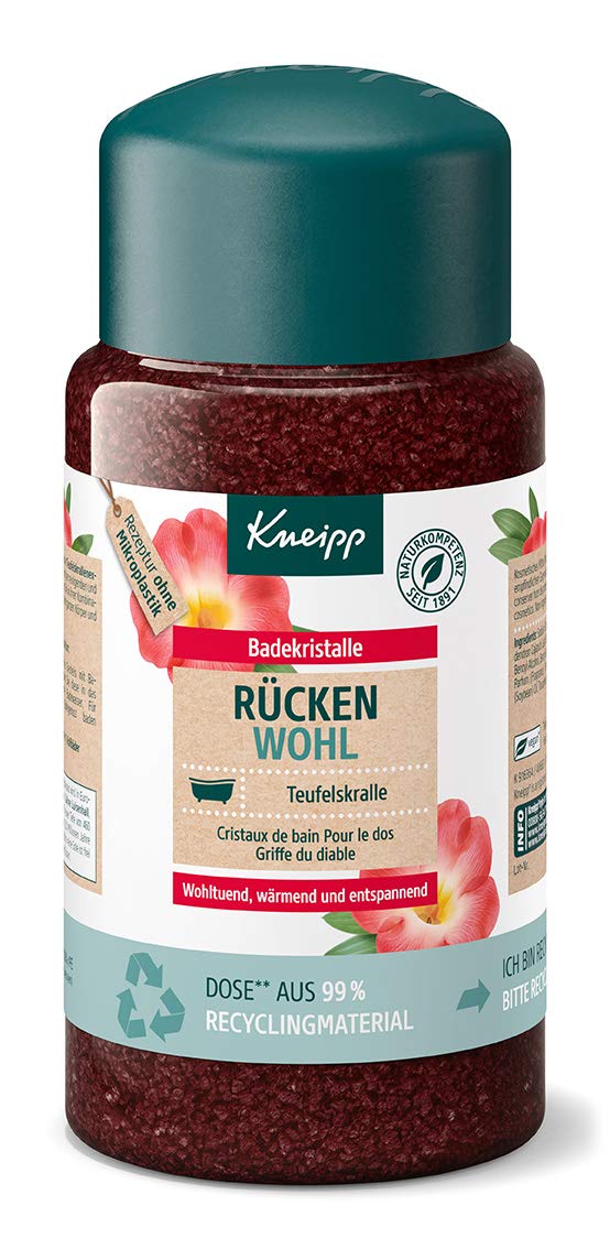 Kneipp bath crystals contain skin-nourishing devil's claw extract and natural cajeput essential oil. Combined with the purifying and soothing effect of warm water, the essential oils release their natural fragrance. The bathing experience warms the entire body, especially the back.Suitable for bathing. Rich in trace elements and mineral salts. Highly soluble crystals with natural thermal salt. Contains natural cajeput essential oil and precious devil's claw extract. Soothing, warming, and relaxing.Les cristaux de bain Kneipp contiennent de l'extrait de griffe du diable nourrissant pour la peau et de l'huile essentielle de cajeput naturelle. En combinaison avec l'effet purifiant et apaisant de l'eau chaude, les huiles essentielles déploient leur parfum naturel dans leur combinaison. L'expérience de bain réchauffe tout le corps et surtout le dos.Convient pour le bain à. Riche en oligo-éléments et sels minéraux. Cristaux hautement solubles avec du sel thermique naturel. Contient de l'huile essentielle de cajeput naturelle et de précieux extraits de griffe de diable. Apaisant, chauffant et relaxant.Kneipp Cristaux de bain pour le dos, 600 g