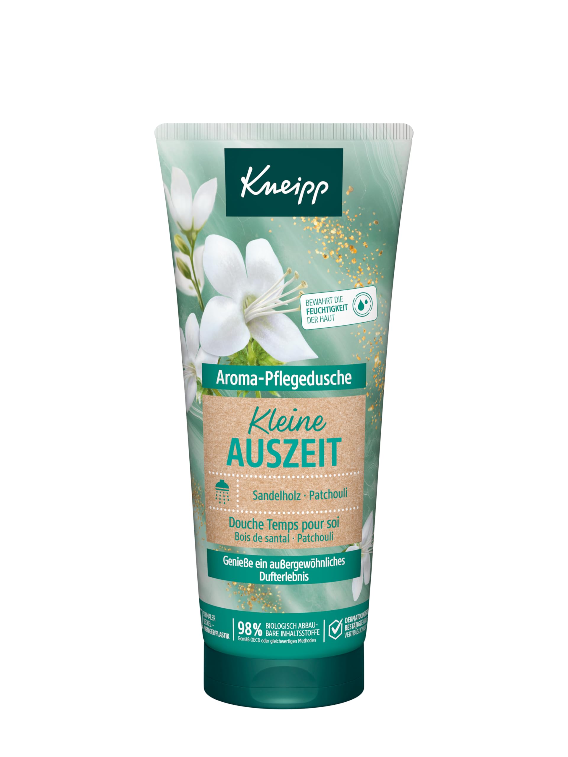 Kneipp Aroma Petite Pause Shower Gel offers a nourishing shower experience with an exceptional fragrance. Let yourself be enveloped by the warm, woody aroma of natural essential oils. Enjoy this little luxury every day: a moment just for you. The shower gel's plant-based formula improves the feeling of your skin during and after showering. Its formula with natural nourishing oils preserves and protects the skin's natural microbiome, leaving skin feeling soft and supple. A scientific study confirms that skin hydration is maintained during use. Narrow cap – less plastic (compared to the previous tube). Microplastic-free formula. 98 biodegradable ingredients (according to OECD or equivalent methods). Vegan. INGREDIENTS Aqua (Water), Sodium Laureth Sulfate, Glycerin, Cocamidopropyl Betaine, Cocoglucoside, PEG-18 Glyceryl Oleate Cocoate, PEG-40 Sorbitan Peroleate, Glyceryl Oleate, Parfum (Fragrance), Pogostemon Cablin Leaf Oil, Pterocarpus Soyauxii Wood Extract, Prunus. Tonsil. us Dulcis (Sweet Almond) Oil, Citrus Limon (Lemon) Peel Oil, Citrus Aurantium Dulcis (Orange) Peel Oil, Limonene, Coumarin, Citronellol, Linalool, Citral, Sodium Levulinate, Sodium Anisate, Maltodextrin, Sodium Chloride, Glycol Distearate, Citric Acid, Glycine Soja (soybean). Oil, Hydrogenated Palm Glycerides Citrate, Tocopherol, CI 28440, Caramel, CI 42090. SAFETY WARNING Cosmetic product. Keep out of reach of children. See morePreserves and maintains the skin's natural microbiome. Microplastic-free formula. Maintains skin's moisture. Sandalwood and patchouli. Enjoy an exceptional fragrance experience.Kneipp Douche de soin aromatique - Petite pause - Préserve l'hydratation de la peau - Formule sans microplastique - Végétalien - 200 mlDESCRIPTION DU PRODUIT DESCRIPTION DU PRODUIT La douche de soin Kneipp Aroma Petite pause vous offre une expérience de douche nourrissante avec un parfum exceptionnel. Laissez-vous envelopper par l'arôme boisé chaud des huiles essentielles naturelles. Profitez de ce petit luxe au quotidien : un moment rien que pour vous. La douche à la formule de soin végétale améliore la sensation de la peau pendant et après la douche. Sa formule à l'huile nourrissante naturelle préserve et préserve le microbiome naturel de la peau et procure une sensation de douceur et de souplesse sur la peau. Une étude scientifique confirme que l'hydratation de la peau est préservée lors de l'utilisation. Couvercle étroit – moins de plastique (par rapport au tube précédent). Formule sans microplastique. 98 d'ingrédients biodégradables (selon OCDE ou méthodes équivalentes). Végétalien. INGRÉDIENTS Aqua (eau), laureth sulfate de sodium, glycérine, cocamidopropyl betaine, cocoglucoside, PEG-18 Glyceryl Oleate Cocoate, PEG-40 Sorbitan Peroleate, Glyceryl Oleate, Parfum (Fragrance), Pogostemon Cablin Leaf Oil, Pterocarpus Soyauxii Wood Extract, Prunus. Amygdal. us Dulcis (Sweet Almond) Oil, Citrus Limon (Lemon) Peel Oil, Citrus Aurantium Dulcis (Orange) Peel Oil, Limonene, Coumarin, Citronellol, Linalool, Citral, Sodium Levulinate, Sodium Anisate, Maltodextrin, Sodium Chloride, Glycol Distearate, Citric Acid, Glycine Soja (soybean). Oil, hydrogéné Palm Glycerides Citrate, Tocophérol, CI 28440, Caramel, CI 42090. AVERTISSEMENT DE SÉCURITÉ Produit cosmétique Tenir hors de la portée des enfants. Voir plusPréserve et préserve le microbiome naturel de la peau. Formule sans microplastique. Préserve l'hydratation de la peau. Bois de santal et patchouli. Profitez d'une expérience parfumée exceptionnelle.