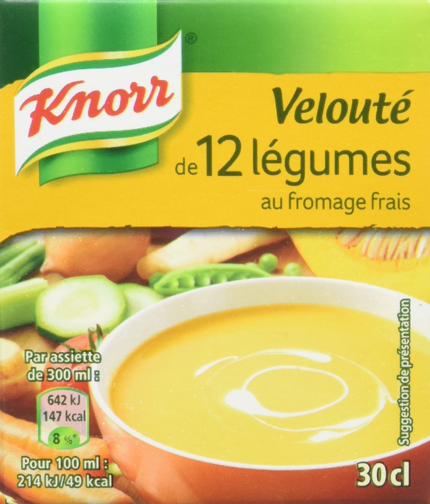 To concoct this soup for you, the Knorr chefs have skillfully combined twelve delicious vegetables and combined them with fresh cheese, for perfect creaminess and a delicious taste. INGREDIENTS Ingredients: water, vegetables: 39 (carrot, potato, tomato, onion, CELERY, peas, green beans, pumpkin, leek, parsnip, zucchini, turnip), fresh CHEESE: 2.9 , modified starch, sugar, sunflower oil, salt, chicken fat, whey (MILK), flavor, yeast extract, skimmed MILK powder, garlic. May contain: Gluten, mustard, egg. Vegetables from sustainable agriculture. DIRECTIONS FOR USE PREPARATION TIPS: 1. SHAKE 2. POUR IN POT OR MICROWAVE: 3. REHEAT WITHOUT BOILING 4. ENJOY NO NEED TO SALT DISCLAIMER Non-contractual photography. The above indications are given for information purposes. They are not necessarily exhaustive and cannot replace the information appearing on the product packaging which alone is authentic, and to which you are invited to refer, particularly in the event of food intolerance. As required by regulations. No artificial colors, flavor enhancers, or preservatives. 12 sustainably sourced vegetables. 30 cl. Pour vous concocter cette soupe, les chefs Knorr ont habilement marié douze délicieux légumes et les ont associés au fromage frais, pour une onctuosité parfaite et un goût savoureux. INGRÉDIENTS Ingrédients : eau, légumes : 39 (carotte, pomme de terre, tomate, oignon, CÉLERI, petit pois, haricot vert, potiron, poireau, panais, courgette, navet), FROMAGE frais : 2,9 , amidon modifié, sucre, huile de tournesol, sel, graisse de poule, lactosérum (LAIT), arôme, extrait de levure, LAIT en poudre écrémé, ail. Peut contenir : Gluten, moutarde, oeuf. Légumes issus de l'agriculture durable. MODE D'EMPLOI CONSEILS DE PRÉPARATION : 1. SECOUEZ 2. VERSEZ CASSEROLE OU MICRO-ONDES : 3. RÉCHAUFFEZ SANS PORTER À ÉBULLITION 4. DÉGUSTEZ INUTILE DE SALER CLAUSE DE NON-GARANTIE Photographie non contractuelle. Les indications ci-dessus sont données à titre d'information. Elles ne sont pas forcément exhaustives et ne sauraient se substituer aux informations figurant sur l'emballage du produit qui font seules foi, et auxquelles vous êtes invités à vous reporter, notamment en cas d'intolérance alimentaire. Comme la réglementation l'exige. Sans colorant, sans exhausteur de goût et sans conservateur. 12 légumes issus de l'agriculture durable. 30 cl.
