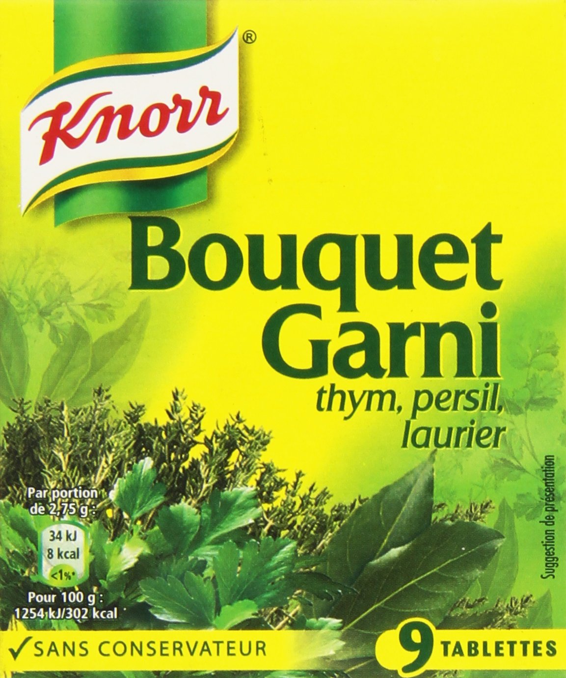 Discover the Knorr bouquet garni, traditionally composed of a balanced blend of thyme, parsley and bay leaf. It brings the subtle flavor of aromatic herbs to all your dishes. Dehydrated seasoning. For your health, practice regular physical activity. No need to add salt. INGREDIENTS Ingredients: salt, flavor enhancer: sodium glutamate, vegetable fats (palm, fully hydrogenated palm), vegetables (onion, leek), herbs (celery seeds, thyme: 1 , parsley: 0.9 , bay leaf: 0.5 ), potato starch, sugar, flavorings, yeast extract. Allergens: Celery DISCLAIMER Photography not contractual. The above information is provided for information purposes only. They are not necessarily exhaustive and cannot replace the information appearing on the product packaging, which alone is authentic and to which you are invited to refer, particularly in the event of food intolerance. The 99g box. Découvrez le bouquet garni Knorr, composé selon la tradition d'un mélange équilibré de thym, de persil et de laurier. Il apporte à tous vos plats la saveur subtile des herbes aromatiques. Assaisonnement déshydraté. Pour votre santé, pratiquez une activité physique régulière.Inutile de saler. INGRÉDIENTS Ingrédients : sel, exhausteur de gout : glutamate de sodium, graisses végétales (palme, palme totalement hydrogénée), légumes (oignon, poireau), aromates (graines de CELERI, thym : 1 , persil : 0,9 , laurier : 0,5 ), fécule de pomme de terre, sucre, aromes, extrait de levure. Allergènes : Céleri CLAUSE DE NON-GARANTIE Photographie non contractuelle. Les indications ci-dessus sont données à titre d'information. Elles ne sont pas forcément exhaustives et ne sauraient se substituer aux informations figurant sur l'emballage du produit qui font seules foi, et auxquelles vous êtes invités a vous reporter,notamment en cas d'intolérance alimentaire. La boîte de 99g.