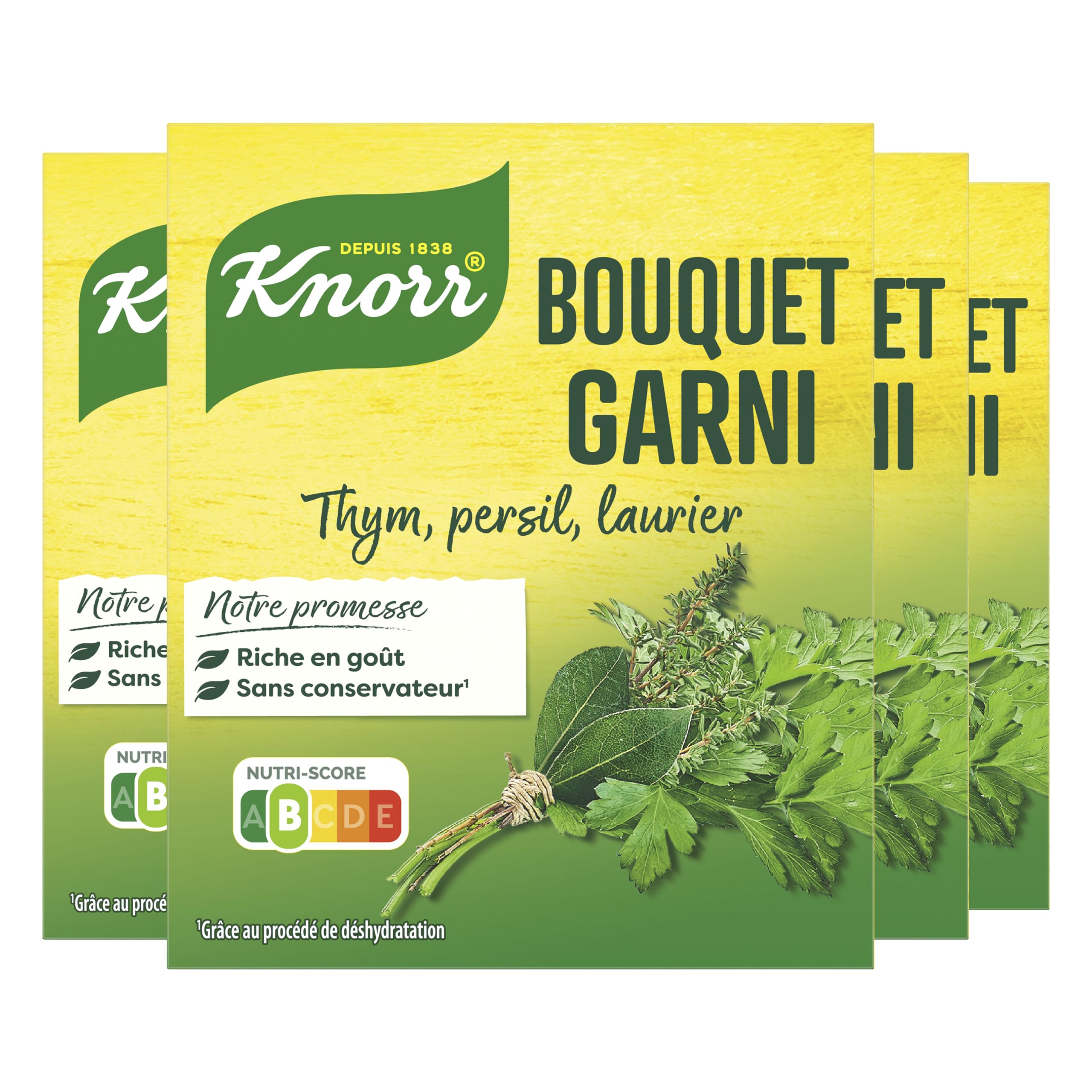 The Knorr Bouquet Garni Thyme Parsley Bouillon will bring to your dishes all the subtle flavor of a fresh bouquet garni Composed according to tradition, this court broth combines thyme, parsley and bay leaf for a fresh blend of aromatic herbs This broth is ideal for adding a twist to your pasta, your rice, your sauced dishes or even your braised vegetables and meats, simply and quickly Prepared without preservatives, in compliance with regulations, it will quickly become a must-have in your kitchen! Wake up your preparations in a few minutes: add a stock cube to your preparation at the start of cooking, it melts in the blink of an eye No need to add salt Enhance your dishes, soups and soups with Knorr broths and culinary aids The secret to perfectly seasoned and tastier dishes Prepared without preservatives, without flavor enhancers and without coloring, Knorr broths will quickly become your secret to ever tastier cooking Knorr is working for a sustainable food future for you and the planet: More than 95 of our agricultural ingredients are already grown sustainably We now want to act to gradually change our diet towards more diversity, more plants and more vegetables. Through our products, recipes and advice, we want to help you make small daily changes that make all the difference Together, let's build a better food future! INGREDIENTS salt, flavor enhancer: sodium glutamate, vegetable fats (palm, fully hydrogenated palm), vegetables (onion, leek), herbs (CELERY seeds, thyme: 1 , parsley: 0.9 , bay leaf 0.5 ), potato starch, sugar, flavors, yeast extract.Revive your dishes in just a few minutes: add a stock cube to your dish at the beginning of cooking, it melts in the blink of an eye. Discover Knorr Bouquet Garni Bouillon in its 9 stock cube format. This stock cube is prepared without preservatives. This Knorr stock cube is ideal for adding a twist to your pasta, rice, dishes with sauces, or even braised vegetables and meats. Also discover other Knorr Broths and Cooking Aids such as Knorr Court Bouillon or Knorr Vegetable Stock Pot. Knorr Bouquet Garni Thyme Parsley Bouillon will bring all the subtle flavor of a fresh bouquet garni to your dishes. Le Bouillon Bouquet Garni Thym Persil Knorr apportera à vos plats toute la saveur subtile d'un bouquet garni frais Composé selon la tradition, ce court bouillon associe thym, de persil et de laurier pour un mélange frais d'herbes aromatiques Ce bouillon est idéal pour twister vos pâtes, votre riz, vos plats en sauces ou même vos légumes et viandes braisés, simplement et rapidement Préparé sans conservateur, dans le respect de la réglementation, il deviendra rapidement un incontournable de votre cuisine ! Réveillez vos préparations en quelques minutes : ajoutez un bouillon cube dans votre préparation en début de cuisson, elle fond en un clin d'œil Inutile de saler Rehaussez vos plats, potages et soupes avec les bouillons et aides culinaires Knorr Le secret pour des plats parfaitement assaisonnés et plus savoureux Préparés sans conservateurs, sans exhausteur de goût et sans colorant, les bouillons Knorr deviendront vite votre secret pour une cuisine toujours plus savoureuse Knorr travaille pour un futur alimentaire durable pour vous et la planète : Plus de 95 de nos ingrédients agricoles sont déjà cultivés de manière durable Nous voulons maintenant agir pour changer progressivement notre alimentation vers plus de diversité, plus de végétal et plus de légumes Grâce à nos produits, recettes et conseils, nous souhaitons vous aider à faire des petits changements quotidiens qui font toute la différence Ensemble construisons un meilleur futur alimentaire ! INGRÉDIENTS sel, exhausteur de goût : glutamate de sodium, graisses végétales (palme, palme totalement hydrogénée), légumes (oignon, poireau), aromates (graines de CÉLERI, thym : 1 , persil : 0,9 , laurier 0,5 ), fécule de pomme de terre, sucre, arômes, extrait de levure.Réveillez vos préparations en quelques minutes : ajoutez un bouillon cube dans votre préparation en début de cuisson, elle fond en un clin d'œil. Découvrez le Bouillon Bouquet Garni Knorr dans son format 9 bouillons cubes. Ce bouillon cube est préparé sans conservateur. Ce bouillon cube Knorr est idéal pour twister vos pâtes, votre riz, vos plats en sauces ou même vos légumes et viandes braisés. Découvrez également les autres Bouillons et Aides culinaires Knorr comme le Court Bouillon Knorr ou encore la Marmite de Bouillons de légumes Knorr. Le Bouillon Bouquet Garni Thym Persil Knorr apportera à vos plats toute la saveur subtile d'un bouquet garni frais.