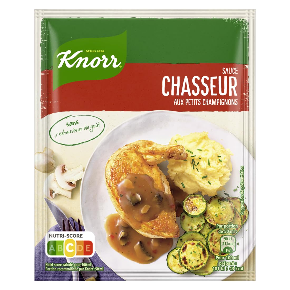Discover Knorr Chasseur dehydrated sauce, an essential product that will become your little secret for even tastier dishes. With its rich, delicious and creamy texture, it will be a delicious accompaniment to sliced poultry, rabbit fricassee or pork stir-fry! This sauce is prepared without flavor enhancers, artificial coloring and preservatives. Enjoy a delicious sauce in just a few minutes: Dissolve the contents of the sachet in 200 ml of cold water. Bring to a boil, then reduce heat and stir regularly for 1 minute. Also discover our other essential Knorr dehydrated sauces: Béchamel, Pepper sauce, Sorrel. Knorr is working for a sustainable food future for you and the planet: More than 95 of our agricultural ingredients are already grown sustainably. We now want to act to gradually change our diet towards more diversity, more plants and more vegetables. Through our products, recipes and advice, we want to help you make small daily changes that make all the difference. Together let's build a better food future!Discover the rest of our range of Knorr dehydrated sauces: Bechamel, Lemon Butter, Sorrel. Enjoy a delicious sauce in just a few minutes: Dissolve the contents of the sachet in 200 ml of cold water. Bring to a boil, then reduce the heat and stir regularly for 1 minute. This mushroom sauce is prepared without flavor enhancers or colorings. This Knorr sauce is ideal for deliciously accompanying sliced poultry, rabbit fricassee or pork sauté. Fall for the Chasseur sauce, a tasty sauce with small mushrooms. Discover the Knorr Chasseur dehydrated sauce with small mushrooms, an essential product that will become your little secret for even more delicious dishes! Découvrez la sauce déshydratée Chasseur de Knorr , un produit incontournable qui deviendra votre petit secret pour des plats encore plus savoureux. Avec sa texture riche, gourmande et onctueuse, elle accompagnera avec délice un émincé de vollaile, un fricassé de lapin ou un sauté de porc ! Cette sauce est préparée sans exhausteur de goût, sans colorant artificiel et sans conservateur. Profitez d'une sauce gourmande en quelques minutes : Délayez le contenu du sachet dans 200 ml d'eau froide. Portez à ébullition, puis baissez le feu et tournez régulièrement pendant 1 minute. Découvrez aussi nos autres sauces déshydratées incontournables Knorr : Béchamel, Sauce au poivre, Oseille. Knorr travaille pour un futur alimentaire durable pour vous et la planète : Plus de 95 de nos ingrédients agricoles sont déjà cultivés de manière durable. Nous voulons maintenant agir pour changer progressivement notre alimentation vers plus de diversité, plus de végétal et plus de légumes. Grâce à nos produits, recettes et conseils, nous souhaitons vous aider à faire des petits changements quotidiens qui font toute la différence. Ensemble construisons un meilleur futur alimentaire !Découvrez le reste de notre gamme de sauces déshydratées Knorr : Bechamel, Beurre Citron, Oseille. Profitez d'une sauce gourmande en quelques minutes : Délayez le contenu du sachet dans 200 ml d'eau froide. Portez à ébullition, puis baissez le feu et tournez régulièrement pendant 1 minute. Cette sauce champignon est préparée sans exhausteur de goût et sans colorant. Cette sauce Knorr est idéale pour accompagner avec délice un émincé de vollaile, un fricassé de lapin ou un sauté de porc. Fondez pour la sauce Chasseur, une sauce savoureuse aux petits champignons. Découvrez la sauce déshydratée Chasseur aux petits champignons Knorr , un produit incontournable qui deviendra votre petit secret pour des plats encore plus savoureux !.