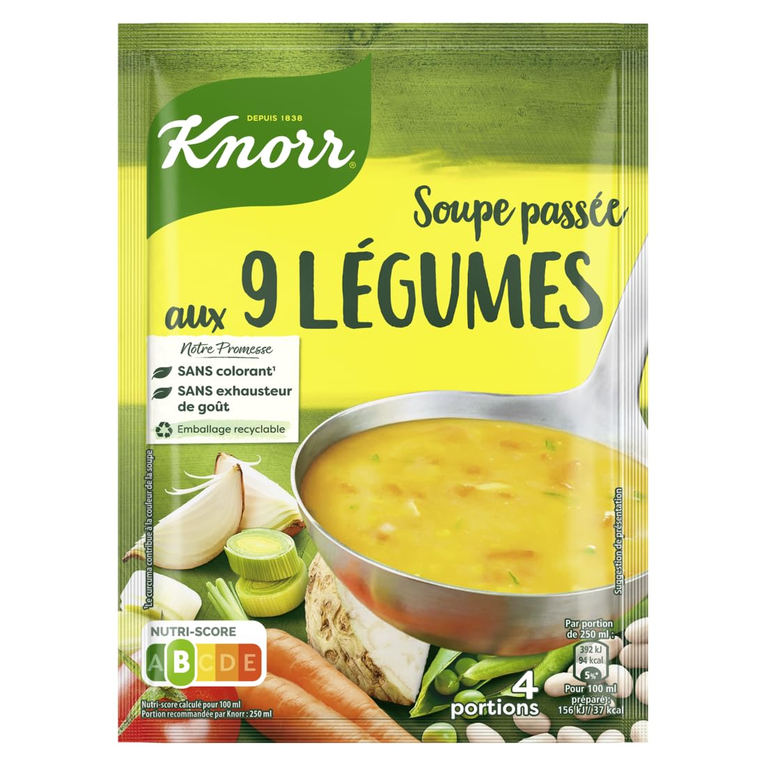 Thanks to a mixture of beautiful vegetables and quality ingredients, these generous vegetable soups with a unique taste will delight the whole family. Knorr chefs created this Passée aux 9 Vegetables dehydrated soup that combines flavorful vegetables in a convenient format. This recipe is cooked with vegetables - potatoes, carrots, white beans, onions, celeriac, leeks, tomatoes, green beans and turnips - from sustainable agriculture. It is prepared without flavor enhancers, coloring or preservatives, in compliance with regulations. A tasty soup for 4 and ready in 5 minutes: boil 1 L of water then pour in the contents, stirring gently over low heat. All you have to do is enjoy a comforting vegetable soup! Do you know what dehydration is? Dehydration is simply removing water from a food. This method of preservation was already used more than 14,000 years ago to preserve herbs, roots or meat. Even today we consume dehydrated ingredients such as coffee, pasta, cured ham or soup. A dehydrated soup is a soup made from the same raw materials as a liquid soup, but once dehydrated, they are reduced to a powder state. We then add the other ingredients constituting the recipe such as spices and aromatics. Then, all these elements are carefully mixed and then put into bags. Carl Heinrich Knorr, founder of the Knorr brand, was one of the first to integrate this process into the manufacture of his soups, more than 175 years ago. Indeed, Knorr was born in 1838 from a single passion, that of taste. It all starts with carefully selected ingredients. We do everything we can to ensure our vegetables are full of flavor. These ingredients are then cooked by a host of passionate chefs. They draw inspiration from their experiences, stemming from their experiences or the present, but also from interaction with other cultures. At Knorr we are also convinced that responsible use of agricultural resources contributes to offering you quality soups. This is why we choose vegetables from sustainable agriculture and grown in open fields to prepare our delicious soups for you. To make good dishes, you need healthy crops, planted in rich and fertile soil, where a farmer respectful of nature undertakes to take care of them until they reach maturity. INGREDIENTS Ingredients: potato²: 44 , carrot²: 9.8 , white bean²: 9.4 , onion²: 7.4 , salt, CELERY RAB²: 4.5 , smoked bacon (pork fat, smoke), leek²: 3.8 , palm fat, tomato²: 2.5 , green beans²: 1.9 , yeast extract, glucose syrup, flavorings, spices and herbs (CELERY leaf, turmeric), MILK proteins, turnip²: 0.1 , antioxidant: E 320. May contain: oats, wheat, mustard, egg, barley, rye, sesame, soy. ²Vegetables from sustainable agriculture. 83 vegetables² (including potatoes). DIRECTIONS FOR USE To prepare 4 bowls: 1) Pour the contents of the sachet into 1 L of cold water, then bring the soup to a boil, stirring with a whisk. 2) Reduce heat to low and simmer for 5 minutes, stirring occasionally. No need to add salt. Enjoy your food ! DISCLAIMER Non-contractual photography. The above indications are given for information purposes. They are not necessarily exhaustive and cannot replace the information appearing on the product packaging which alone is authentic, and to which you are invited to refer, particularly in the event of food intolerance. Discover other Knorr everyday recipes like Cream of Vegetable Soup and Leek and Mixed Vegetable Strained Soup. Dehydrating our soups is one of the oldest methods of food preservation: it involves removing water from ingredients to preserve their quality and flavor. A delicious soup for 4 and ready in 5 minutes: boil 1 L of water then pour the contents over low heat, stirring gently. All that's left is to enjoy. This soup is prepared without flavor enhancers, colorings, or preservatives, in compliance with regulations. This recipe is cooked with vegetables—potato, carrot, white bean, onion, celeriac, leek, tomato, green bean, and turnip—from sustainable agriculture. Knorr chefs have created this delicious dehydrated soup, Passée aux 9 Légumes, which combines flavorful vegetables in a convenient format. Grâce un mélange de beaux légumes et d'ingrédients de qualité, ces soupes de légumes généreuses au goût unique feront la joie de toute la famille. Les chefs Knorr ont créé cette soupe déshydratée Passée aux 9 Légumes qui marie les légumes savoureux dans un format pratique. Cette recette est cuisinée avec des légumes -pomme de terre, carotte, haricot blanc, oignon, céleri-rave, poireaux, tomate, haricot vert et navet- issus de l'agriculture durable. Elle est préparée sans exhausteur de goût, sans colorant et sans conservateur, dans le respect de la réglementation. Un potage savoureux pour 4 et prêt en 5 minutes : faites bouillir 1 L d'eau puis versez le contenu en mélangeant doucement à feux doux. Il n'y a plus qu'à déguster une soupe de légume réconfortante ! Savez-vous ce qu'est la déshydratation ? La déshydratation consiste simplement à enlever l'eau d'un aliment. Ce mode de conservation était déjà utilisé il y a plus de 14 000 ans pour conserver des herbes, des racines ou de la viande. Encore aujourd'hui nous consommons des ingrédients déshydratés comme du café, des pâtes, du jambon sec ou de la soupe. Une soupe déshydratée est une soupe constituée des mêmes matières premières que celles d'une soupe liquide, mais une fois déshydratées, elles sont réduites à l'état de poudre. On y ajoute alors les autres ingrédients constituant la recette tels que les épices et les aromates. Ensuite, tous ces éléments sont soigneusement mélangés puis mis en sachet. Carl Heinrich Knorr, fondateur de la marque Knorr, fut l'un des premiers à intégrer ce procédé dans la fabrication de ses soupes, il y a plus de 175 ans. En effet, Knorr est née en 1838 d'une seule passion, celle du goût. Tout commence avec des ingrédients soigneusement sélectionnés. Nous mettons tout en œuvr
