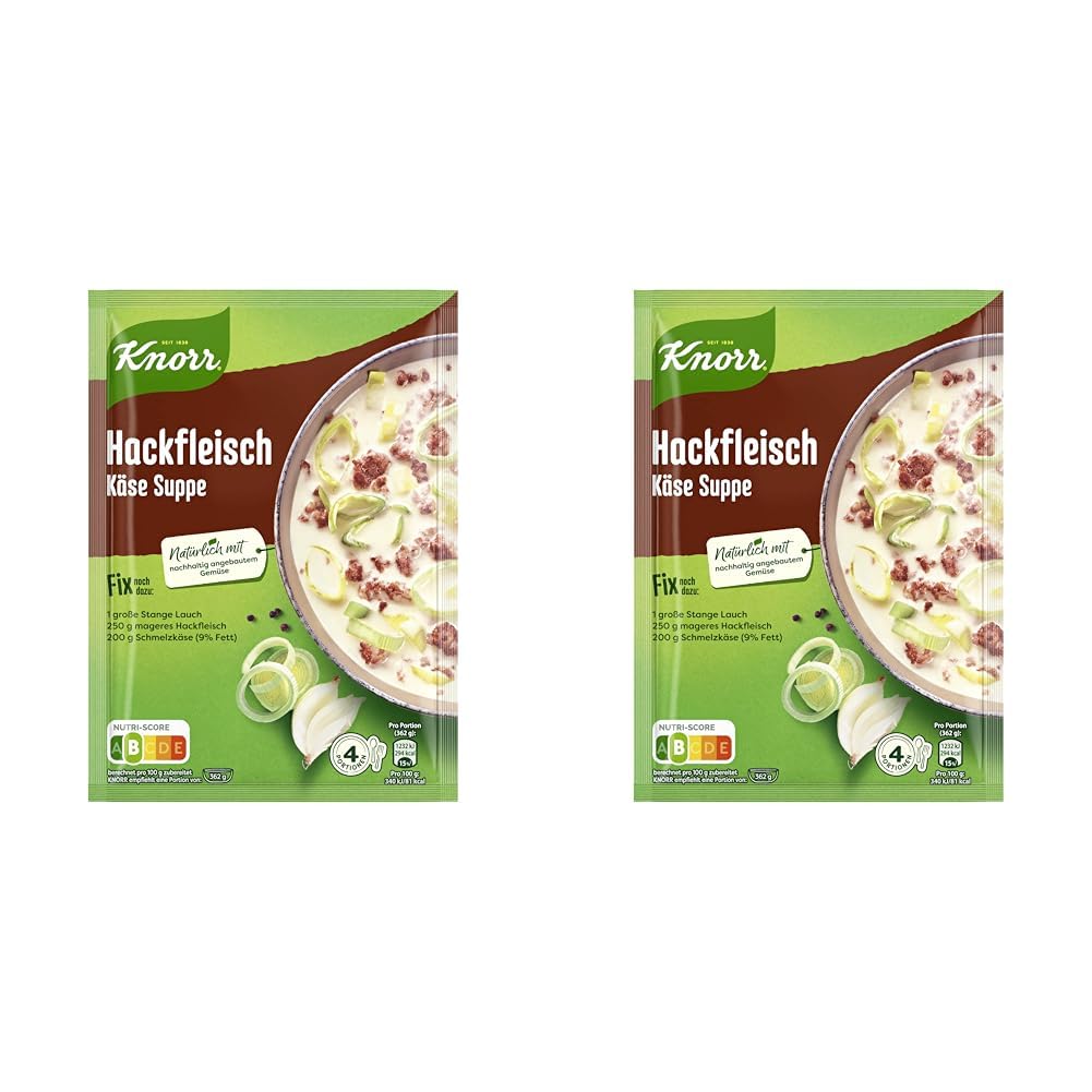 Ingredients / ingredients Ingredients: 40% potatoes², starch, 12% onion², vegetable oils (sunflowers, maizeimus), iodized dining salt, maltodextrin, spice, 2.5% leek powder², dining salt, aromas, milk sugar, milk protein, spinach powder², spices (pepper, turmeric, parsley root), White wine extract, yeast extract.Can contain egg, celery, mustard, soy, gluten -containing grain.² Aus sustainable cultivation. Instructions And so it works: 1) Cleaning and washing 1 large bar leek (cleaned approx. 400 g).Cut them into fine rings.Brate 250 g of lean minced meat in 1 tablespoon of hot oil.Add the leek and briefly steam it.2) Pour 750 ml of water, stir in the fix and let the soup bring to the boil while stirring.Stir 200 g of melting cheese (9% fat) under.3) Let the soup cover for about 15 minutes.Stir around from time to time.Bread or baguette fits very well. Warnings No More Knorr fixed base minced meat cheese soup succeeds in no time at all.The Knorr minced meat cheese soup seasoning mix is ??also suitable for a vegetarian dish with soy hack.Cook a delicious soup with hack with Knorr Fix, of course without taste -enhancing additives, with sustainably grown potatoes and onions.Knorr fixed meat cheese soup is a finely coordinated spice and herbal mix for a hearty and creamy-tender soup.With the seasoning mix Knorr fixed meat cheese soup easily and quickly conjure up a delicious and filling soup.Knorr fix minced meat cheese soup is the perfect seasoning mix for a delicious soup with minced meat.The following information applies to each unit per pack. INHALTSSTOFFE / ZUTATEN Zutaten: 40% Kartoffeln², Stärke, 12% Zwiebeln², pflanzliche Öle (Sonnenblumen, Maiskeim), jodiertes Speisesalz, Maltodextrin, Würze, 2,5% Lauchpulver², Speisesalz, Aromen, MILCHZUCKER, MILCHEIWEISS, Spinatpulver², Gewürze (Pfeffer, Kurkuma, Petersilienwurzel), Weißweinextrakt, Hefeextrakt. Kann Ei, Sellerie, Senf, Soja, glutenhaltige Getreide enthalten. ²aus nachhaltigem Anbau. GEBRAUCHSANWEISUNG Und so geht's: 1) Putze und wasche 1 große Stange Lauch (geputzt ca. 400 g). Schneide sie in feine Ringe. Brate 250 g mageres Hackfleisch in 1 EL heißem Öl an. Gib den Lauch dazu und dünste ihn kurz mit. 2) Gieße 750 ml Wasser dazu, rühre das Fix ein und lass die Suppe unter Rühren aufkochen. Rühre 200 g Schmelzkäse (9% Fett) unter. 3) Lass die Suppe zugedeckt ca. 15 Min. köcheln. Rühre ab und zu um. Dazu passt sehr gut Brot oder Baguette. WARNHINWEISE Nein MehrKnorr Fix Würzbasis Hackfleisch Käse Suppe gelingt im Handumdrehen. Die Knorr Hackfleisch Käse Suppe Würzmischung ist auch für ein vegetarisches Gericht mit Soja-Hack geeignet. Mit Knorr Fix zeitsparend eine leckere Suppe mit Hack kochen, natürlich ohne geschmacksverstärkende Zusatzstoffe, mit nachhaltig angebauten Kartoffeln und Zwiebeln. Knorr Fix Hackfleisch Käse Suppe ist eine fein abgestimmte Gewürz- und Kräutermischung für eine herzhaft und cremig-zarte Suppe. Mit der Würzmischung Knorr Fix Hackfleisch Käse Suppe einfach und schnell eine leckere und sättigende Suppe zaubern. Knorr Fix Hackfleisch Käse Suppe ist die perfekte Würzmischung für eine leckere Suppe mit Hackfleisch. Die folgenden Informationen gelten für jede Einheit pro Packung.Knorr Fix Würzmischung Hackfleisch Käse Suppe für eine leckere Suppe mit Hack ohne geschmacksverstärkende Zusatzstoffe,58g (2er Pack) 58 g (2er Pack)