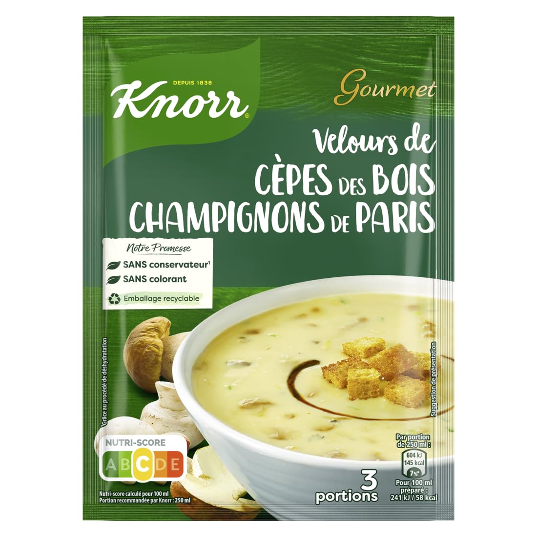 Discover the delicious Cream of Vegetable Soup from Knorr, this recipe is cooked with vegetables – potato, carrot, onion, tomato, peas, celery root and leek – from sustainable agriculture. A real treat for the whole family. A soup prepared with vegetables from sustainable agriculture, without coloring or flavor enhancers. Thanks to the dehydration process, it is also preservative-free. Do you know what dehydration is? Contrary to popular belief, dehydration has existed since the dawn of time: it is one of the oldest methods of preserving food! A dehydrated soup is a soup made from dehydrated ingredients reduced to powder. The raw materials are the same as in a traditional soup to cook, but they have received special treatment to remove the water they contain. Carl Heinrich Knorr, founder of the Knorr brand, was one of the first to integrate this process into the manufacture of his soups, more than 175 years ago. A comforting soup recipe ready in 5 minutes: Pour the contents of the sachet into 1 L of cold water then bring to the boil. Leave to simmer for 5 minutes. It's ready! Discover the other Knorr vegetable soups. Knorr is working towards a sustainable food future for you and the planet. INGREDIENTS Ingredients: palm fat, potato starch, WHEAT flour, salt, button mushroom²: 5 , yeast extract, lactose (MILK), grilled onion², MILK proteins, potassium chloride, porcini mushroom²: 2 , maltodextrin, yellow boletus: 1.5 , sugar, balsamic vinegar: 0.6 (wine vinegar, grape must), spice and aromatics (garlic, chives², nutmeg), spring onion², concentrated onion juice², natural pepper flavor, sunflower oil. May contain: other cereals containing gluten, celery, mustard, egg, soy. ²Ingredients from sustainable agriculture: 11 . DIRECTIONS FOR USE To prepare 3 bowls: 1) Pour the contents of the sachet into 750 ml of cold water, then bring the soup to the boil, stirring with a whisk. 2) Reduce heat to low and simmer for 3 minutes, stirring occasionally. No need to add salt. Enjoy your food ! Thanks to a blend of beautiful vegetables and quality ingredients, these generous Knorr vegetable soups with a unique taste will delight the whole family. A comforting soup recipe ready in 5 minutes: Pour the contents of the sachet into 1 L of cold water and bring to a boil. Simmer for 5 minutes. It's ready. But what is dehydration? It involves removing water from the ingredients in our soups to preserve their quality and flavor without adding preservatives. Découvrez la délicieuse Soupe crème de légumes de Knorr , cette recette est cuisinée avec des légumes — pomme de terre, carotte, oignon, tomate, petits pois, céleri-rave et poireau — issus de l'agriculture durable. Un vrai régal pour toute la famille. Une soupe préparée avec des légumes issus de l'agriculture durable, sans colorant ni exhausteur de gout. Grâce au procédé de déshydratation, elle est également sans conservateur. Savez-vous ce qu'est la déshydratation ? Contrairement aux idées reçues, la déshydratation existe depuis la nuit des temps : c'est l'une des plus anciennes méthodes de préservation des aliments ! Une soupe déshydratée est une soupe constituée d'ingrédients déshydratés réduits en poudre. Les matières premières sont les mêmes que dans une soupe traditionnelle à cuire, mais elles ont reçu un traitement spécial afin de retirer l'eau qu'elles contiennent. Carl Heinrich Knorr , fondateur de la marque Knorr , fut l'un des premiers à intégrer ce procédé dans la fabrication de ses soupes, il y a plus de 175 ans. Une recette de soupe réconfortante prête en 5 minutes : Versez le contenu du sachet dans 1 L d'eau froide puis portez à ébullition. Laissez mijoter 5 min. C'est prêt ! Découvrez les autres soupes de légumes Knorr . Knorr travaille pour un futur alimentaire durable pour vous et la planète. INGRÉDIENTS Ingrédients : graisse de palme, amidon de pomme de terre, farine de BLÉ, sel, champignon de Paris² : 5 , extrait de levure, lactose (LAIT), oignon grillé², protéines de LAIT, chlorure de potassium, cèpe² : 2 , maltodextrine, bolet jaune : 1,5 , sucre, vinaigre balsamique : 0,6 (vinaigre de vin, moût de raisin), épice et aromates (ail, ciboulette², noix de muscade), oignon de printemps², jus d'oignon concentré², arôme naturel de poivre, huile de tournesol. Peut contenir : autres céréales contenant du gluten, céleri, moutarde, œuf, soja. ²Ingrédients issus de l'agriculture durable : 11 . MODE D'EMPLOI Pour préparer 3 bols : 1) Versez le contenu du sachet dans 750 ml d'eau froide, puis portez la soupe à ébullition en remuant avec un fouet. 2) Ramenez à feu doux et laissez mijoter 3 minutes en remuant de temps en temps. Inutile de saler. Bon appétit ! Grâce un mélange de beaux légumes et d'ingrédients de qualité, ces soupes Knorr de légumes, généreuses, au goût unique feront la joie de toute la famille. Une recette de soupe réconfortante prête en 5 minutes : Versez le contenu du sachet dans 1 L d'eau froide puis portez à ébullition. Laissez mijoter 5 min. C'est prêt. Mais, c'est quoi la déshydratation ? Cela consiste à retirer l'eau des ingrédients de nos soupes afin de conserver leur qualité et leur saveur sans ajout de conservateur.