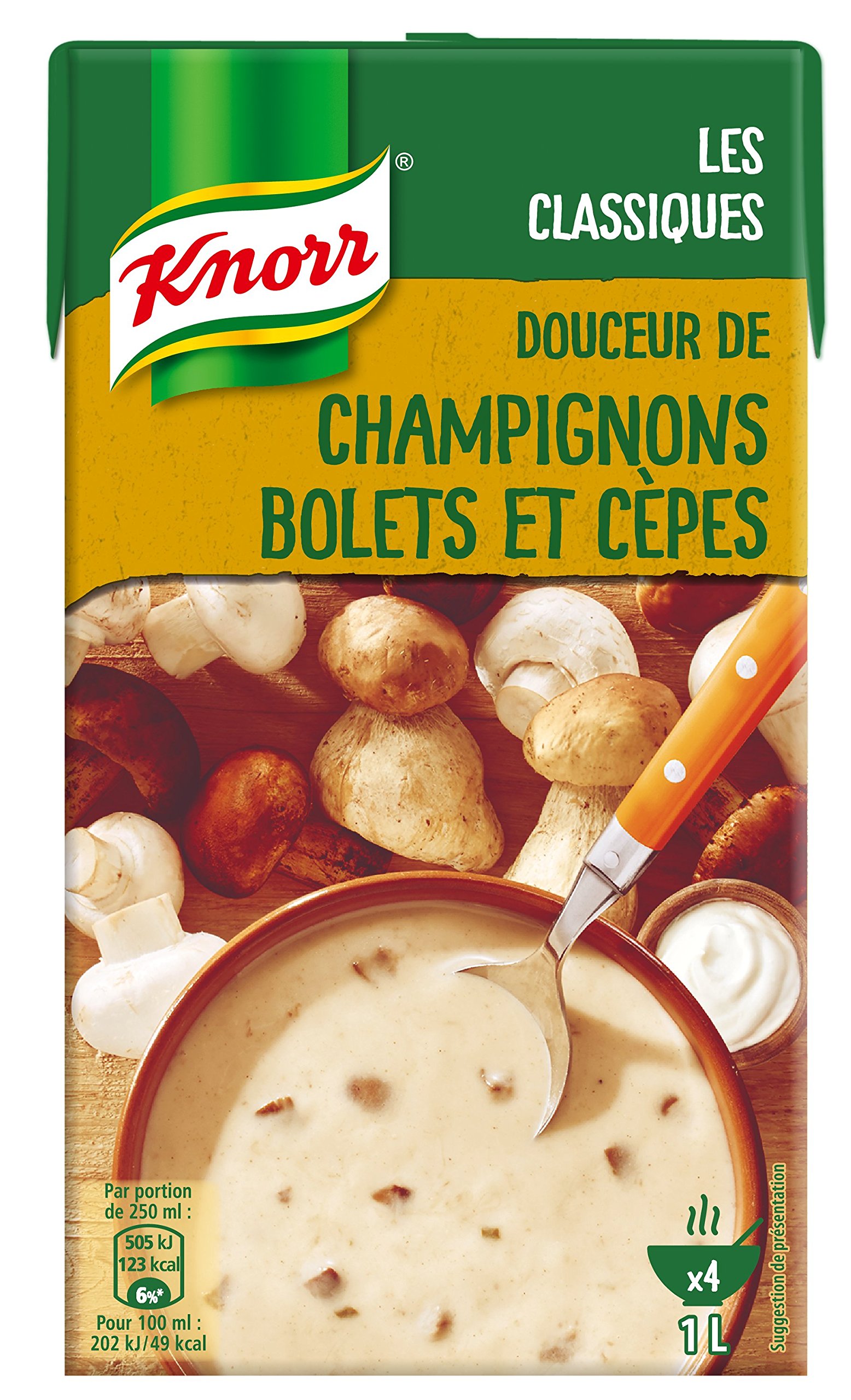 To concoct this treat for you, the Knorr chefs have combined authentic button mushrooms with boletus and porcini mushrooms to obtain a tasty and creamy soup. A unique pleasure! Knorr products are present in many countries, all over the world. We are very proud of the authentic perception of local flavors that we have acquired, to offer you products with remarkable taste and help you taste the authentic flavors of other cultures. In 1957, Knorr brand flagship products, such as stock cubes and soups, were sold in eight countries and by 2000, Knorr products were sold in nearly 90 countries around the world. That same year marked a turning point in the brand's history, when Knorr joined the Unilever family. The best quality is our philosophy when it comes to food. A philosophy applied for many decades. Our story begins in 1838, when Carl Heinrich Knorr opened a factory in Heilbronn, Germany, supplying chicory to coffee manufacturers. He then began experimenting with dehydrating vegetables and seasonings to preserve their flavor. This is how the first Knorr dehydrated soups were launched throughout continental Europe in 1873. A discovery that opened the way to progress. In 1889 a pea soup was launched, and in 1908 our sauce mix, a real feat at the time, on the European market. Creativity and a spirit of innovation have always driven our chefs. INGREDIENTS OUR RECIPE Ingredients: water, CREAM: 7 , button mushroom¹: 6 , boletus: 3 , modified corn starch, porcini mushroom: 2.6 , WHEAT flour, grilled onion¹, salt, sunflower oil, herbs (shallot, chives¹, garlic), yeast extract, sugar, concentrated mushroom juice, whey (MILK), onion extract, natural flavor of pepper. May contain: celery, mustard, egg. ¹Ingredients from sustainable agriculture: 7.1 . DIRECTIONS FOR USE PREPARATION TIPS: IN A CASSEROLE: 1. Shake the brick before opening it then pour the soup into a saucepan. 2. Reheat over low heat without bringing to a boil and stir occasionally. IN THE MICROWAVE OVEN: Pour the soup into a suitable container then reheat for a few moments. NO NEED TO SALT. DISCLAIMER Non-contractual photography. The above indications are given for information purposes. They are not necessarily exhaustive and cannot replace the information appearing on the product packaging which alone is authentic, and to which you are invited to refer, particularly in the event of food intolerance. Thin soup. This product contains 4 servings. Origin: Poland. Pour vous concocter cette douceur, les chefs Knorr ont marié d'authentiques champignons de Paris aux bolets et aux cèpes afin d'obtenir une soupe savoureuse et onctueuse. Un plaisir unique ! Les produits Knorr sont présents dans de nombreux pays, aux quatre coins de la planète. Nous sommes très fiers de la perception authentique des saveurs locales que nous avons acquise, pour vous offrir des produits au goût remarquable et vous aider à goûter les saveurs authentiques d'autres cultures. En 1957, les produits vedettes de la marque Knorr, comme le bouillon en cube et les soupes, étaient vendus dans huit pays et en 2000, les produits Knorr se vendaient dans près de 90 pays partout dans le monde. Cette même année a marqué un tournant dans l'histoire de la marque, lorsque Knorr a rejoint la famille Unilever. La meilleure qualité, telle est notre philosophie en matière d'alimentation. Une philosophie appliquée depuis bien des décennies. Notre histoire débute en 1838, lorsque Carl Heinrich Knorr ouvre une usine à Heilbronn, en Allemagne, dont l'activité consiste à fournir de la chicorée aux fabricants de café. Il commence alors à faire des expériences sur la déshydratation des légumes et des assaisonnements afin de préserver leur saveur. C'est ainsi que furent lancées les premières soupes déshydratées Knorr dans toute l'Europe continentale, en 1873. Une découverte qui a ouvert la voie du progrès. En 1889 a été lancée une soupe aux pois, et en 1908 notre mélange pour sauces, une véritable prouesse à l'époque, sur le marché européen. La créativité et l'esprit d'innovation ont toujours animé nos chefs. INGRÉDIENTS NOTRE RECETTE Ingrédients : eau, CRÈME fraîche : 7 , champignon de Paris¹ : 6 , bolet : 3 , amidon modifié de maïs, cèpe : 2,6 , farine de BLÉ, oignon grillé¹, sel, huile de tournesol, aromates (échalote, ciboulette¹, ail), extrait de levure, sucre, jus de champignon concentré, lactosérum (LAIT), extrait d'oignon, arôme naturel de poivre. Peut contenir : céleri, moutarde, œuf. ¹Ingrédients issus de l'agriculture durable : 7,1 . MODE D'EMPLOI CONSEILS DE PRÉPARATION : À LA CASSEROLE : 1. Secouer la brique avant de l'ouvrir puis verser la soupe dans une casserole. 2. Réchauffer à feu doux sans porter à ébullition et remuer de temps en temps. AU FOUR MICRO-ONDES : Verser la soupe dans un récipient adapté puis réchauffer quelques instants. INUTILE DE SALER. CLAUSE DE NON-GARANTIE Photographie non contractuelle. Les indications ci-dessus sont données à titre d'information. Elles ne sont pas forcément exhaustives et ne sauraient se substituer aux informations figurant sur l'emballage du produit qui font seules foi, et auxquelles vous êtes invités à vous reporter, notamment en cas d'intolérance alimentaire. Soupe liquide. Ce produit contient 4 portions. Origine : Pologne.