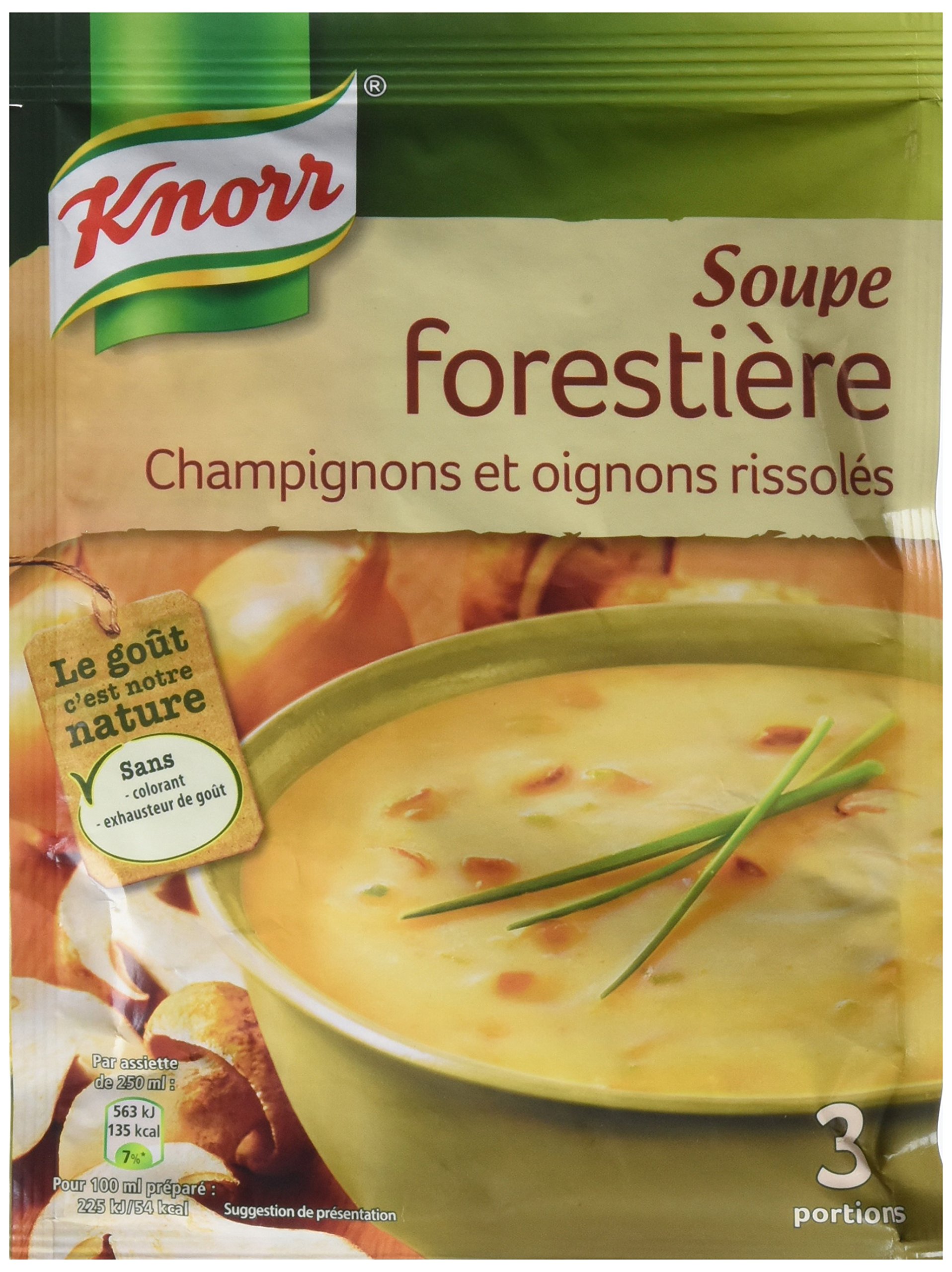 Discover Knorr's irresistible forest soup with a finely creamy texture, a unique combination of the woody flavor of boletus, the sweetness of browned onions and a pinch of chives. Knorr products are present in many countries, all over the world. We are very proud of the authentic perception of local flavors that we have acquired, to offer you products with remarkable taste and help you taste the authentic flavors of other cultures. In 1957, Knorr brand flagship products, such as stock cubes and soups, were sold in eight countries and by 2000, Knorr products were sold in nearly 90 countries around the world. That same year marked a turning point in the brand's history, when Knorr joined the Unilever family. The best quality is our philosophy when it comes to food. A philosophy applied for many decades. Our story begins in 1838, when Carl Heinrich Knorr opened a factory in Heilbronn, Germany, supplying chicory to coffee manufacturers. He then began experimenting with dehydrating vegetables and seasonings to preserve their flavor. This is how the first Knorr dehydrated soups were launched throughout continental Europe in 1873. A discovery that opened the way to progress. In 1889 a pea soup was launched, and in 1908 our sauce mix, a real feat at the time, on the European market. Creativity and a spirit of innovation have always driven our chefs.Brand: Knorr. Product type: PACKAGED_SOUP_AND_STEW. Knorr Forest Mushrooms for 3 people, 85 g, 10 pieces. Découvrez l'irrésistible soupe forestière de Knorr à la texture finement onctueuse, alliance unique de la saveur boisée du bolet, de la douceur sucrée des oignons rissolés et d'une pincée de ciboulette. Les produits Knorr sont présents dans de nombreux pays, aux quatre coins de la planète. Nous sommes très fiers de la perception authentique des saveurs locales que nous avons acquise, pour vous offrir des produits au goût remarquable et vous aider à goûter les saveurs authentiques d'autres cultures. En 1957, les produits vedettes de la marque Knorr, comme le bouillon en cube et les soupes, étaient vendus dans huit pays et en 2000, les produits Knorr se vendaient dans près de 90 pays partout dans le monde. Cette même année a marqué un tournant dans l'histoire de la marque, lorsque Knorr a rejoint la famille Unilever. La meilleure qualité, telle est notre philosophie en matière d'alimentation. Une philosophie appliquée depuis bien des décennies. Notre histoire débute en 1838, lorsque Carl Heinrich Knorr ouvre une usine à Heilbronn, en Allemagne, dont l'activité consiste à fournir de la chicorée aux fabricants de café. Il commence alors à faire des expériences sur la déshydratation des légumes et des assaisonnements afin de préserver leur saveur. C'est ainsi que furent lancées les premières soupes déshydratées Knorr dans toute l'Europe continentale, en 1873. Une découverte qui a ouvert la voie du progrès. En 1889 a été lancée une soupe aux pois, et en 1908 notre mélange pour sauces, une véritable prouesse à l'époque, sur le marché européen. La créativité et l'esprit d'innovation ont toujours animé nos chefs.Marque: Knorr. Type de produit : PACKAGED_SOUP_AND_STEW. Champignons Forestière Knorr pour 3 personnes, 85 g, 10 pièces.