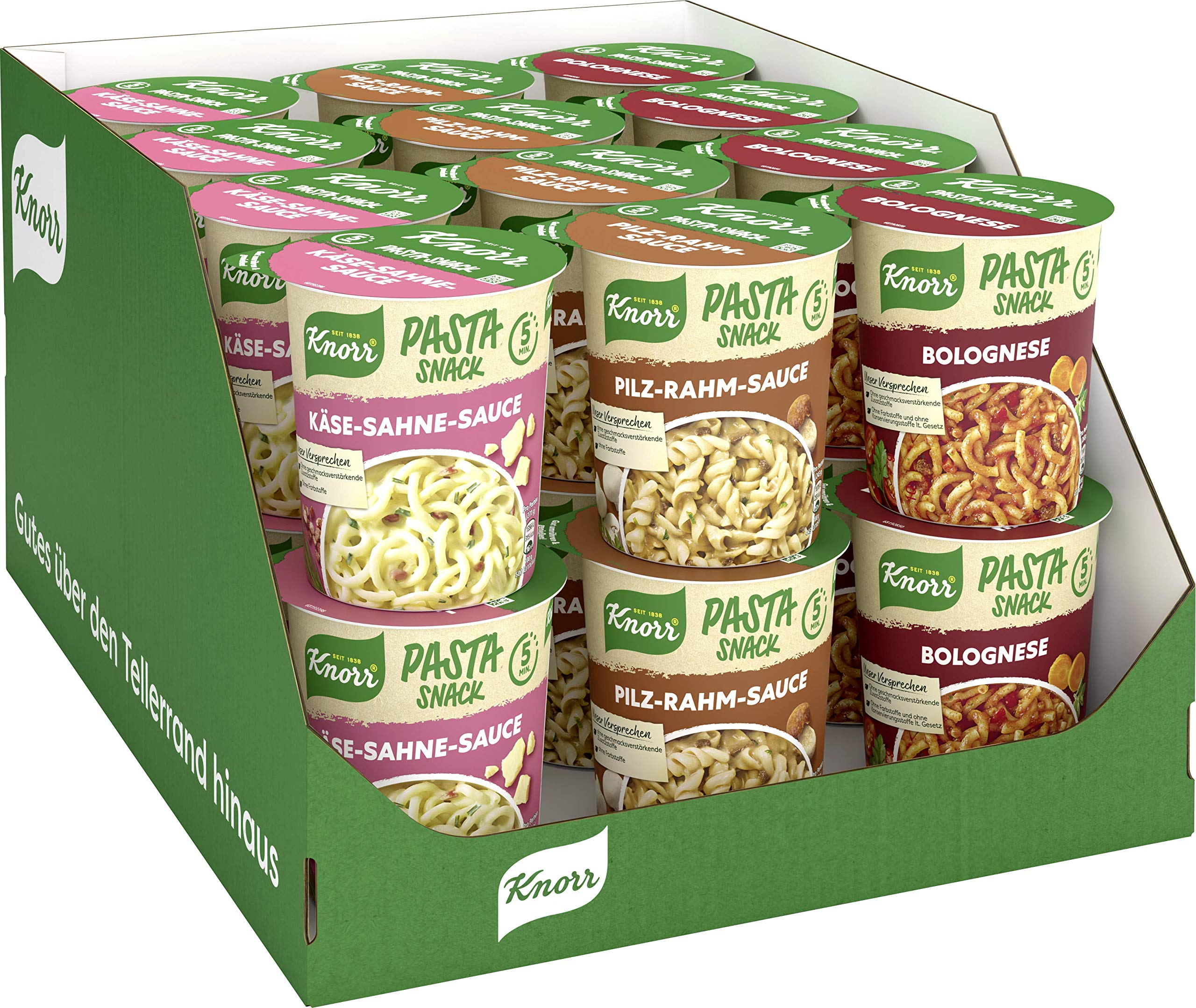 The Knorr pasta snack is the fast little meal for the office or when there is no time to cook at home.The cup is poured in with hot water and the finished dish is prepared within just 5 minutes.Knorr Pasta Snack's range of range contains 8x bolognese, 8x cheese cream sauce and 8x mushroom cream sauce.Preparation: Open the lid and pour boiling water until marking.Stir thoroughly and close the lid again.Let the snack pot steep for 5 minutes.Stir again well and a delicious pasta dish is ready in 5 minutes.In our diverse range we have creamy pasta snacks and hearty potato snacks.The lovers of rice snacks also get a taste of the exotic curry rice.In addition to the Rahm sauce pasta, a range of authentic Asian instant noodles also offers variety.Just take a break with the delicious snack cups or finished soups from Knorr.Knorr processes carefully dried ingredients, because drying is one of the oldest methods to naturally durable.Since the taste and nutrients of the fresh ingredients are largely preserved, food from dried ingredients fits perfectly into our stressful everyday life.Eating with Knorr is uncomplicated and also ensures a good feeling: Over 90 percent of the ingredients come from sustainable cultivation today.Because at Knorr, we believe that the use of sustainably grown and procured ingredients makes a big difference for the taste of our products, the well -being of farmers and the future of the planet.Knorr - good beyond the cup edge. Ingredients / ingredients Ingredients: 60% pasta (durum wheat semolina), 13% tomato powder³, palm oil, onion powder³, sugar, 1.8% beef, dining salt, 1.4% tomato³, aromas, yeast extract, table salt spaces ****, sea salt, carrot³, herbs (parsley³, Oregano), spices (garlic powder³, pepper), celery³, vegetable pepper, native olive oil extra, maltodextrin, egg clares.Can contain traces of milk, soy and mustard.**** obtained from natural potassium minerals.³ from sustainable cultivation. Ingredients: 60% pasta (durum wheat semolina, egg clares), potato thickness, 6% cream powder, palm oil, glucose syrup, aromas (with white wine aroma), dining salt, 2.1% mushrooms (1.4% mushrooms, stone mushroom powder, butter mushroom powder), yeast extract, onions, onions,Miilch proteins, table salt places, sugar, parsley, garlic, pepper.³ won from natural potassium minerals.Can contain traces of celery, soy and mustard. Ingredients: 58% durum wheat gravel giant, 12% cream powder, potato thickness, 5% melting cheese (blue cheese, hard cheese, crescenza - soft cheese, whey product), palm oil, glucose syrup, 2% bacon, pork, food salt,Rauch), sea salt, sugar, chives, flavors, milk protein, table salary ****, yeast extract, smoked bacon fat (bacon, food salt, smoke), roasted onion powder, curcuma.**** obtained from natural potassium minerals.Can contain traces of egg, celery, soy and mustard. Instructions 1. Open the lid.Pour boiling water until marking.2. Stir thoroughly and close the lid again.3. Let it steep for 5 minutes.Stir well again. Warnings No Address manufacturer/importer Unilever Deutschland Postfach 570 237, 22771 Hamburg More The Knorr Snack cups are available in many variants.Delicious instant pasta finished in just 5 minutes.Knorr Pasta Snack - of course without taste -enhancing additives, without preservatives (according to law) and without dyes.The instant noodles can only be prepared with hot water.The range of range contains eight snack cups from Knorr Pasta Snack Bolognese, cheese cream sauce and mushroom-cream sauce.Knorr pasta snack - the fast little meal for the office or for at home. Der Knorr Pasta Snack ist die schnelle kleine Mahlzeit für das Büro oder wenn zu Hause mal keine Zeit zum Kochen ist. Dabei wird der Becher mit heißem Wasser aufgegossen und innerhalb von nur 5 Minuten ist das Fertiggericht zubereitet. Der Sortimentskarton von Knorr Pasta Snack enthält 8x Bolognese, 8x Käse-Sahne-Sauce und 8x Pilz-Rahm-Sauce. Zubereitung: Deckel öffnen und mit kochendem Wasser bis zur Markierung aufgießen. Gründlich umrühren und Deckel wieder schließen. Den Snack Pot 5 Minuten ziehen lassen. Nochmals gut umrühren und in 5 Minuten ist ein leckeres Nudelgericht fertig. In unserem vielfältigen Sortiment haben wir cremige Pasta Snacks und herzhafte Kartoffel Snacks. Auch die Liebhaber von Reis Snacks kommen mit dem exotischen Curry Reis schnell auf den Geschmack. Abwechslung bietet neben dem Nudelgericht Rahm Sauce auch ein Sortiment von authentisch asiatischen Instant Nudeln. Einfach mal eine Auszeit mit den leckeren Snackbechern oder Fertigsuppen von Knorr nehmen. Knorr verarbeitet nur sorgfältig schonend getrocknete Zutaten, denn das Trocknen ist eine der ältesten Methoden, um Lebensmittel natürlich haltbar zu machen. Da der Geschmack und die Nährstoffe der frischen Zutaten weitgehend erhalten bleiben, passen Lebensmittel aus getrockneten Zutaten perfekt in unseren stressigen Alltag. Essen mit Knorr ist unkompliziert und sorgt darüber hinaus für ein gutes Gefühl: Über 90 Prozent der Zutaten kommen heute schon aus nachhaltigem Anbau. Denn wir bei Knorr glauben, dass die Verwendung nachhaltig angebauter und beschaffter Zutaten einen großen Unterschied für den Geschmack unserer Produkte, das Wohlbefinden der Landwirte und die Zukunft des Planeten macht. Knorr – Gutes über den Becherrand hinaus. INHALTSSTOFFE / ZUTATEN Zutaten: 60% Teigwaren (HARTWEIZENGRIESS), 13% Tomatenpulver³, Palmöl, Zwiebelpulver³, Zucker, 1,8% Rindfleisch, Speisesalz, 1,4% Tomaten³, Aromen, Hefeextrakt, Kochsalzersatz****, Meersalz, Karotten³, Kräuter (Petersilie³, Oregano), Gewürze (Knoblauchpulver³, Pfeffer), SELLERIE³, Gemüsepaprika, natives Olivenöl extra, Maltodextrin, EIKLARPULVER. Kann Spuren von Milch, Soja und Senf enthalten. ****gewonnen aus natürlichen Kaliummineralien. ³Aus nachhaltigem Anbau.Zutaten: 60% Teigwaren (HARTWEIZENGRIESS, EIKLARPULVER), Kartoffelstärke, 6% SAHNEPULVER, Palmöl, Glukosesirup, Aromen (mit Weissweinar