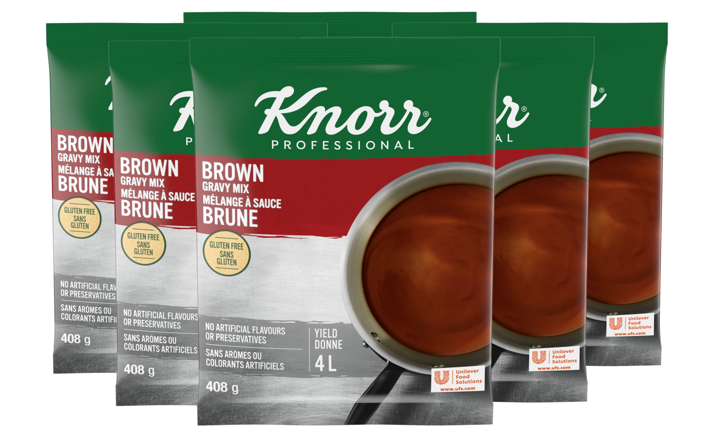 Developed specially for chefs, Knorr Brown Gravy Mix allows you to add classic flavour to your favourite dishes in just minutes. Vegetables and select seasonings combine to make a rich homestyle-tasting gravy to accompany your favourite meat, poultry, and side dish that is certain to impress your guests. The gravy comes in a dry format that is easy to prepare: simply whisk gravy mix in water, cook to 165 F (74 C) for 1 minute, and serve.Gluten-Free and Dairy-free. An ideal accompaniment for meat, poultry, and side dishes. Classic brown gravy takes only minutes to prepare. Combines vegetables and select seasonings to make a rich homemade tasting gravy. Vegan gluten-free brown gravy mix delivers best-in-class brown gravy flavour, Each bag yields 4L.