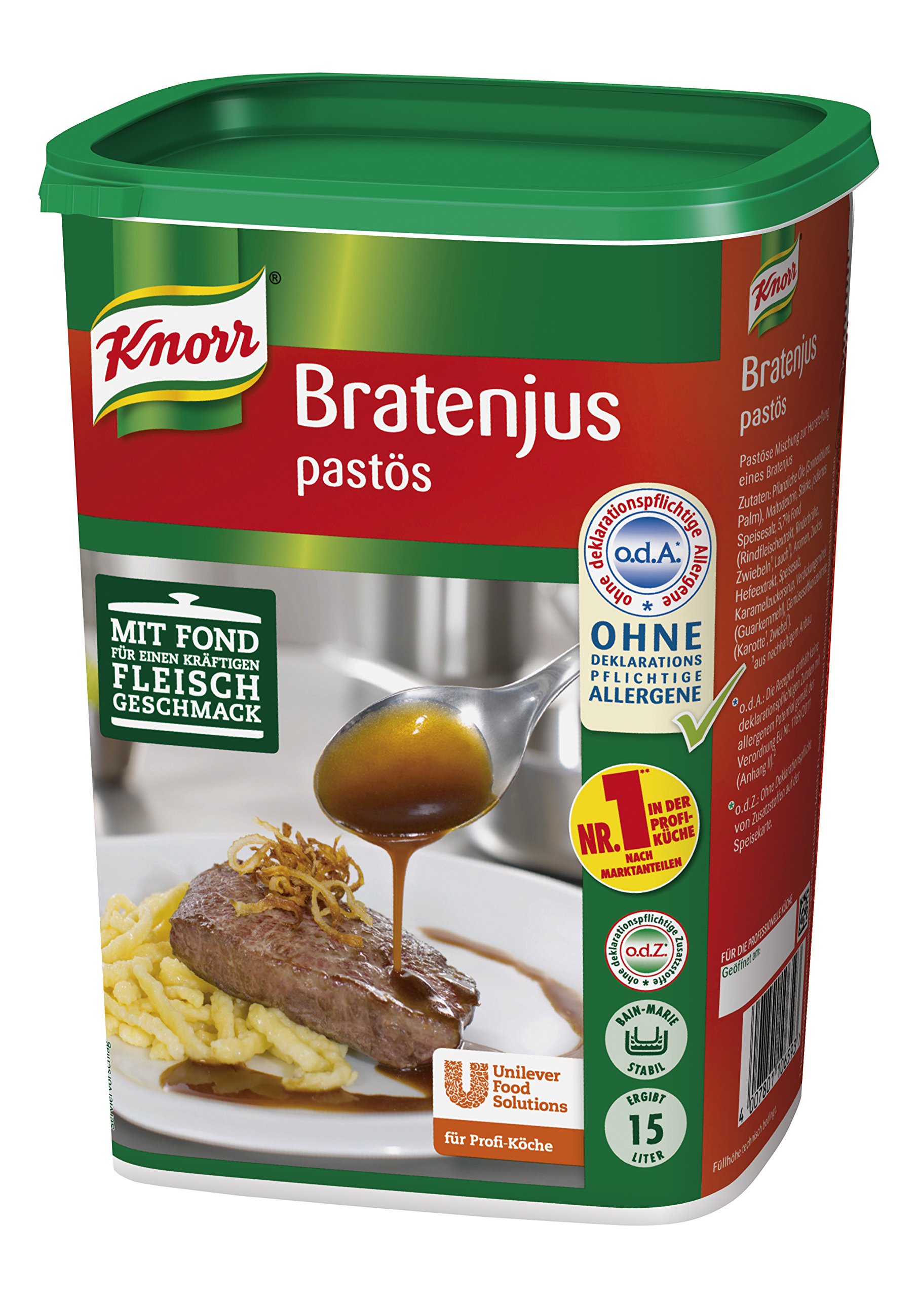 Braten jus with an intensive taste that gives every dish a special touch - in a variety of ways for various meat dishes. The roast jus pastös ensures an optimal and light binding and contains 5.7 stock. It does not contain any allergens that are subject to declaration according to recipe and no gluten -containing ingredients according to the recipe.The gravy also offers full taste - and without color and preservatives according to law. The roast jus can be enjoyed pure or used for stretching gravy and gravy.Also all home -made brown sauce can be optimally stretched and refined with the roast jus. Preparation: Simply stir in the roast jus into boiling water, let it boil for five minutes while stirring and continue for the desired roast sauce or gravy. As a sauce for roasting, the Knorr roast jus is the ideal companion to dishes such as onion roast roast, wild dishes such as hirragout or lasagna. Special marking and food forms O.D.A.: The recipe does not contain any ingredients subject to declaration with allergenic potential in accordance with Regulation EU No. 1169 2011 (Appendix II) ¹, i.e. in Germany and Austria: No obligation to declare allergens on menus. ¹ Technologically unavoidable traces of gluten, milk, egg, soy, celery and mustard cannot be excluded. The recipe does not contain any gluten-containing ingredients in accordance with Ordinance EU No. 1169 2011 (Appendix II) and CH food information regulation (Appendix 6, Liv).Technologically inevitable traces cannot be excluded. Ingredients ingredients Ingredients: vegetable oils (palm, sunflower), starch, maltodextrin, aromas, dining salt, yeast extract, 4.5 stock (beef bones, beef grease, beef powder), sugar, caramel sugar syrup, thickener flour, roasted flour (citronic acid). Instructions Preparation 1. Stir in the package content into 14 liter of boiling water.2. Let it cook for 1 minute while stirring. Address manufacturer importer Knorrstrasse 1, 74074 Heilbronn Moreresults in a delicious sauce that optimally emphasizes the taste of the meat.Quick and easy preparation of sauces for professional cooks.Versatile for gravy and gravy - ideal for short -fried and all grill and pan dishes.100 g result 1 liter of sauce for roasting.Knorr Bratenjus - results in more gravy with constant, strong taste.Products for professional cuisine, large consumers and emergency supply food.Bratenjus mit intensivem Geschmack, der jedem Gericht eine besondere Note verleiht - vielfältig anwendbar für diverse Fleischgerichte. Der Bratenjus pastös sorgt für eine optimale und leichte Bindung und enhält 5,7 Fond. Er enthält keine deklarationspflichtigen Allergene lt. Rezeptur und keine glutenhaltigen Zutaten lt. Rezeptur. Außerdem bietet die Bratensauce vollen Geschmack - und das ohne Farb- und Konservierungsstoffe lt. Gesetz. Der Bratenjus kann pur genossen oder zum Strecken von Bratensaft und Bratensoße verwendet werden. Auch jegliche selbsthergestellte braune Soße kann mit dem Bratenjus optimal gestreckt und verfeinert werden. Zubereitung: einfach den Bratenjus in kochendes Wasser einrühren, fünf Minuten unter Rühren kochen lassen und für die gewünschte Bratensoße oder Bratensaft nach Belieben weiterverwenden. Als Soße zum Braten ist der Knorr Bratenjus der ideale Begleiter zu Gerichten wie Zwiebelrostbraten, Wildgerichten wie Hirschragout oder auch Lasagne. Besondere Kennzeichnungs- und Kostformen O.d.A.: Die Rezeptur enthält keine deklarationspflichtigen Zutaten mit allergenem Potential gemäss der Verordnung EU Nr. 1169 2011 (Anhang II)¹, d.h. in Deutschland und Österreich: keine Deklarationspflicht von Allergenen auf Speisekarten. ¹ Technologisch unvermeidbare Spuren von Gluten, Milch, Ei, Soja, Sellerie und Senf können nicht ausgeschlossen werden. Die Rezeptur enthält keine glutenhaltigen Zutaten gemäss Verordnung EU Nr. 1169 2011 (Anhang II) und CH-Lebensmittelinformationsverordnung (Anhang 6, LIV). Technologisch unvermeidbare Spuren können nicht ausgeschlossen werden. INHALTSSTOFFE ZUTATEN Zutaten: Pflanzliche Öle (Palm, Sonnenblume), Stärke, Maltodextrin, Aromen, Speisesalz, Hefeextrakt, 4,5 Fond (Rinderknochenbrühe, Rinderfett, Rindfleischpulver), Zucker, Karamellzuckersirup, Verdickungsmittel (Guarkernmehl), Röstzwiebelpulver, Säuerungsmittel (Citronensäure). GEBRAUCHSANWEISUNG ZUBEREITUNG 1. Packungsinhalt in 14 Liter kochendes Wasser einrühren. 2. Unter Rühren 1 Minute kochen lassen. ANSCHRIFT HERSTELLER IMPORTEUR Knorrstraße 1, 74074 Heilbronn MehrErgibt eine leckere Soße die den Geschmack des Fleisches optimal hervorhebt. Schnelle und einfache Zubereitung von Saucen für professionelle Köche. Vielseitig anwendbar für Bratensoße und Bratensaft - ideal zu Kurzgebratenem und allen Grill- und Pfannengerichten. 100 g ergeben 1 Liter Soße zum Braten. Knorr Bratenjus - ergibt mehr Bratensoße bei gleichbleibendem, kräftigem Geschmack. Produkte für die professionelle Küche, Großverbraucher und Notvorrat Lebensmittel.Knorr Bratenjus pastös (vielseitig anwendbar für Bratensaft, Bratensoße (gravy) und braune Soße) 1er pack (1 x 1,4 kg) Senf 1.4 kg (1er Pack)