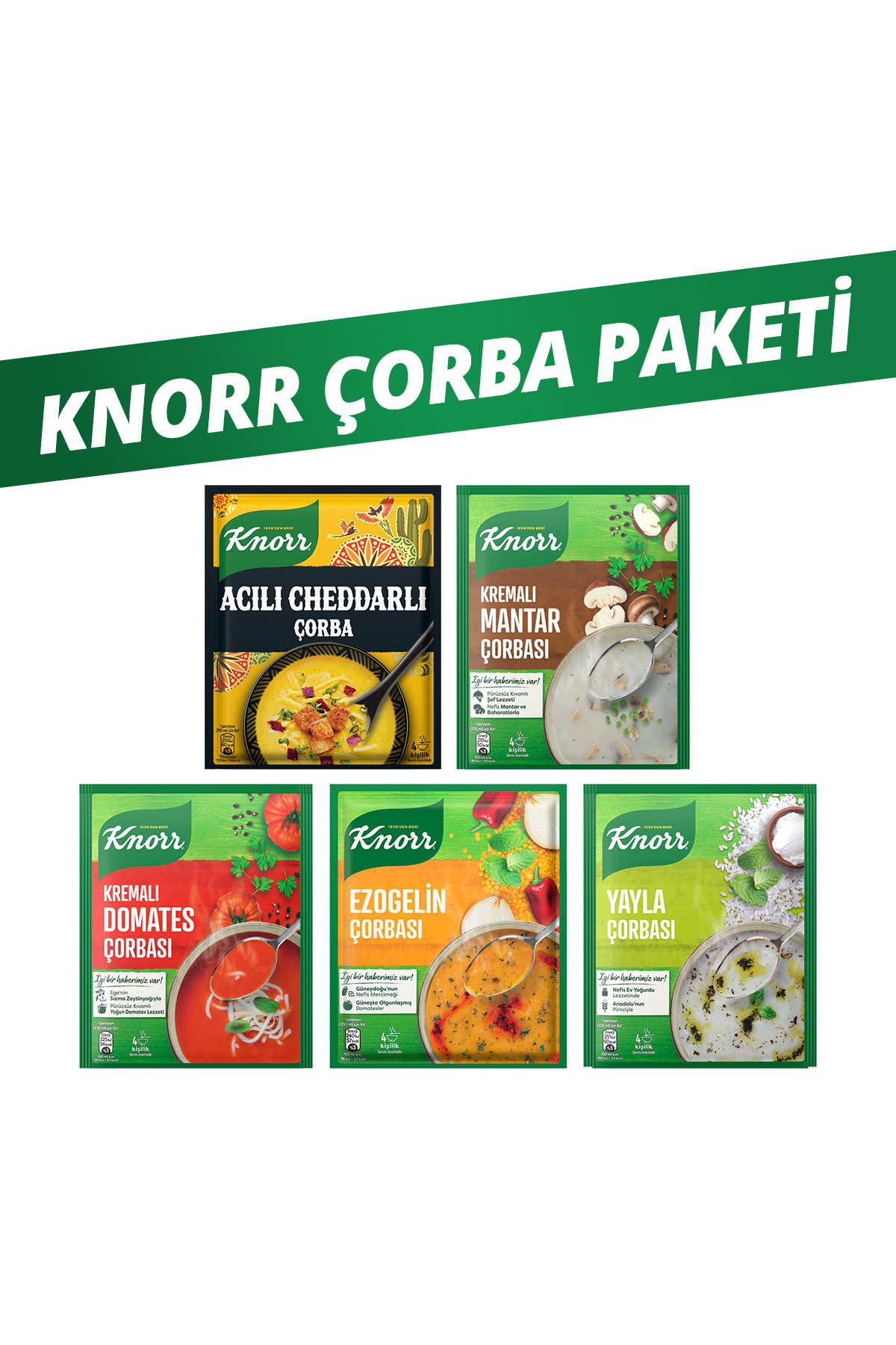 Knorr Acili Cheddar Çorba 74g x1 Adet Knorr Ezogelin Çorbasi 74g x1 Adet Knorr Kremali Domates Çorbasi 69g x1 Adet Knorr Yayla Çorbasi 72g x1 Adet Knorr Kremali Mantar Çorbasi 63g x1 Adet